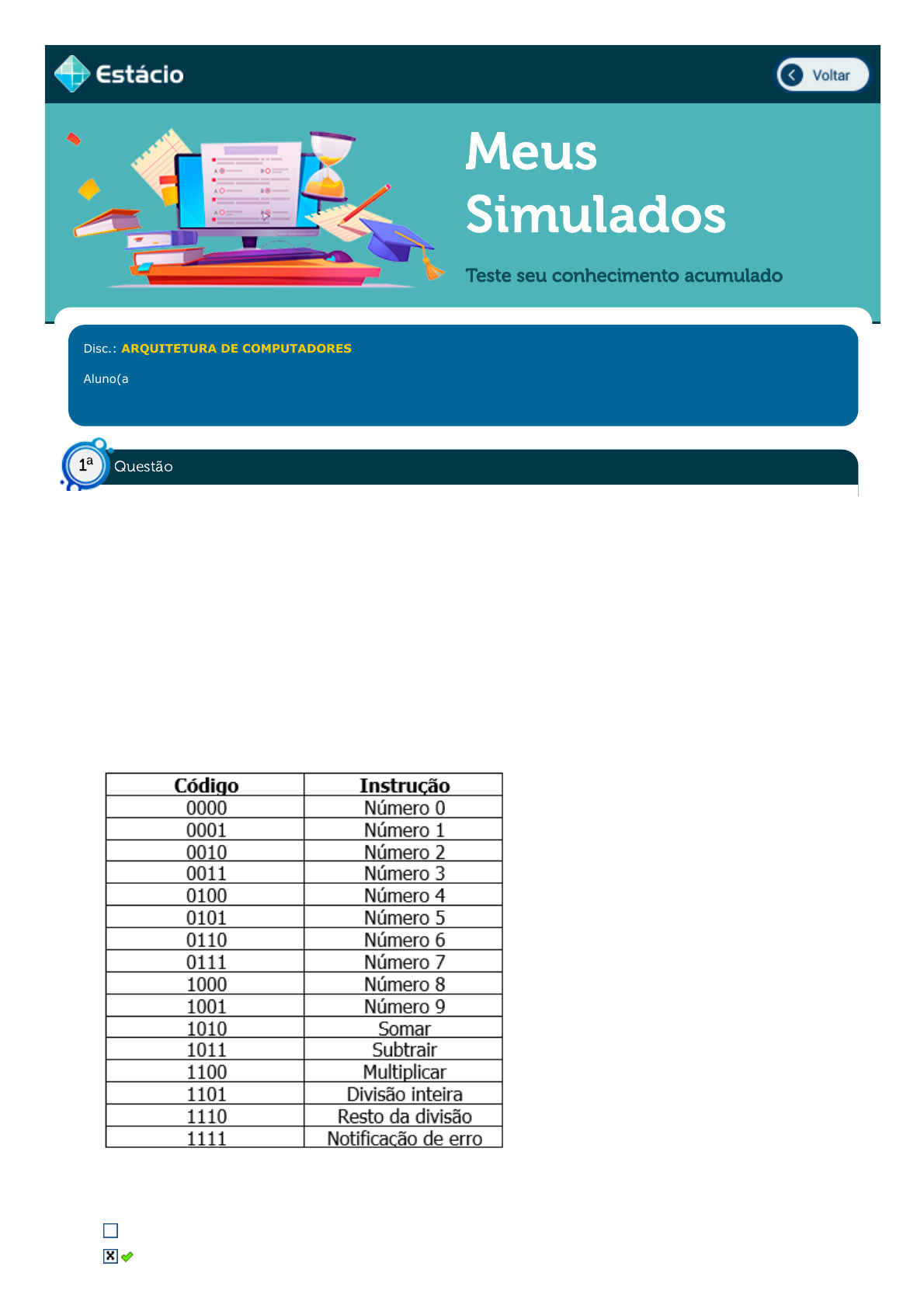 29/08/2022 21:49 Estácio: Alunos https://simulado.estacio.br/alunos/ 1/6 Meus Simulados Teste seu conhecimento acumulado Disc.: ARQUITETURA DE COMPUTADORES Aluno(a): JOÃO MARCELO GOMES DE OLIVEIRA 202208356028 Acertos: 10,0 de 10,0 29/08/2022 Acerto: 1,0 / 1,0 Suponha que, para efeitos de aprendizagem em arquitetura de computadores (ignorando vários detalhes de implementação), você decidiu criar uma representação de conjunto de instruções hipotético muito simples e limitado para operações aritméticas de inteiros positivos com dois operandos, de um processador de 4 bits, cuja palavra de dados é de 4 bits. É gasto 1 ciclo de instrução para cada palavra, e a quantidade de ciclos para execução de uma determinada instrução (operadores e operandos) é igual à quantidade de palavras dessa instrução. O conjunto de instruções está representado a seguir: Caso seja desejável realizar o cálculo de 6 + 3, qual será o formato de instrução recebido? 1001 1101 0001 Questão1a https://simulado.estacio.br/alunos/inicio.asp javascript:voltar(); 29/08/2022 21:49 Estácio: Alunos https://simulado.estacio.br/alunos/ 2/6 1010 0110 0011 1010 0110 0110 0100 1010 0010 0110 1010 0011 Respondido em 29/08/2022 21:28:56 Explicação: A resposta correta é: 1010 0110 0011 Acerto: 1,0 / 1,0 Suponha que, para efeitos de aprendizagem em arquitetura de computadores (ignorando vários detalhes de implementação), você decidiu criar uma representação de conjunto de instruções hipotético muito simples e limitado para operações aritméticas de inteiros positivos com dois operandos, de um processador de 4 bits, cuja palavra de dados é de 4 bits. É gasto 1 ciclo de instrução para cada palavra, e a quantidade de ciclos para execução de uma determinada instrução (operadores e operandos) é igual à quantidade de palavras dessa instrução. O conjunto de instruções está representado a seguir: Como é a representação em hexadecimal da instrução 1011 1001 1000? C B A B A 9 9 B 8 B 9 8 9 8 7 Respondido em 29/08/2022 21:35:50 Questão2a 29/08/2022 21:49 Estácio: Alunos https://simulado.estacio.br/alunos/ 3/6 Explicação: A resposta correta é: B 9 8 Acerto: 1,0 / 1,0 Uma determinada porta lógica possui duas entradas, X e Y. Quando X e Y são 0 a saída é 0. Quando X e Y são 1 a saída também é 0. Qual é a porta lógica que possui esta tabela verdade? NOR XOR OR NAND AND Respondido em 29/08/2022 21:30:15 Explicação: A resposta correta é: XOR A B XOR 0 0 0 0 1 1 1 0 1 1 1 0 Acerto: 1,0 / 1,0 Assinale a alternativa que apresenta a sequência correta da saída (S) para a expressão lógica S = AB + C, quando os valores de entrada são: A = 010, B 110 e C=001. S = 011 S = 101 S = 100 S = 010 S = 110 Respondido em 29/08/2022 21:31:04 Explicação: A resposta correta é: S = 011 AB+C: (0 and 1 or 0) = 0 (1 and 1 or 0) = 1 (0 and 0 or 1) = 1 Questão3a Questão4a 29/08/2022 21:49 Estácio: Alunos https://simulado.estacio.br/alunos/ 4/6 Acerto: 1,0 / 1,0 Em relação à classificação das arquiteturas paralelas definida como Taxonomia de Flynn, em uma delas é tratada a execução síncrona de instrução para todos os dados, correspondendo ao caso das arquiteturas vetoriais. A afirmação acima está relacionada a qual das classes definidas por Flynn? MIMD MISD SIMD SISD DISM Respondido em 29/08/2022 21:34:03 Explicação: A resposta correta é: SIMD Acerto: 1,0 / 1,0 No contexto de arquitetura e organização de computadores, todo processador é construído de modo a ser capaz de realizar instruções básicas como somar, multiplicar, subtrair ou dividir números. Em relação à arquitetura CISC, selecione a afirmação correta dentre as seguintes: O endereçamento múltiplo traz flexibilidade, permitindo operações diretamente em operandos na memória principal, além dos presentes nos registradores. Um processador CISC possui uma unidade de controle leve e rápida, permitindo um rápido fluxo de dados através do pipeline. As características de processadores CISC, como a grande quantidade de registradores, faz com que esses processadores sejam ideais para smartphones e equipamentos similares. A grande quantidade de instruções facilita o processo de decodificação pela unidade de controle. Uma das principais vantagens da abordagem CISC é a intensa operação nos registradores, acelerando a execução das instruções. Respondido em 29/08/2022 21:34:37 Explicação: A resposta correta é: O endereçamento múltiplo traz flexibilidade, permitindo operações diretamente em operandos na memória principal, além dos presentes nos registradores. Os processadores CISC são mais complexos e possuem características marcantes, por exemplo, conjunto de muitas instruções e múltiplos tipos de endereçamento. Acerto: 1,0 / 1,0 Considere as seguintes especificações de dois componentes: I. Velocidade de 4,2 Ghz; 4 núcleos; 6 MB Smart Cache. II. Velocidade de 2133 MHz; capacidade de 16GB; voltagem 1,2V. As especificações I e II são relativas a, respectivamente: Memória RAM e placa de vídeo. Questão5a Questão6a Questão7a 29/08/2022 21:49 Estácio: Alunos https://simulado.estacio.br/alunos/ 5/6 Memória RAM e HD. Processador e HD. Placa de vídeo e memória RAM. Processador e memória RAM. Respondido em 29/08/2022 21:35:16 Explicação: A resposta correta é: Processador e memória RAM. O número de núcleos é tipicamente utilizado quando nos referimos ao processador. Atualmente, a maioria dos processadores de mercado utiliza ao menos quatro núcleos. Quando nos referimos a capacidade de 16GB estamos falando da memória RAM disponível. Acerto: 1,0 / 1,0 Em 2019, os Sistemas Operacionais para dispositivos móveis (mobileOS) já respondiam por mais de 50% do market share dos Sistemas Operacionais. Qual das funcionalidades a seguir é responsabilidade do mobileOS de um celular? I. Mostrar notificações. II. Calcular rotas. III. Mostrar a carga restante da bateria. IV.