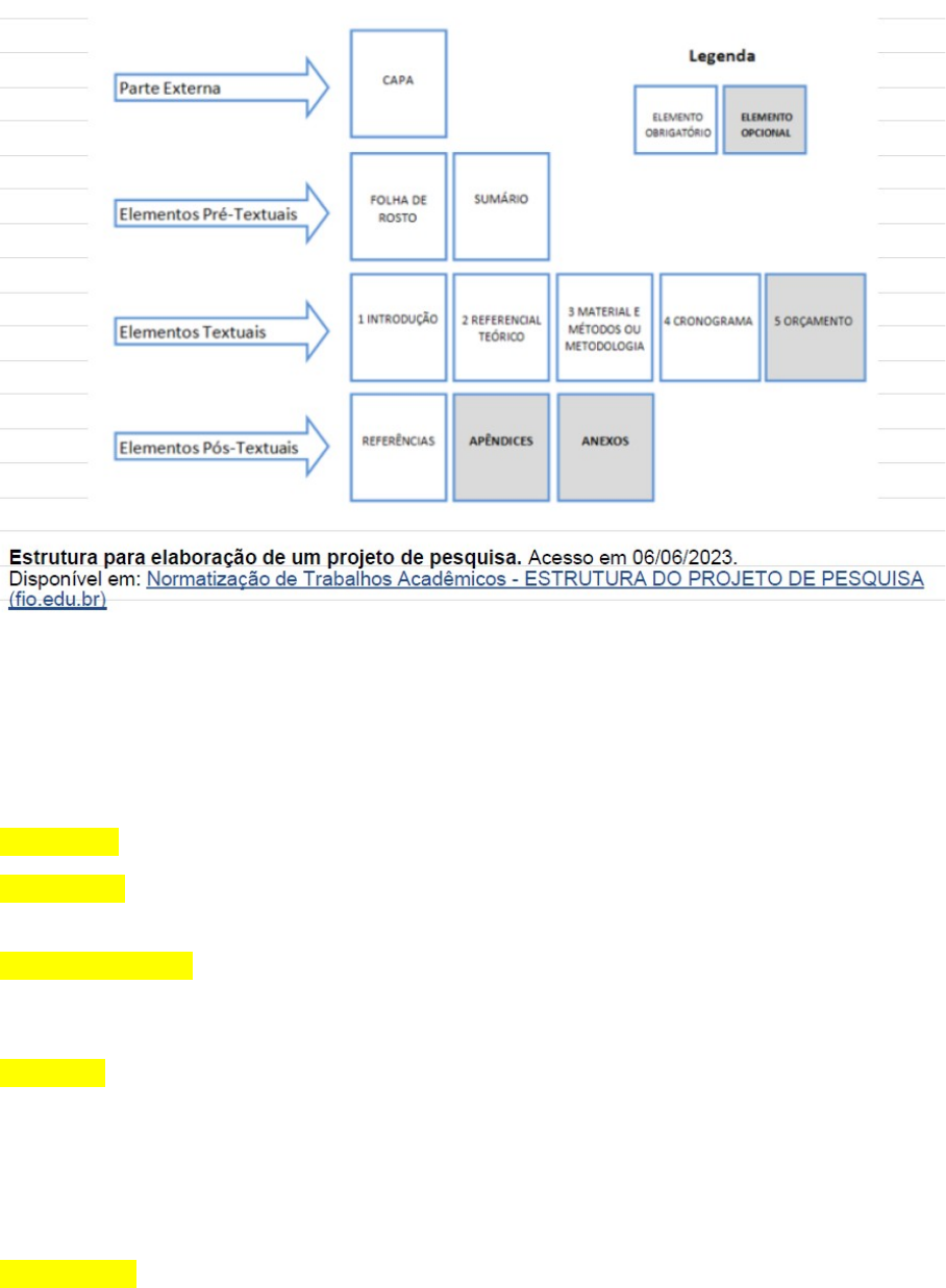 PROJETO DE PESQUISA: CONSTITUIÇÃO O projeto de pesquisa deve conter obrigatoriamente os seguintes itens: • Introdução (Apresentação do tema e do problema.) • Justificativa (Texto no qual se articulam os argumentos, de forma a demonstrar a relevância do tema, ou seja, o porquê você está pesquisando isso.) • Referencial teórico (Destina-se a apresentar as leituras e fundamentos teóricos que embasam a proposta da pesquisa, ou seja, quem já escreveu e estudou sobre o tema que você está pesquisando e o que dizem a respeito.) • Objetivos a) Objetivo geral (Apresentam-se, de forma global, os objetivos pretendidos na pesquisa.) b) Objetivos específicos (Corresponde aos desdobramentos do objetivo geral, de forma a traduzir, em suas diferentes especificidades, o que se pretende alcançar, como se fosse um passo a passo para atingir o objetivo geral.) • Metodologia (Descreve-se os caminhos metodológicos previstos e as técnicas a serem utilizadas, ou seja, COMO será realizada essa pesquisa.) • Bibliografia (Referencia-se o material utilizado para o projeto e/ou da pesquisa, de acordo com as Normas da ABNT. Aqui são citados os autores e as obras consultadas para a escrita do seu trabalho.) • Cronograma (Destina-se a traduzir as ações a serem realizadas, distribuindo-as no espaço de tempo disponível para a realização do projeto. É uma espécie de planejamento.) image1.png