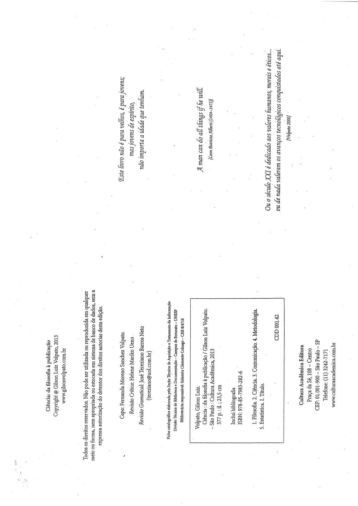 Ciência: da filosofia à publicação Copyright @ Gilson Luiz Volpato, 2013 www.gilsonvolpato.com.br Todos direitos reservados. Não pode ser utilizada ou reproduzida em qualquer meio ou forma, nem apropriada ou estocada em sistema de banco de dados, sem a expressa autorização do detentor dos direitos autorias desta edição. Capa: Fernanda Moreno Sanchez Volpato. Este livro não é para velhos, é para jovens; Revisão Crítica: Helene Mariko Ueno mas jovens de espírito, Revisão Gramatical: José Tereziano Barros Neto não importa a idade que tenham. (tereziano@uol.com.br) Ficha catalográfica elaborada pela Seção Técnica de Aquisição e Tratamento da Informação Divisão Técnica de Biblioteca e Documentação Campus de Botucatu UNESP Bibliotecária responsável: Sulamita Clemente Colnago CRB 8/4716 Volpato, Gilson Luiz. A man can do all things if he will. Ciência : da filosofia à publicação / Gilson Luiz Volpato. São Paulo : Cultura Acadêmica, 2013 [Leon Battista Alberti (1404-1472)] 377 p. il. ; 23,5 cm Inclui bibliografia ISBN: 978-85-7983-282-6 1. Filosofia. 2. Ciência. 3. Comunicação. 4. Metodologia. 5. Estatística. I. Título. Ou o século XXI é dedicado aos valores humanos, morais e éticos... CDD 001.42 ou de nada valeram os avanços tecnológicos conquistados até aqui. [Volpato 2000] Cultura Acadêmica Editora Praça da Sé, 108 Centro CEP: 01.001-900 São Paulo SP Telefone: (11) 3242-7171 www.culturaacademica.com.br74 Gilson Volpato Alves R. 2008. Ostra feliz não faz pérola. Editora Planeta. Alves R. 2012. Pimentas: para provocar um incêndio não é preciso fogo. Editora Planeta. Barbosa C. 2011. A tríade do tempo. Sextante. Barbosa RLL (org.). 2004. Trajetórias e perspectivas da formação de educadores. Editora Unesp. Brockman J, Matson K (eds.). 2002. As coisas são assim: pequeno repertório científico das coisas que nos cercam. Companhia das Letras. Buarque C. 2000. A aventura da universidade. Editora Unesp. Gardner H (org.). 2009. Responsabilidade no trabalho. Editora Bookman. CAPÍTULO II Gleiser M. 2007. Cartas a um jovem cientista. Editora Campus. Gordon K. 2010. Líderes que mudaram 0 mundo. Larousse do Brasil. Harvard Business 2002. Empreendedorismo e estratégia. Editora Campus. Ciência Hunter JC. 2004. monge e 0 executivo; uma história sobre a essência da liderança. Editora Sextante. Keough DR. 2010. 10 mandamentos para fracassar nos negócios. Editora Sextante. Kida T. 2007. Não acredite em tudo que você pensa; 6 erros básicos que cometemos quando pensamos. Editora Campus. Oliveira S. 2010. Geração Y: 0 nascimento de uma nova versão de líderes. Integrare Editora. II-1 0 que é ciência? Penteado W. 2007. Cartas a um jovem indeciso: que profissão escolher? Editora Campus. Popper KR. 2006. Em busca de um mundo melhor. Editora Martins Fontes. A ciência é uma das formas de o homem abordar universo. Portanto, para uma Semler R. 2006. Você está louco: uma vida administrada de outra forma. Editora Rocco. melhor compreensão do seu significado, é necessário conhecermos as demais formas exis- tentes e como elas se relacionam entre si. Sertek P. 2007. Empreendedorismo. ed. Ipbex. Spencer J. 2002. Quem техеи no meu queijo? ed. Editora Record. Considero cinco formas pelas quais o ser humano aborda 0 universo: ciência, filo- sofia, religião, arte e loucura. Suas principais características são mostradas na Tabela 1 e Volpato GL. 2007. Bases teóricas para redação científica. Editora Cultura Acadêmica, Editora Scripta. explicadas em seguida. Volpato GL. 2009. Administração da vida científica. Editora Cultura Acadêmica. Watts DJ. 2011. Tudo é óbvio: desde que você saiba a resposta. Editora Paz e Terra.76 Gilson Volpato Ciência: da à publicação 77 Tabela 1. Características das formas de abordagem do universo. concreto e observável. Assim, na ciência são aceitos apenas os enunciados teóricos que podem ser Principais Formas de Abordagem sustentados empiricamente. Mesmo que o objeto de estudo não seja, de fato, observável, a postura do Características Ciência Filosofia Religião Arte Loucura cientista é a de buscar elementos para a confrontação dos enunciados com fatos concretos do mundo Explicativo + + + ? que observa. Ao estudar, por exemplo, a origem dos seres vivos (que jamais poderá ser vista), cientista Lógico + + + ? busca sustentação em elementos observáveis, mesmo que indiretos, como a reconstrução do cenário Provisório primitivo, a produção laboratorial de DNA a partir de elementos mais simples etc. É essa abordagem + + ? uma das características marcantes da ciência. É por isso que nos textos científicos há um capítulo deno- Empírico + ? minado "Resultados" (parte da base empírica) e outro "Material e (veja Volpato 2007). É Estético + ? evidente que o cientista racionaliza sobre fatos, mas sempre havendo fatos. +: presença; não necessário ou não procede; ?: não se sabe Outras duas características da abordagem científica são: uso do discurso lógico e reconheci- mento de que conhecimento é provisório. Porém, nem sempre a ciência reconheceu sua incapacidade de identificar a verdade (veja Parte 1 e II-8), sendo essa postura adotada mais sistematicamente a partir Na história do conhecimento humano, duas visões são comumente apresentadas, ou contras- do século XX e, assim mesmo, por poucos cientistas, apesar da evolução do conhecimento nessa área tadas: a racional, pela qual 0 conhecimento é construído a partir de nossa razão, sem necessidade de (veja séc. XVII e XVIII na Parte 1 deste livro). Tal fato deve-se provavelmente ao distanciamento que se confrontar com fatos da natureza; e a empírica, que admite a necessidade de se ter algum indício do mundo natural para se construir conhecimento muitos cientistas mais práticos mantêm em relação à reflexão filosófica. A filosofia também admite a incapacidade do ser humano para ter consciência de v