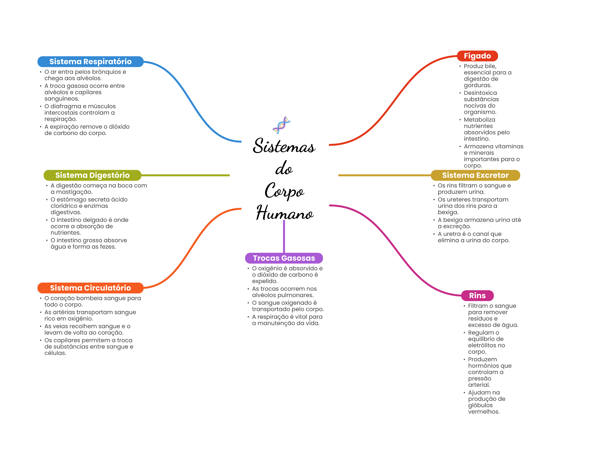 Fígado Sistema Respiratório Produz or entra pelos brônquios essencial para a chega digestão de A troca gasosa ocorre entre gorduras. substâncias . músculos nocivas do controlam a organismo. respiração. A expiração remove dióxido nutrientes de carbono do corpo. absorvidos pelo Intestino. vitaminas importantes para corpo. Sistema Digestório Sistema Excretor A digestão começa na boca com rine filtram mastigação. produzem urina. secreta ácido Os transportam urina dos rins para a delgado é onde A urina até a de a excreção. nutrientes. A uretra é o canal que grosso absorve elimina a urina do corpo. água e forma Trocas Gasosas absorvido de carbono é Sistema Circulatório As nos coração bombela sangue para pulmonares. Rins todo o corpo. oxigenado é As sangue transportado pelo corpo. sangue para remover rico em A respiração vital para As recolhem sangue a manutenção da de água. levam de volta coração. Regulam Os capilares permitem a troca equilibrio de de substâncias entre sangue no corpo. Produzem que a preseão arterial. Ajudam na produção de glóbulos vermelhos.
