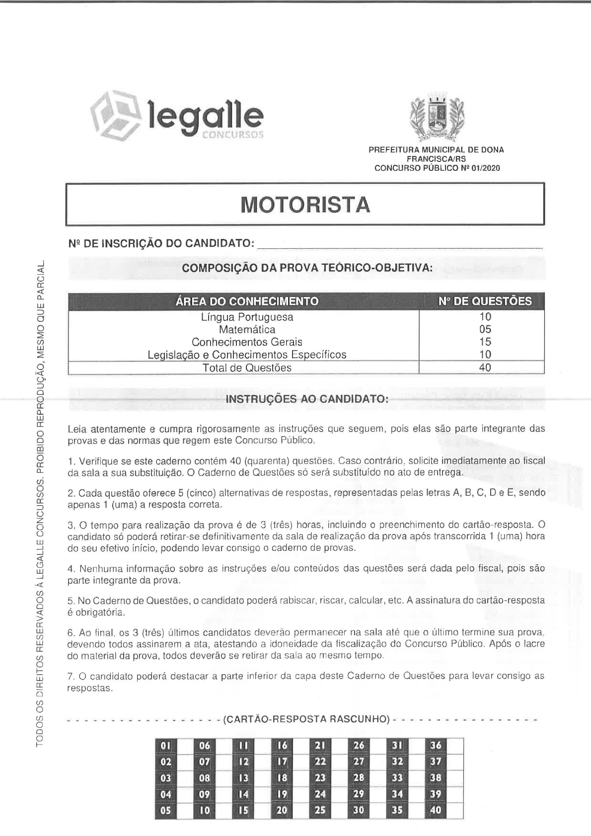 T O D O S OS D I R E I T O S R E S E R V A D O S À L E G A L L E C O N C U R S O S . P R O I B I D O R E P R O D U Ç Ã O , M E S M O Q U E PA RC IA L. do É legalle gs PREFEITURA MUNICIPAL DE DONA FRANCISCA/RS CONCURSO PUBLICO Nº 01/2020 MOTORISTA Nº DE INSCRIÇÃO DO CANDIDATO: COMPOSIÇÃO DA PROVA TEÓRICO-OBJETIVA: ÁREA DO CONHECIMENTO Nº DE QUESTÕES Língua Portuguesa 10 Matemática 05 Conhecimentos Gerais 15 Legislação e Conhecimentos Específicos 10 Total de Questões 40 INSTRUÇÕES AO CANDIDATO: Leia atentamente e cumpra rigorosamente as instruções que seguem, pois elas são parte integrante das provas e das normas que regem este Concurso Público. 1. Verifique se este caderno contém 40 (quarenta) questões. Caso contrário, solicite imediatamente ao fiscal da sala a sua substituição. O Caderno de Questões só será substituído no ato de entrega. 2. Cada questão oferece 5 (cinco) alternativas de respostas, representadas pelas letras A, B, C, De E, sendo apenas 1 (uma) a resposta correta. 3. O tempo para realização da prova é de 3 (três) horas, incluindo o preenchimento do cartão-resposta. O candidato só poderá retirar-se definitivamente da sala de realização da prova após transcorrida 1 (uma) hora do seu efetivo início, podendo levar consigo o caderno de provas. 4. Nenhuma informação sobre as instruções e/ou conteúdos das questões será dada pelo fiscal, pois são parte integrante da prova. 5. No Caderno de Questões, o candidato poderá rabiscar, riscar, calcular, etc. A assinatura do cartão-resposta é obrigatória, 6. Ao final, os 3 (três) últimos candidatos deverão permanecer na sala até que o último termine sua prova, devendo todos assinarem a ata, atestando a idoneidade da fiscalização do Concurso Público. Após o lacre do material da prova, todos deverão se retirar da sala ao mesmo tempo. 7. O candidato poderá destacar a parte inferior da capa deste Caderno de Questões para levar consigo as respostas. 26 Io E 27 a E a [EX RE 1 E LÍNGUA PORTUGUESA Para responder às questões de 01 a 08, leia o texto abaixo. Vidas Secas Fabiano ia satisfeito. Sim senhor, arrumara-se. Chegara naquele estado, com a família morrendo de fome, comendo raizes. Caíra no fim do pátio, debaixo de um juazeiro, depois tomara conta da casa deserta. Ele, a mulher e os filhos tinham-se habituado à camarinha escura, pareciam ratos — a lembrança dos sofrimentos passados esmorecera. Pisou com firmeza no chão gretado, puxou a faca de ponta, esgaravatou as unhas sujas. Tirou do aió um 10 pedaço de fumo, picou-o, fez um cigarro com a palha 11 do milho, acendeu-o ao binga, pôs-se a fumar 12 regalado. S o T N S D A R U N 13 Fabiano, você é um homem, exclamou em voz 14 alta. 15 Conteve-se, notou que os meninos estavam por 16 perto, com certeza iam admirar-se ouvindo-o falar só. 17 E, pensando bem, ele não era homem: era apenas um 18 cabra ocupado em guardar coisas dos outros. 19 Vermelho, queimado, tinha os olhos azuis, a barba e 20 os cabelos ruivos; mas como vivia em terra alheia, 21 cuidava de animais alheios, descobria-se, encolhia-se 22 na presença dos brancos e julgava-se cabra. 23 Olhou em torno, com receio de que, fora os 24 meninos, alguém tivesse percebido a frase 25 imprudente. Corrigiu-a, murmurando: 26 - Você é um bicho, Fabiano. 27 Isto para ele era motivo de orgulho. Sim senhor, 28 um bicho, capaz de vencer dificuldades. 29 Chegara naquela situação medonha — e ali 30 estava, forte, até gordo, fumando o seu cigarro de 31 palha. 32 Era. Apossara-se da casa porque não tinha onde 33 cair morto, passara uns dias mastigando raiz de imbu 34 e semente de mucunã. Viera a trovoada. E, com ela, o 35 fazendeiro, que o expulsara. Fabiano fizera-se de 36 desentendido e oferecera os seus préstimos, 37 resmungando, coçando os cotovelos, sorrindo aflito. O 38 jeito que tinha era ficar. E o patrão aceitara-o, 39 entregara-lhe as marcas de ferro. 40 Agora Fabiano era vaqueiro, e ninguém o tiraria 41 dali. Aparecera como um bicho, entocara-se como um 42 bicho, mas criara raizes, estava plantado. Olhou as 43 quipás, os mandacarus e os xiquexiques. Era mais 44 forte que tudo isso, era como as catingueiras e as 45 baraúnas. Ele, sinhá Vitória, os dois filhos e a cachorra 46 Baleia estavam agarrados à terra. 47 Chape-Chape. As alpercatas batiam no chão 48 rachado. O corpo do Vaqueiro derreava-se, as pernas 49 faziam dois arcos, braços moviam-se desengonçados. 50 Parecia um macaco. 51 Entristeceu. Considerar-se plantado em terra 52 alheia! Engano, A sina dele era correr o mundo, andar 53 para cima e para baixo, à toa, como judeu errante. Um 54 vagabundo empurrado pela seca. Achava-se ali de 55 passagem, era hóspede. Sim senhor, hóspede que 56 demorava demais, tomava amizade à casa, ao curral, 57 ao chiqueiro das cabras, ao juazeiro que os tinha 58 abrigado uma noite. Autor: Graciliano Ramos (adaptado). Questão 01. O vocábulo satisfeito (/1) poderia ser substituído, sem qualquer alteração de sentido, por: (A) Dissaboroso. (B) Saturado. (C) Aborrecido. (D) Contente. (E) Inconformado. Questão 02. Acerca da acentuação gráfica das palavras, é CORRETO afirmar que raízes (/!. 3) é acentuada pelo mesmo motivo de: (A) família (1.2). (B) Caira (1.3). (C) hóspede (/.55). (D) alguém (1.24). (E) quipás (1,43). Questão 03. Quanto ao número de fonemas dos vocábulos, pode-se afirmar que as palavras fim (/.3), voz (1.13) e ferro (1.39) apresentam, respectivamente: (A) 3 fonemas; 5 fonemas; 5 fonemas. B) 3 fonemas, 4 fonemas; 4 fonemas. C) 2 fonemas; 3 fonemas; 4 fonemas. D) 2 fonemas; 2 fonemas; 3 fonemas. E) 1 fonema; 3 fonemas; 2 fonemas. ( ( ( ( Questão 04. Assinale a alternativa que apresenta uma palavra composta por um digrafo consonantal. Sim (!. 1). firmeza (1.8). cigarro (/. 10). brancos (!.22). mais (/43). Questão 05. Com relação às classes gramaticais de vocábulos do texto, analise as assertivas. |. mas (1.20) é um
