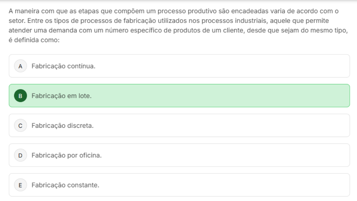 A maneira com que as etapas que compõem um processo produtivo são encadeadas varia de acordo com setor. Entre tipos de processos de fabricação utilizados nos processos industriais, aquele que permite atender uma demanda com um número específico de produtos de um cliente, desde que sejam do mesmo tipo, é definida como: A Fabricação contínua. Fabricação em lote. Fabricação discreta. D Fabricação por oficina. E Fabricação constante.Em algumas situações (datas comemorativas e ocasiões especiais) lotes de produtos são personalizados e áreas inteiras das linhas de produção são modificadas para atender a essa demanda. A esse tipo de fabricação denomina-se: A Fabricação contínua. Fabricação em lote. Fabricação discreta. D Fabricação constante. E Fabricação por oficina.processamento industrial da matéria-prima dividido em etapas surgiu com conceito de indústria moderna. A etapa das fases de produção responsável pelo processamento inicial onde, por exemplo, pode ser realizada a combinação de diferentes materiais, de maneira a produzir ligas com material original é definida como: A Fabricação do produto. Condicionamento da matéria-prima. Conversão da matéria-prima. D Transformação da matéria-prima. E Manipulação da matéria-prima.Na indústria 4.0, uma das características mais importantes é a descentralização de serviços de computação através da internet. A essa tecnologia denomina-se: A Internet das coisas. Inteligência artificial. C Segurança cibernética. D Robótica avançada. E Computação na nuvem.A confecção de peças de maneira rápida com 0 uso de impressoras 3D contribuiu para um avanço significativo nos processos industriais, na medida em que a construção, adaptação e manutenção de equipamentos se tornou mais simples e dinâmico. A esse avanço tecnológico denomina-se: A Manufatura digital. Integração de sistemas. c Manufatura aditiva. D Machine learning. E Big data.Tratamentos físicos ou químicos podem ser realizados no material de maneira a dar a ele propriedades diferentes da matéria bruta original (flexibilidade, resistência à corrosão, entre outras). A essa etapa denomina- se: A Fabricação do produto. Condicionamento da matéria-prima. Conversão da matéria-prima. D Manipulação da matéria-prima. E Transformação da matéria-prima.controle de qualidade é fundamental para um processo produtivo bem-sucedido. A falta de controle de qualidade pode levar a desperdícios de matéria-prima, tempo e energia. Em alguns casos, pode ocorrer a devolução de um lote inteiro do produto por problemas com a produção, sendo definida como: A Consistência na produção. Manutenção. C Insatisfação do cliente. D Recall. E Reconhecimento da empresa.Em alguns casos, principalmente na fabricação de produtos de grande porte, a linha de produção deve ser capaz de produzir apenas um único produto por vez com características bem específicas. A esse tipo de processo de fabricação nomeia-se: A Fabricação constante. Fabricação por oficina. Fabricação discreta. D Fabricação em lote. E Fabricação contínua.A indústria 4.0 trouxe inúmeros benefícios ao processo industrial, sendo vista como a Quarta Revolução Industrial. Observando-se benefícios, pode-se dizer que a automatização dos processos com a capacidade de reduzir problemas nos ciclos de produção e favorecer processos industriais possibilita: A Redução nos erros. Um aumento na eficiência. trabalho remoto. D Aumento na segurança. E Redução de desperdício.Os objetivos da contabilidade de custos são diversificados, passando pela avaliação de inventários de matérias-primas até a verificação de resultados. De acordo com a classificação dos gastos, a avaliação dos gastos de compras de bens que poderão trazer benefícios futuros é definida como: A custos. despesas. perdas. D investimentos. E desperdícios.processamento industrial da matéria-prima dividido em etapas surgiu com o conceito de indústria moderna. Considerando as fases de um processo industrial, aquela responsável pelo primeiro contato com a matéria- prima e que é responsável pelo seu recebimento e adequado armazenamento é definida como: A Condicionamento da matéria-prima. Transformação da matéria-prima. Conversão da matéria-prima. D Manipulação da matéria-prima. E Fabricação do produto.Alguns diagramas permitem conhecer e classificar possíveis causas de problemas na medida em que relacionam diversos efeitos aos fatores responsáveis pelo seu acontecimento. A essa ferramenta dá-se nome de: A Histograma. Fluxograma. Diagrama de Pareto. D Diagrama de causa e efeito. E Folha de verificação.Também cabe à contabilidade avaliar gastos anormais que não produzem bens e/ou serviços e ajudar a identificá-los e eliminá-los. A esses gastos pode-se denominar: A Desperdícios. Perdas. C Investimentos. D Custos. E Despesas.Entender propósito da empresa pode auxiliar significativamente na melhoria de sua produtividade na medida em que auxilia na identificação de problemas e em como evitá-los. A esse recurso dá-se nome de: A Planejamento estratégico. Internet das Coisas. C Controle de produtividade. D Controle de qualidade. E Controle de quantidade.A implementação da indústria 4.0 no Brasil está em processo gradativo e contínuo, já podendo ser observado em diversas empresas. Para uma implementação mais forte serão necessárias algumas mudanças, entre elas pode-se citar: A Redução da atuação dos agentes econômicos. Reduzir a competitividade entre sistemas produtivos. Diminuição dos altos investimentos. D Criação de novos cursos de capacitação. E Valorização das vantagens comparativas superficiais.Alguns robôs combinam mais de uma estrutura de movimento para seu deslocamento. Seja pela condição do terreno ou por questões de facilidade para a realização de manobras, esses robôs associam estruturas de movimento e to