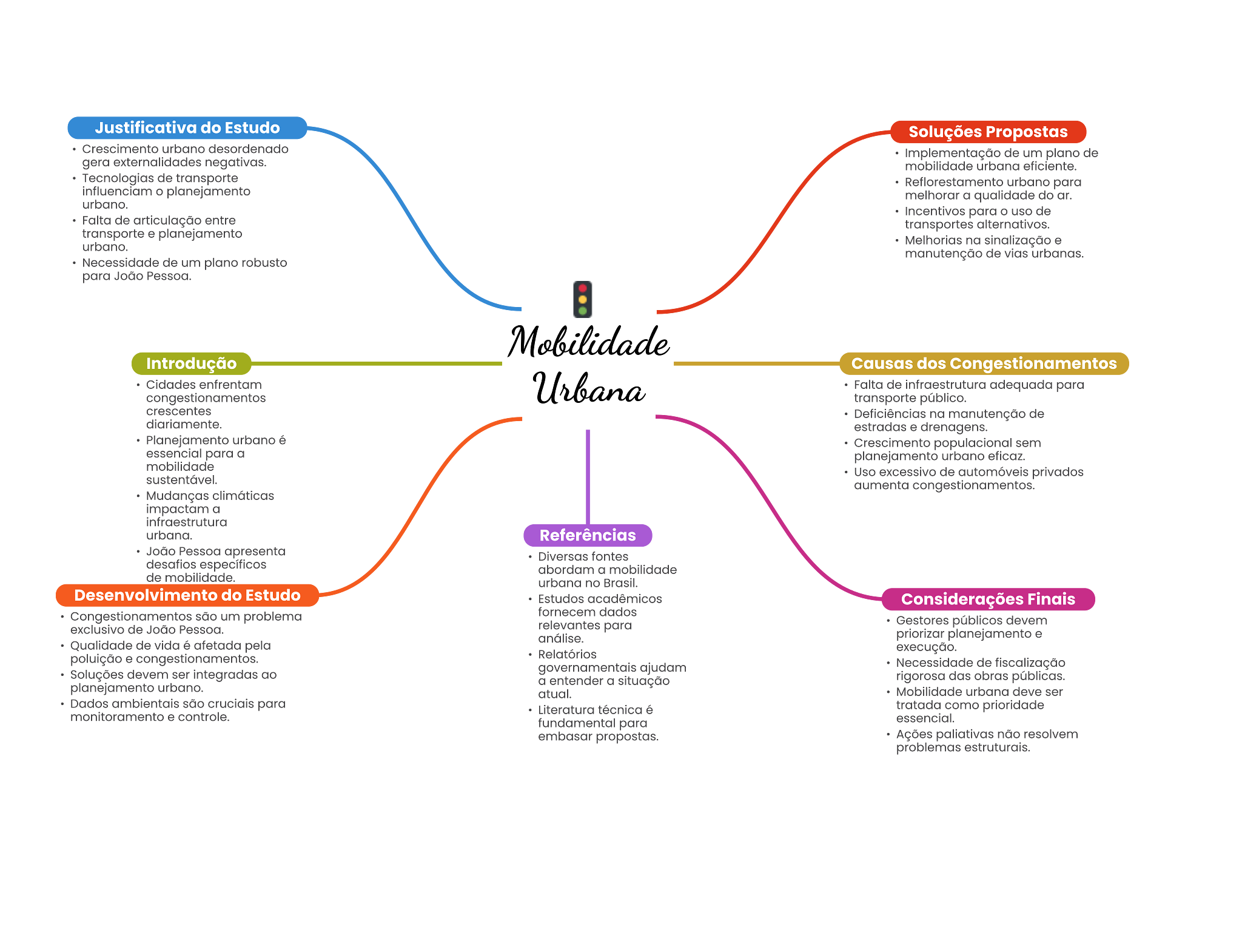 Justificativa do Estudo Soluções Propostas Crescimento urbano desordenado de um de gera externalidades mobilidade urbana eficiente. Tecnologias de transporte Reflorestamento urbano para influenciam o melhorar a qualidade do or. urbano. para uso de Falta de articulação entre transportes alternativos. transporte urbano. na manutenção de Necessidade de um plano robusto para Pessoa. Introdução Causas dos Congestionamentos enfrentam Falta de adequada para congestionamentos transporte público. crescentes Deficiências na manutenção de drenagens. urbano Crescimento populacional sem essencial para a urbano mobilidade excessivo de privados aumenta congestionamentos. climáticas a urbana. Referências João Pessoa fontes específicos abordam a mobilidade de mobilidade. urbana no Desenvolvimento do Estudo Estudos acadêmicos Considerações Finais Congestionamentos um problema fornecem dados exclusivo de Pessoa. para Gestores públicos devern Qualidade de vida é afetada pela priorizar planejamento . congestionamentos. Relatórios execução. ajudam Necessidade de fiscalização devem ser a entender a rigorosa das públicas. planejamento urbano. atual. Mobilidade urbana deve ser Dados são para Literatura técnica tratada como prioridade monitoramento controle. fundamental para essencial. propostas. Ações paliativas não resolvem problemas