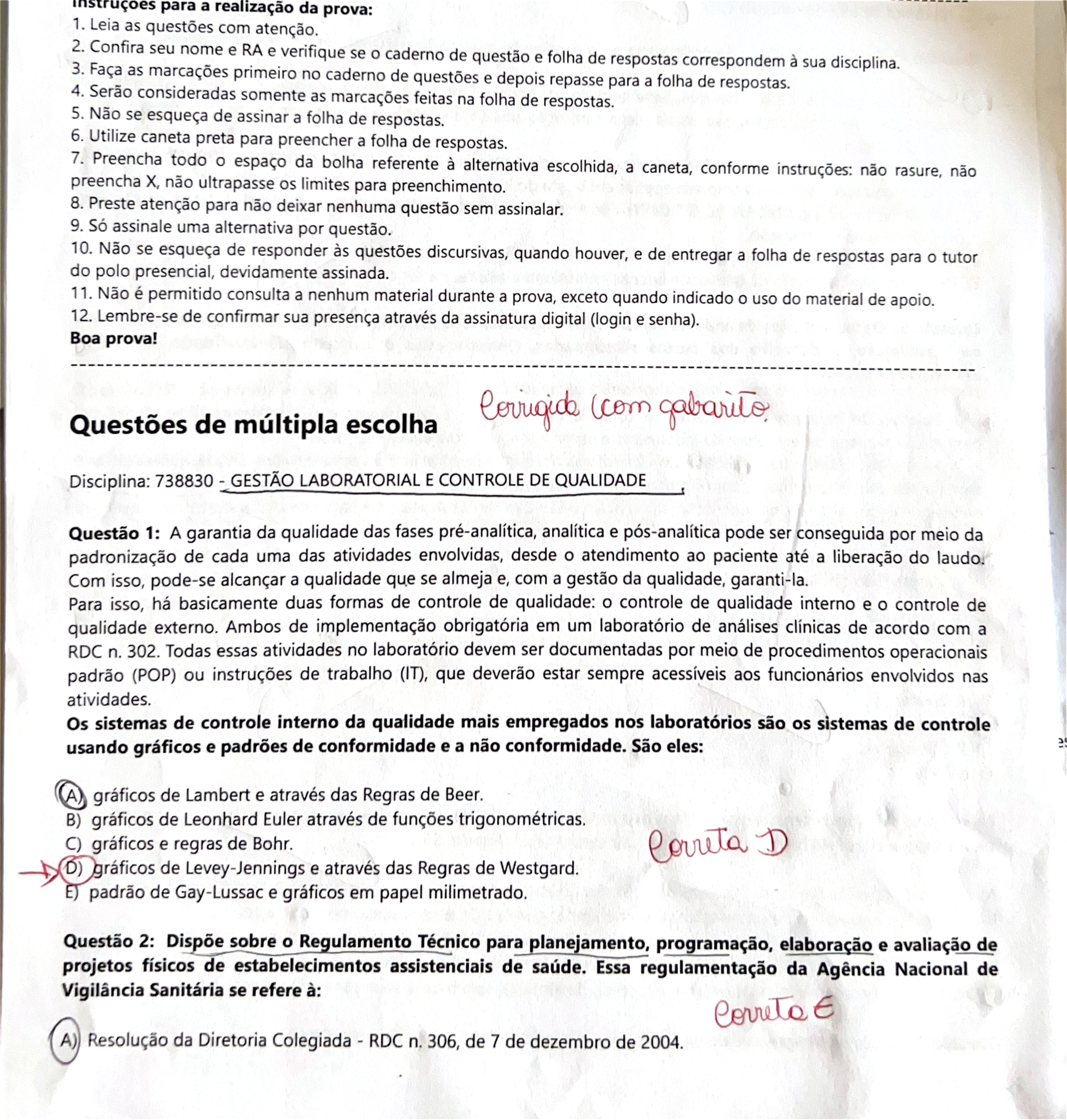 para a realização da prova: 1. Leia as questões com atenção. 2. Confira seu nome e RA e verifique se o caderno de questão e folha de respostas correspondem à sua disciplina. 3. Faça as marcações primeiro no caderno de questões e depois repasse para a folha de respostas. 4. Serão consideradas somente as marcações feitas na folha de respostas. 5. Não se esqueça de assinar a folha de respostas. 6. Utilize caneta preta para preencher a folha de respostas. 7. Preencha todo espaço da bolha referente à alternativa escolhida, a caneta, conforme instruções: não rasure, não preencha X, não ultrapasse os limites para preenchimento. 8. Preste atenção para não deixar nenhuma questão sem assinalar. 9. Só assinale uma alternativa por questão. 10. Não se esqueça de responder às questões discursivas, quando houver, e de entregar a folha de respostas para tutor do polo presencial, devidamente assinada. 11. Não é permitido consulta a nenhum material durante a prova, exceto quando indicado o uso do material de apoio. 12. Lembre-se de confirmar sua presença através da assinatura digital (login e senha). Boa prova! Questões de múltipla escolha Corrigide (com Disciplina: 738830 GESTÃO LABORATORIAL E CONTROLE DE QUALIDADE Questão 1: A garantia da qualidade das fases pré-analítica, analítica e pós-analítica pode ser conseguida por meio da padronização de cada uma das atividades envolvidas, desde o atendimento ao paciente até a liberação do laudo. Com isso, pode-se alcançar a qualidade que se almeja e, com a gestão da qualidade, garanti-la. Para isso, há basicamente duas formas de controle de qualidade: o controle de qualidade interno e controle de qualidade externo. Ambos de implementação obrigatória em um laboratório de análises clínicas de acordo com a RDC n. 302. Todas essas atividades no laboratório devem ser documentadas por meio de procedimentos operacionais padrão (POP) ou instruções de trabalho (IT), que deverão estar sempre acessíveis aos funcionários envolvidos nas atividades. Os sistemas de controle interno da qualidade mais empregados nos laboratórios são os sistemas de controle usando gráficos e padrões de conformidade e a não conformidade. São eles: A gráficos de Lambert e através das Regras de Beer. B) gráficos de Leonhard Euler através de funções trigonométricas. C) gráficos e regras de Bohr. Correta D D) gráficos de Levey-Jennings e através das Regras de Westgard. E) padrão de Gay-Lussac e gráficos em papel milimetrado. Questão 2: Dispõe sobre o Regulamento Técnico para planejamento, programação, elaboração e avaliação de projetos físicos de estabelecimentos assistenciais de saúde. Essa regulamentação da Agência Nacional de Vigilância Sanitária se refere à: A) Resolução da Diretoria Colegiada RDC n. 306, de 7 de dezembro de 2004.B) Resolução da Diretoria Colegiada RDC n. 33, de 25 de fevereiro de 2003. C) Portaria Interministerial n. 482, de 16 de abril de 1999. D) Resolução da Diretoria Colegiada RDC n. 239, de 26 de julho de 2018. E E) Resolução da Diretoria Colegiada RDC n. 50, de 21 de fevereiro de 2002. Questão 3: o erro sistemático é o tipo mais frequente, em geral, decorrente de problemas persistentes e mais fáceis de serem descobertos e solucionados. Entre as alternativas, qual é considerada erros sistêmicos: A) Bolhas nas seringas dos equipamentos, nas amostras ou nos reagentes. B) Reagentes homogeneizados ou reconstituídos inadequadamente. C) Presença de coágulos nas amostras ou nas agulhas do equipamento. D) Oscilações da corrente elétrica. Mudança de lote do calibrador. Questão 4: Quais os objetivos de programar uma gestão de qualidade em um laboratório de análises clínicas? A De forma geral, a gestão da qualidade tem como principal objetivo definir e garantir padrões dentro dos processos de uma organização. Isso visa a plena satisfação dos seus clientes e impulsiona a empresa em busca de melhoria contínua. B) De forma geral, a gestão da qualidade tem como principal objetivo apenas garantir padrões dentro dos processos de uma organização. Isso visa a empresa apenas em busca do lucro e não visa a satisfação dos clientes. C) De forma geral, a gestão da qualidade não tem como principal objetivo definir e garantir padrões dentro dos processos de uma organização. D) De forma geral, a gestão da qualidade visa apenas satisfação dos seus clientes. E) De forma geral, a gestão da qualidade apenas impulsiona a empresa a ser competitiva e a visar lucro. Questão 5: Os laboratórios de análises clínicas vêm buscando, constantemente, a implementação de processos de acreditação, a despeito dos custos relacionados. Considerando conceito de qualidade, avalie as afirmativas a seguir. objetivo de implantar um sistema de controle de qualidade é reconhecer e minimizar os erros analíticos, permitindo avaliar a desempenho do laboratório e obter resultados confiáveis e seguros. II. A equipe de Garantia da Qualidade do laboratório deve implementar um sistema de controle de qualidade que permita aos seus integrantes garantir a qualidade de todos os resultados obtidos na rotina diária, com exceção dos exames enviados aos laboratórios de apoio, os quais não são de responsabilidade direta do laboratório, já que são realizados fora desse ambiente. Controle Interno consiste na análise diária de amostra-controle, que possui valores conhecidos dos analitos, para avaliar a precisão dos ensaios. É correto o que se afirma em: A) I, apenas. B) II, apenas. I e III, apenas. D) e III, apenas. E) I, II e III. Questão 6: São cinco sensos que podem proporcionar um cotidiano com menos desperdício, mais organizado, mais limpo e claro, mais transparente, mais sincero e disciplinado. São: A) Senso de apreciação; senso de ordenação; senso de liberdade; senso de asseio; senso de autodisciplina. B) Senso de afeto; senso de ordenação; senso de limpeza