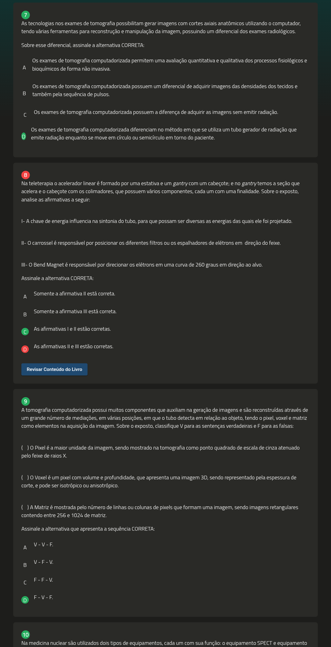 7 As tecnologias nos exames de tomografia possibilitam gerar imagens com cortes axiais anatômicos utilizando 0 computador, tendo várias ferramentas para reconstrução e manipulação da imagem, possuindo um diferencial dos exames radiológicos. Sobre esse diferencial, assinale a alternativa CORRETA: Os exames de tomografia computadorizada permitem uma avaliação quantitativa e qualitativa dos processos fisiológicos e A bioquímicos de forma não invasiva. Os exames de tomografia computadorizada possuem um diferencial de adquirir imagens das densidades dos tecidos e também pela sequência de pulsos. Os exames de tomografia computadorizada possuem a diferença de adquirir as imagens sem emitir radiação. Os exames de tomografia computadorizada diferenciam no método em que se utiliza um tubo gerador de radiação que emite radiação enquanto se move em círculo ou semicírculo em torno do paciente. 8 Na teleterapia 0 acelerador linear é formado por uma estativa e um um cabeçote; e no gantrytemos a seção que acelera e 0 cabeçote com colimadores, que possuem vários componentes, cada um com uma finalidade. Sobre exposto, analise as afirmativas a seguir: I- A chave de energia influencia na sintonia do tubo, para que possam ser diversas as energias das quais ele foi projetado. II- carrossel é responsável por posicionar diferentes filtros ou espalhadores de elétrons em direção do feixe. III- Bend Magnet é responsável por direcionar os elétrons em uma curva de 260 graus em direção ao alvo. Assinale a alternativa CORRETA: Somente a afirmativa II está correta. A Somente a afirmativa III está correta. As afirmativas e II estão corretas. As afirmativas II e III estão corretas. D Revisar Conteúdo do Livro 9 A tomografia computadorizada possui muitos componentes que auxiliam na geração de imagens e são reconstruídas através de um grande número de mediações, em várias posições, em que tubo detecta em relação ao objeto, tendo pixel, voxel e matriz como elementos na aquisição da imagem. Sobre exposto, classifique V para as sentenças verdadeiras e F para as falsas: ( ) 0 Pixel é a maior unidade da imagem, sendo mostrado na tomografia como ponto quadrado de escala de cinza atenuado pelo feixe de raios X. ( Voxel é um pixel com volume e profundidade, que apresenta uma imagem 3D, sendo representado pela espessura de corte, e pode ser isotrópico ou anisotrópico. Matriz é mostrada pelo número de linhas ou colunas de pixels que formam uma imagem, sendo imagens retangulares contendo entre 256 e 1024 de matriz. Assinale a alternativa que apresenta a sequência CORRETA: V-V-F. A V-F-V. F-F-V. F-V-F. D 10 Na medicina nuclear são utilizados dois tipos de equipamentos, cada um com sua função: 0 equipamento SPECT e equipamento