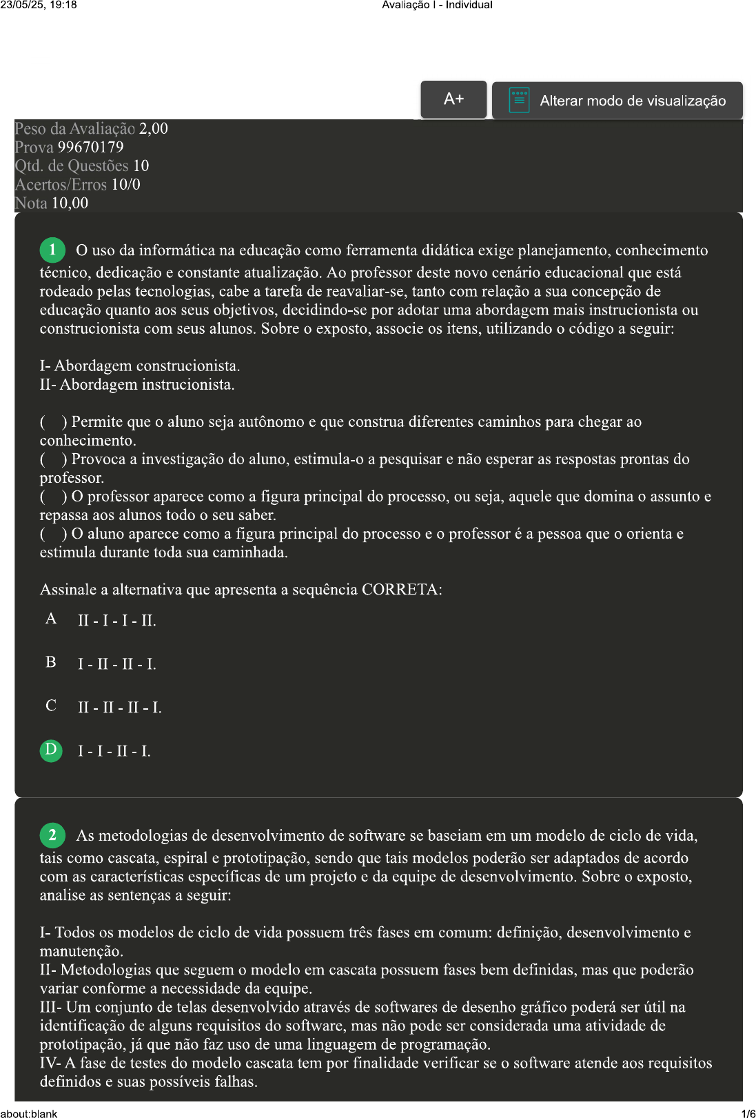 23/05/25, 19:18 Avaliação Individual A+ Alterar modo de visualização Peso da Avaliação 2,00 Prova 99670179 Qtd. de Questões 10 Acertos/Erros 10/0 Nota 10,00 1 uso da informática na educação como ferramenta didática exige planejamento, conhecimento técnico, dedicação e constante atualização. Ao professor deste novo cenário educacional que está rodeado pelas tecnologias, cabe a tarefa de reavaliar-se, tanto com relação a sua concepção de educação quanto aos seus objetivos, decidindo-se por adotar uma abordagem mais instrucionista ou construcionista com seus alunos. Sobre o exposto, associe os itens, utilizando o código a seguir: I- Abordagem construcionista. II- Abordagem instrucionista. ( ) Permite que o aluno seja autônomo e que construa diferentes caminhos para chegar ao conhecimento. ( ) Provoca a investigação do aluno, estimula-o a pesquisar e não esperar as respostas prontas do professor. professor aparece como a figura principal do processo, ou seja, aquele que domina o assunto e repassa aos alunos todo o seu saber. aluno aparece como a figura principal do processo e o professor é a pessoa que o orienta e estimula durante toda sua caminhada. Assinale a alternativa que apresenta a sequência CORRETA: A II I I II. I II II I. II II II I. D 2 As metodologias de desenvolvimento de software se baseiam em um modelo de ciclo de vida, tais como cascata, espiral e prototipação, sendo que tais modelos poderão ser adaptados de acordo com as características específicas de um projeto e da equipe de desenvolvimento. Sobre o exposto, analise as sentenças a seguir: I- Todos os modelos de ciclo de vida possuem três fases em comum: definição, desenvolvimento e manutenção. II- Metodologias que seguem o modelo em cascata possuem fases bem definidas, mas que poderão variar conforme a necessidade da equipe. III- Um conjunto de telas desenvolvido através de softwares de desenho gráfico poderá ser útil na identificação de alguns requisitos do software, mas não pode ser considerada uma atividade de prototipação, já que não faz uso de uma linguagem de programação. IV- A fase de testes do modelo cascata tem por finalidade verificar se o software atende aos requisitos definidos e suas possíveis falhas. about:blank 1/623/05/25, 19:18 Avaliação Individual V- Projetos desenvolvidos através do modelo em espiral normalmente possuem um maior potencial de risco, já que sua abordagem está orientada à codificação. Assinale a alternativa CORRETA: A As sentenças II, IV e V estão corretas. B As sentenças I, II e IV estão corretas. As sentenças I, III e IV estão corretas. D As sentenças III e V estão corretas. 3 Todo projeto de software, antes de iniciar seu processo de implementação (codificação), deve passar por uma análise aprofundada com o intuito de verificar a sua viabilidade econômica e os requisitos que deverão ser atendidos, sendo que tais requisitos dividem-se em duas categorias: funcionais e não funcionais. Acerca dos requisitos não funcionais, assinale a alternativa CORRETA: A Definem as questões tecnológicas quanto ao funcionamento do software. B Descrevem os serviços disponibilizados pelo software aos usuários. Descrevem com detalhes o que deve ser codificado pelo programador. D Especificam as funções que não poderão ser executadas pelo software. 4 Os softwares educacionais possuem como premissa auxiliar na aprendizagem, disponibilizar ao aluno acesso às tecnologias, bem como dinamizar as aulas, tornando-as mais atrativas e dinâmicas. A utilização desses softwares em sala de aula deve ser mediada pelos profissionais da educação para que o aluno consiga acessar conteúdos e para que seja oferecida uma nova forma de aprender com a informática. Com relação aos softwares e características relacionadas à qualidade de software, analise as sentenças a seguir: I- Exercício e prática apresenta feedback, para melhorar o desempenho do aluno e assegurar o conhecimento da habilidade desejada. II- Tutorial apresenta programas com informações organizadas conforme a necessidade da sequência pedagógica a ser apresentada ao aluno. III- Multimídia apresenta uso de ilustrações, de animação, de cor, de recursos sonoros para despertar, manter e reforçar a atenção e a motivação do aluno. Assinale a alternativa CORRETA: A Somente a sentença II está correta. B Somente a sentença III está correta. Somente a sentença I está correta. about:blank 2/623/05/25, 19:18 Avaliação I - Individual D As sentenças I, II e III estão corretas. 5 A prototipação é considerada uma técnica poderosa para o desenvolvimento de softwares, que tem por finalidade obter as informações necessárias do software e apresentá-las aos usuários, através de uma representação limitada de um design. Sobre as características do modelo de prototipação, analise as sentenças a seguir: I- protótipo tem a função de auxiliar na validação dos requisitos do sistema e possibilitar a inserção de novos requisitos ainda não identificados. II- Na construção do protótipo deve-se observar as boas práticas de construção de software, já que este poderá ser reaproveitado no desenvolvimento do software. III- Uma das vulnerabilidades do modelo de prototipação é a compreensão do cliente sobre a função do protótipo. IV- Este modelo possibilita que sejam realizados sucessivos refinamentos para chegar ao modelo ideal. Assinale a alternativa CORRETA: A As sentenças I, III e IV estão corretas. B Somente a sentença I está correta. As sentenças II e IV estão corretas. D As sentenças I e II estão corretas. 6 Nos dias atuais, o mercado da informática traz uma infinidade de softwares. Diante da diversidade de possibilidades encontradas nas propostas destes, entendemos ser necessário o professor estabelecer critérios para a sua utilização, compreendendo sua classificação e adequação atrelada aos objetivos que pretende atingi