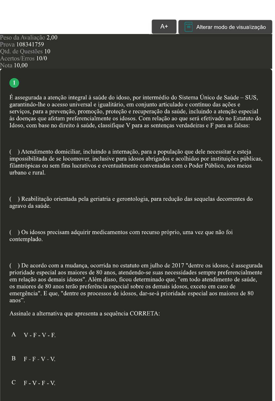 A+ Alterar modo de visualização Peso da Avaliação 2,00 Prova 108341759 Qtd. de Questões 10 Acertos/Erros 10/0 Nota 10,00 1 É assegurada a atenção integral à saúde do idoso, por intermédio do Sistema Único de Saúde SUS, garantindo-lhe o acesso universal e igualitário, em conjunto articulado e contínuo das ações e serviços, para a prevenção, promoção, proteção e recuperação da saúde, incluindo a atenção especial às doenças que afetam preferencialmente os idosos. Com relação ao que será efetivado no Estatuto do Idoso, com base no direito à saúde, classifique V para as sentenças verdadeiras e F para as falsas: Atendimento domiciliar, incluindo a internação, para a população que dele necessitar e esteja impossibilitada de se locomover, inclusive para idosos abrigados e acolhidos por instituições públicas, filantrópicas ou sem fins lucrativos e eventualmente conveniadas com o Poder Público, nos meios urbano e rural. Reabilitação orientada pela geriatria e gerontologia, para redução das sequelas decorrentes do agravo da saúde. Os idosos precisam adquirir medicamentos com recurso próprio, uma vez que não foi contemplado. De acordo com a mudança, ocorrida no estatuto em julho de 2017 "dentre os idosos, é assegurada prioridade especial aos maiores de 80 anos, atendendo-se suas necessidades sempre preferencialmente em relação aos demais idosos". Além disso, ficou determinado que, "em todo atendimento de saúde, os maiores de 80 anos terão preferência especial sobre os demais idosos, exceto em caso de emergência". E que, "dentre os processos de idosos, dar-se-á prioridade especial aos maiores de 80 anos". Assinale a alternativa que apresenta a sequência CORRETA: A V-F-V-F. B F-F-V-V. F-V-F-V.D V-V-F-V. 2 A violência contra o idoso é um ato único e repetido ou uma omissão que cause dano ou aflição e resulte, na maioria das vezes, em sofrimento, lesão, dor, falha ou perda dos direitos humanos. Todos os dias, pessoas com mais de 60 anos sofrem algum ato de violência, a qual pode ser caracterizada em vários tipos. Sobre esses tipos, classifique V para as sentenças verdadeiras e F para as falsas: Violência física: é o uso da força física para compelir os idosos a fazerem o que não desejam, para feri-los, provocar dor, incapacidade ou morte. Violência psicológica: corresponde a agressões verbais ou gestuais, com o objetivo de aterrorizar, humilhar, restringir a liberdade ou isolar do convívio social. ( ) Negligência: consiste na exploração imprópria ou ilegal ou ao uso não consentido pela pessoa idosa de seus recursos financeiros e patrimoniais. Violência medicamentosa: diz respeito à conduta da pessoa idosa que ameaça sua própria saúde. Assinale a alternativa que apresenta a sequência CORRETA: A V-F-F-F. B F-F-V-V. V-V-F-F. D V-F-V-F. 3 A população de idosos acima de 65 anos teve um aumento de 73% nos últimos 16 anos no Brasil. Nesse período, mais de 7 milhões de pessoas passaram a integrar essa faixa etária, que hoje representa 8% da população nacional, segundo dados do Instituto Brasileiro de Geografia e Estatística (IBGE). Em 2030, essa participação subirá para 13% e, em 2060, para 27% dos brasileiros. modelo de atenção à saúde atual é baseado na busca da cura de doenças agudas, enquanto cresce o número deidosos que convivem com doenças crônicas, como hipertensão, diabetes e doenças respiratórias. Com relação à Transição Demográfica e Epidemiológica, analise as sentenças a seguir: I- Com relação à transição demográfica, ocorre simultaneamente a queda na taxa de fecundidade e aumento da expectativa de vida. II- A transição demográfica acontece de maneira homogênea em todo o país. III- Do ponto de vista do cuidado, com a transição epidemiológica, faz-se necessário um planejamento em longo prazo. IV- Faz-se necessário investir cada vez mais na equipe de saúde, para uma abordagem integral ao idoso e estímulo à autonomia e independência. Assinale a alternativa CORRETA: A As sentenças II e IV estão corretas. B As sentenças I e II estão corretas. As sentenças I, III e IV estão corretas. D Somente a sentença I está correta. 4 A longevidade é, sem dúvida, um triunfo. Há, no entanto, importantes diferenças entre os países desenvolvidos e os países em desenvolvimento. Enquanto nos primeiros o envelhecimento ocorreu associado às melhorias nas condições gerais de vida, nos outros, esse processo acontece de forma rápida, sem tempo para uma reorganização social e da área de saúde adequada para atender às novas demandas emergentes. Com relação ao envelhecimento, analise as sentenças a seguir: I- envelhecimento pode ser compreendido como um processo natural, de diminuição progressiva da reserva funcional dos indivíduos senescência o que, em condições normais, não costuma provocar qualquer problema. II- Senescência é o envelhecimento patológico. III- A geriatria e a gerontologia atuam no tratamento das doenças relacionadas ao envelhecimento.IV- A senilidade é caracterizada pelo envelhecimento fisiológico. Assinale a alternativa CORRETA: A As sentenças II e III estão corretas. B As sentenças III e IV estão corretas. Somente a sentença I está correta. D As sentenças II e IV estão corretas. 5 A violência contra a população idosa é uma realidade alarmante. Esse fenômeno abrange uma variedade de formas de abuso, negligência e maus-tratos físicos, psicológicos, financeiros e até mesmo institucionais direcionados a pessoas idosas. enfermeiro, além das diversas competências e habilidades de sua profissão, deve conhecer a política nacional do idoso e o Estatuto do Idoso, a fim de promover os direitos da pessoa idosa e protegê-la. Fonte: BARROSO, de P. Assistência de Enfermagem na Saúde do Idoso. Indaial: UNIASSELVI, 2022. Sobre o atendimento à pessoa idosa vítima de violência, assinale a alternativa CORRETA: A A identif