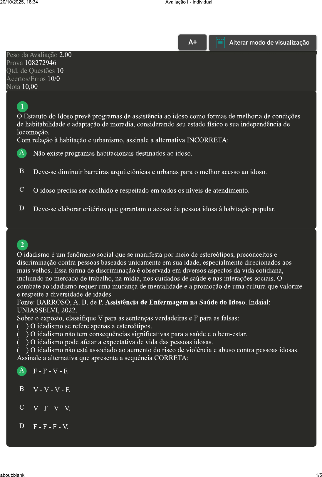 20/10/2025, 18:34 Avaliação - Individual A+ Alterar modo de visualização Peso da Avaliação 2,00 Prova 108272946 Qtd. de Questões 10 Acertos/Erros 10/0 Nota 10,00 1 Estatuto do Idoso prevê programas de assistência ao idoso como formas de melhoria de condições de habitabilidade e adaptação de moradia, considerando seu estado físico e sua independência de locomoção. Com relação à habitação e urbanismo, assinale a alternativa INCORRETA: A Não existe programas habitacionais destinados ao idoso. B Deve-se diminuir barreiras arquitetônicas e urbanas para o melhor acesso ao idoso. idoso precisa ser acolhido e respeitado em todos os níveis de atendimento. D Deve-se elaborar critérios que garantam o acesso da pessoa idosa à habitação popular. 2 idadismo é um fenômeno social que se manifesta por meio de preconceitos e discriminação contra pessoas baseados unicamente em sua idade, especialmente direcionados aos mais velhos. Essa forma de discriminação é observada em diversos aspectos da vida cotidiana, incluindo no mercado de trabalho, na mídia, nos cuidados de saúde e nas interações sociais. combate ao idadismo requer uma mudança de mentalidade e a promoção de uma cultura que valorize e respeite a diversidade de idades Fonte: BARROSO, B. de P. Assistência de Enfermagem na Saúde do Idoso. Indaial: UNIASSELVI, 2022. Sobre o exposto, classifique V para as sentenças verdadeiras e F para as falsas: idadismo se refere apenas a estereótipos. ( ) idadismo não tem consequências significativas para a saúde e o bem-estar. ( ) O idadismo pode afetar a expectativa de vida das pessoas idosas. idadismo não está associado ao aumento do risco de violência e abuso contra pessoas idosas. Assinale a alternativa que apresenta a sequência CORRETA: A F-F-V-F. V-V-V-F. V-F-V-V. D F-F-F-V. about:blank 1/520/10/2025, 18:34 Avaliação I Individual 3 Além dos fenômenos inerentes ao processo de envelhecimento, com as modificações fisiológicas e patologias consideradas típicas da terceira idade, a pessoa idosa também está suscetível ao fenômeno da violência. Trata-se de um problema com consequências devastadoras para os idosos, pois acarreta baixa qualidade de vida, estresse psicológico, falta de segurança, traumas, bem como o aumento da morbidade e mortalidade. Com relação à violência contra a pessoa idosa, avalie as asserções a seguir e a relação proposta entre elas: I- Em 2006, a Rede Internacional de Prevenção à Violência à Pessoa Idosa em parceria com a Organização das Nações Unidas (ONU) instituiu o 15 de junho como o Dia Mundial da Conscientização da Violência contra a Pessoa Idosa. PORQUE II- A violência familiar é aquela praticada por familiares do idoso, seus filhos, netos, bisnetos, cônjuges ou companheiros, dentre outras pessoas que possuem ligação familiar, sendo considerada como a mais preocupante e difícil de ser controlada. Assinale a alternativa CORRETA: A A primeira asserção é uma proposição verdadeira, e a segunda, uma proposição falsa. B As duas asserções são proposições verdadeiras, mas a segunda não é uma justificativa correta da primeira. As duas asserções são proposições verdadeiras, e a segunda é uma justificativa correta da primeira. D A primeira asserção é uma proposição falsa, e a segunda, uma proposição verdadeira. 4 É assegurada a atenção integral à saúde do idoso, por intermédio do Sistema Único de Saúde SUS, garantindo-lhe o acesso universal e igualitário, em conjunto articulado e contínuo das ações e serviços, para a prevenção, promoção, proteção e recuperação da saúde, incluindo a atenção especial às doenças que afetam preferencialmente os idosos. Com relação ao que será efetivado no Estatuto do Idoso, com base no direito à saúde, classifique V para as sentenças verdadeiras e F para as falsas: Atendimento domiciliar, incluindo a internação, para a população que dele necessitar e esteja impossibilitada de se locomover, inclusive para idosos abrigados e acolhidos por instituições públicas, filantrópicas ou sem fins lucrativos e eventualmente conveniadas com o Poder Público, nos meios urbano e rural. ( ) Reabilitação orientada pela geriatria e gerontologia, para redução das sequelas decorrentes do agravo da saúde. Os idosos precisam adquirir medicamentos com recurso próprio, uma vez que não foi contemplado. ( ) De acordo com a mudança, ocorrida no estatuto em julho de 2017 "dentre os idosos, é assegurada prioridade especial aos maiores de 80 anos, atendendo-se suas necessidades sempre preferencialmente em relação aos demais idosos". Além disso, ficou determinado que, "em todo atendimento de saúde, os maiores de 80 anos terão preferência especial sobre os demais idosos, exceto em caso de emergência". E que, "dentre os processos de idosos, dar-se-á prioridade especial aos maiores de 80 anos". Assinale a alternativa que apresenta a sequência CORRETA: A F-V-F-V. B F-F-V-V. V-V-F-V. about:blank 2/520/10/2025, 18:34 Avaliação I - Individual D V-F-V-F. 5 Em 2019, foi sancionado o Projeto de Lei 3.646, de 2019, que altera a Lei 10.741/2003 do Estatuto do Idoso, para substituir as expressões "idoso" e "idosos" por "pessoa idosa" e "pessoas idosas". É obrigação da família, da comunidade, da sociedade e do Poder Público assegurar à pessoa idosa, com absoluta prioridade, a efetivação do direito à vida, à saúde, à alimentação, à educação, à cultura, ao esporte, ao lazer, ao trabalho, à cidadania, à liberdade, à dignidade, ao respeito e à convivência familiar e comunitária condições de liberdade e dignidade. Fonte: BARROSO, de P. Assistência de Enfermagem na Saúde do Idoso. Indaial: UNIASSELVI, 2022. Sobre a obrigação que consta no Projeto de Lei 3.646, de 2019, com relação aos direitos das pessoas idosas, assinale a alternativa CORRETA. A Destinar recursos públicos preferencialmente para a popula