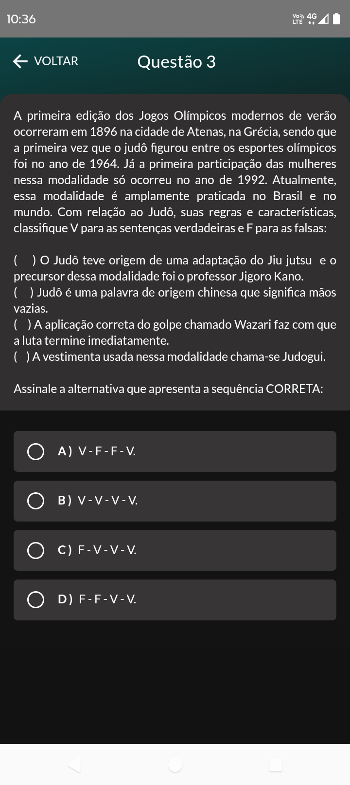 10:36 4G LTE VOLTAR Questão 3 A primeira edição dos Jogos Olímpicos modernos de verão ocorreram em 1896 na cidade de Atenas, na Grécia, sendo que a primeira vez que o judô figurou entre os esportes olímpicos foi no ano de 1964. Já a primeira participação das mulheres nessa modalidade só ocorreu no ano de 1992. Atualmente, essa modalidade é amplamente praticada no Brasil e no mundo. Com relação ao Judô, suas regras e características, classifique V para as sentenças verdadeiras e F para as falsas: ( ) Judô teve origem de uma adaptação do Jiu jutsu e o precursor dessa modalidade foi o professor Jigoro Kano. Judô é uma palavra de origem chinesa que significa mãos vazias. A aplicação correta do golpe chamado Wazari faz com que a luta termine imediatamente. A vestimenta usada nessa modalidade chama-se Judogui. Assinale a alternativa que apresenta a sequência CORRETA: A) V-F-F-V. C) F-V-V-V. D) F-F-V-V.