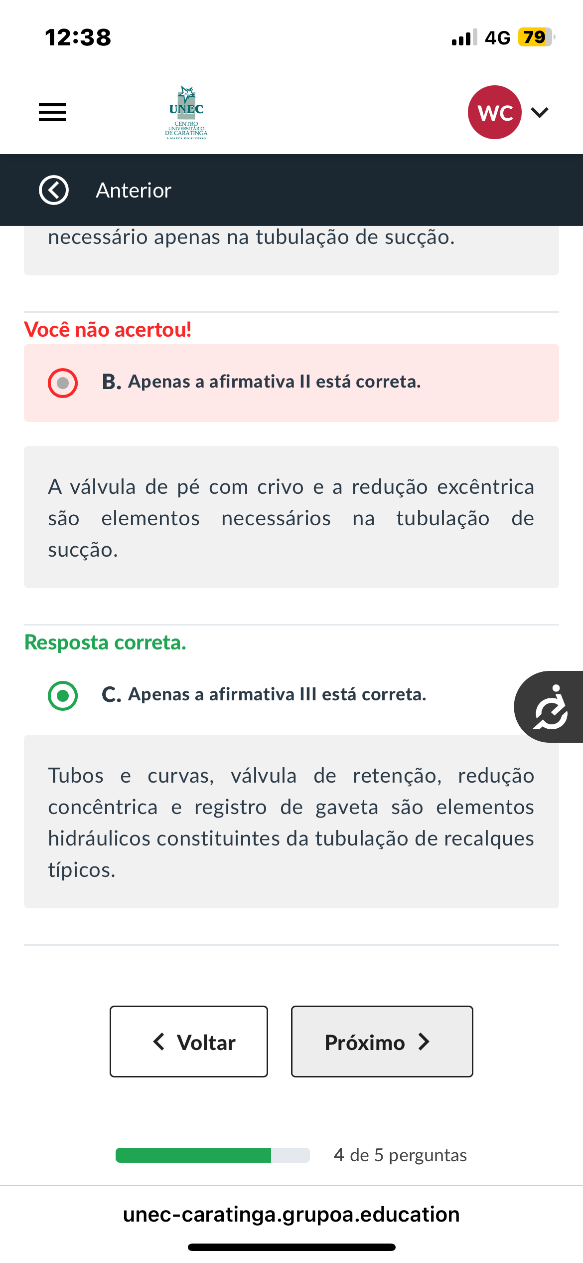 12:38 4G 79 UNEC WC CENTRO DE CARATINGA Anterior necessário apenas na tubulação de sucção. Você não acertou! Apenas a afirmativa II está correta. A válvula de pé com crivo e a redução excêntrica são elementos necessários na tubulação de sucção. Resposta correta. C. Apenas a afirmativa III está correta. Tubos e curvas, válvula de retenção, redução concêntrica e registro de gaveta são elementos hidráulicos constituintes da tubulação de recalques típicos. 4 de 5 perguntas unec-caratinga.grupoa.education