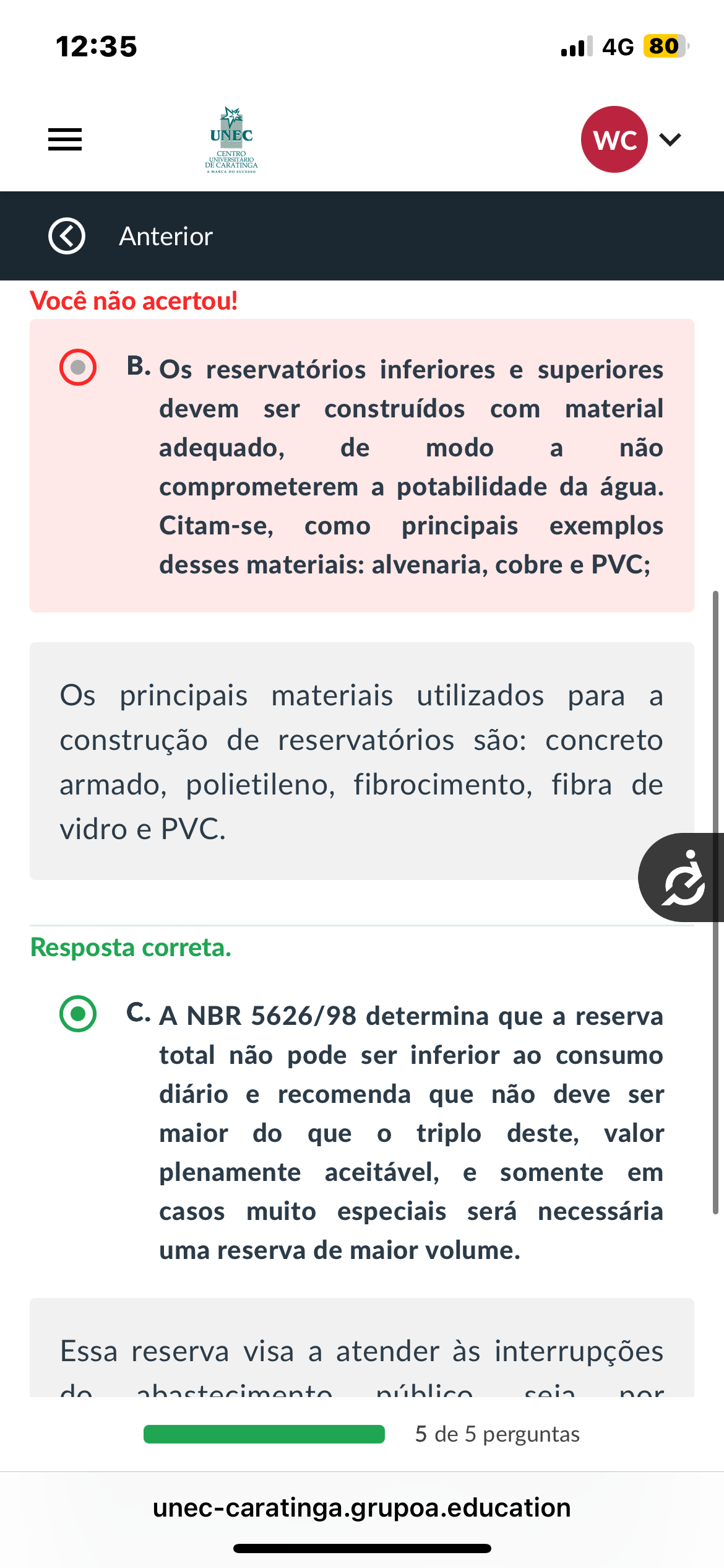 12:35 4G 80 UNEC WC CENTRO DE CARATINGA Anterior Você não acertou! B. Os reservatórios inferiores e superiores devem ser construídos com material adequado, de modo a não comprometerem a potabilidade da água. Citam-se, como principais exemplos desses materiais: alvenaria, cobre e PVC; Os principais materiais utilizados para a construção de reservatórios são: concreto armado, polietileno, fibrocimento, fibra de vidro e PVC. Resposta correta. C. A NBR 5626/98 determina que reserva total não pode ser inferior ao consumo diário e recomenda que não deve ser maior do que triplo deste, valor plenamente aceitável, e somente em casos muito especiais será necessária uma reserva de maior volume. Essa reserva visa a atender às interrupções do 5 de 5 perguntas unec-caratinga.grupoa.education
