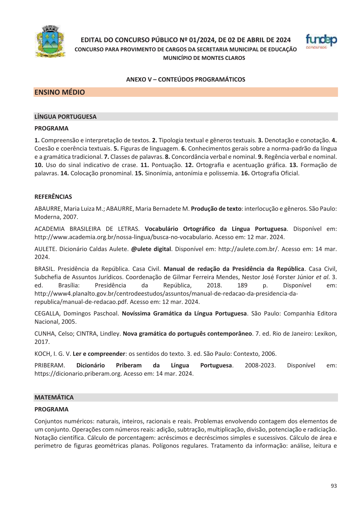 pcimarkpci MDAwMDowMDAwOjAwMDA6MDAwMDowMDAwOmZmZmY6YjEyNDpkM2Y5:RnJpLCAwMyBNYXkgMjAyNCAxNDozODo1NyAtMDMwMA== www.pciconcursos.com.br EDITAL DO CONCURSO PÚBLICO Nº 01/2024, DE 02 DE ABRIL DE 2024 CONCURSO PARA PROVIMENTO DE CARGOS DA SECRETARIA MUNICIPAL DE EDUCAÇÃO MUNICÍPIO DE MONTES CLAROS 93 ANEXO V – CONTEÚDOS PROGRAMÁTICOS ENSINO MÉDIO LÍNGUA PORTUGUESA PROGRAMA 1. Compreensão e interpretação de textos. 2. Tipologia textual e gêneros textuais. 3. Denotação e conotação. 4. Coesão e coerência textuais. 5. Figuras de linguagem. 6. Conhecimentos gerais sobre a norma-padrão da língua e a gramática tradicional. 7. Classes de palavras. 8. Concordância verbal e nominal. 9. Regência verbal e nominal. 10. Uso do sinal indicativo de crase. 11. Pontuação. 12. Ortografia e acentuação gráfica. 13. Formação de palavras. 14. Colocação pronominal. 15. Sinonímia, antonímia e polissemia. 16. Ortografia Oficial. REFERÊNCIAS ABAURRE, Maria Luiza M.; ABAURRE, Maria Bernadete M. Produção de texto: interlocução e gêneros. São Paulo: Moderna, 2007. ACADEMIA BRASILEIRA DE LETRAS. Vocabulário Ortográfico da Língua Portuguesa. Disponível em: http://www.academia.org.br/nossa-lingua/busca-no-vocabulario. Acesso em: 12 mar. 2024. AULETE. Dicionário Caldas Aulete. @ulete digital. Disponível em: http://aulete.com.br/. Acesso em: 14 mar. 2024. BRASIL. Presidência da República. Casa Civil. Manual de redação da Presidência da República. Casa Civil, Subchefia de Assuntos Jurídicos. Coordenação de Gilmar Ferreira Mendes, Nestor José Forster Júnior et al. 3. ed. Brasília: Presidência da República, 2018. 189 p. Disponível em: http://www4.planalto.gov.br/centrodeestudos/assuntos/manual-de-redacao-da-presidencia-da- republica/manual-de-redacao.pdf. Acesso em: 12 mar. 2024. CEGALLA, Domingos Paschoal. Novíssima Gramática da Língua Portuguesa. São Paulo: Companhia Editora Nacional, 2005. CUNHA, Celso; CINTRA, Lindley. Nova gramática do português contemporâneo. 7. ed. Rio de Janeiro: Lexikon, 2017. KOCH, I. G. V. Ler e compreender: os sentidos do texto. 3. ed. São Paulo: Contexto, 2006. PRIBERAM. Dicionário Priberam da Língua Portuguesa. 2008-2023. Disponível em: https://dicionario.priberam.org. Acesso em: 14 mar. 2024. MATEMÁTICA PROGRAMA Conjuntos numéricos: naturais, inteiros, racionais e reais. Problemas envolvendo contagem dos elementos de um conjunto. Operações com números reais: adição, subtração, multiplicação, divisão, potenciação e radiciação. Notação científica. Cálculo de porcentagem: acréscimos e decréscimos simples e sucessivos. Cálculo de área e perímetro de figuras geométricas planas. Polígonos regulares. Tratamento da informação: análise, leitura e pcimarkpci MDAwMDowMDAwOjAwMDA6MDAwMDowMDAwOmZmZmY6YjEyNDpkM2Y5:RnJpLCAwMyBNYXkgMjAyNCAxNDozODo1NyAtMDMwMA== www.pciconcursos.com.br EDITAL DO CONCURSO PÚBLICO Nº 01/2024, DE 02 DE ABRIL DE 2024 CONCURSO PARA PROVIMENTO DE CARGOS DA SECRETARIA MUNICIPAL DE EDUCAÇÃO MUNICÍPIO DE MONTES CLAROS 94 interpretação de tabelas e gráficos. Problemas de contagem. Problemas envolvendo equação do 1º grau. Problemas envolvendo grandezas diretamente e inversamente proporcionais. Sistema monetário brasileiro. REFERÊNCIAS BRASIL. Ministério da Educação. Base Nacional Comum Curricular. Brasília, 2018. Disponível em: http://basenacionalcomum.mec.gov.br/images/BNCC_EI_EF_110518_versaofinal_site.pdf. Acesso em: 14 mar. 2024. DANTE, Luiz Roberto. Matemática: contexto & aplicações. Ensino Médio. 3. ed. São Paulo: Ática, 2016. PAIVA, Manoel Rodrigues. Matemática: Paiva, 1º ao 3º ano. 2. ed. São Paulo: Moderna, 2010. SOUZA, Joamir Roberto de; GARCIA, Jacqueline da Silva Ribeiro. #Contato Matemática. 1º ao 3º ano. São Paulo: FTD, 2016. LEGISLAÇÃO PROGRAMA Constituição Federal de 1988. Lei nº 9.394/1996 – Lei de Diretrizes e Bases da Educação Nacional (LDB) e suas alterações. Lei nº 13.005/2014 – Lei Federal nº 8.069/1990 – Estatuto da Criança e do Adolescente. Lei nº 13.146/2015 – Lei Brasileira de Inclusão da Pessoa com Deficiência (Estatuto da Pessoa com Deficiência). Plano Nacional de Educação em Direitos Humanos – 2007 (Estatuto da pessoa idosa). Direitos e garantias fundamentais – Lei nº 10.741/2003. Código de Ética do Servidor do Município de Montes Claros – Lei nº 3.177/2003. Estatuto do servidor público municipal de Montes Claros – Lei nº 3.175/2003. Estatuto do Magistério do Município de Montes Claros – Lei nº 3.176/2003. REFERÊNCIAS BRASIL. Constituição da República de 1988. Artigo 5º. Disponível em: https://www.planalto.gov.br/ccivil_03/constituicao/constituicao.htm. Acesso em: 7 mar. 2024. BRASIL. Presidência da República. Casa Civil. Lei nº 8.069, de 13 de julho de 1990. Dispõe sobre o Estatuto da Criança e do Adolescente e dá outras providências. Disponível em: https://www.planalto.gov.br/ccivil_03/leis/l8069.htm. Acesso em: 7 mar. 2024. BRASIL. Presidência da República. Casa Civil. Lei nº 9.394, de 20 de dezembro de 1996. Estabelece as diretrizes e bases da educação nacional. Disponível em: https://www.planalto.gov.br/ccivil_03/leis/l9394.htm. Acesso em: 7 mar. 2024. BRASIL. Presidência da República. Casa Civil. Lei nº 13.005, de 25 de junho de 2014 e suas alterações. Aprova o Plano Nacional de Educação - PNE e dá outras providências. Disponível em: http://www.planalto.gov.br/ccivil_03/_ato2011-2014/2014/lei/l13005.htm. Acesso em: 18 mar. 2024. BRASIL. Presidência da República. Casa Civil. Lei nº 10.741, de 1º de outubro de 2003. Dispõe sobre o Estatuto da Pessoa Idosa e dá outras providências. Disponível em: https://www.planalto.gov.br/ccivil_03/leis/2003/l10.741.htm. Acesso em: 7 mar. 2024. pcimarkpci MDAwMDowMDAwOjAwMDA6MDAwMDowMDAwOmZmZmY6YjEyNDpkM2Y5:RnJpLCAwMyBNYXkgMjAyNCAxNDozODo1NyAtMDMwMA== www.pciconcursos.com.br EDITAL DO CONCURSO PÚBLICO Nº 01/