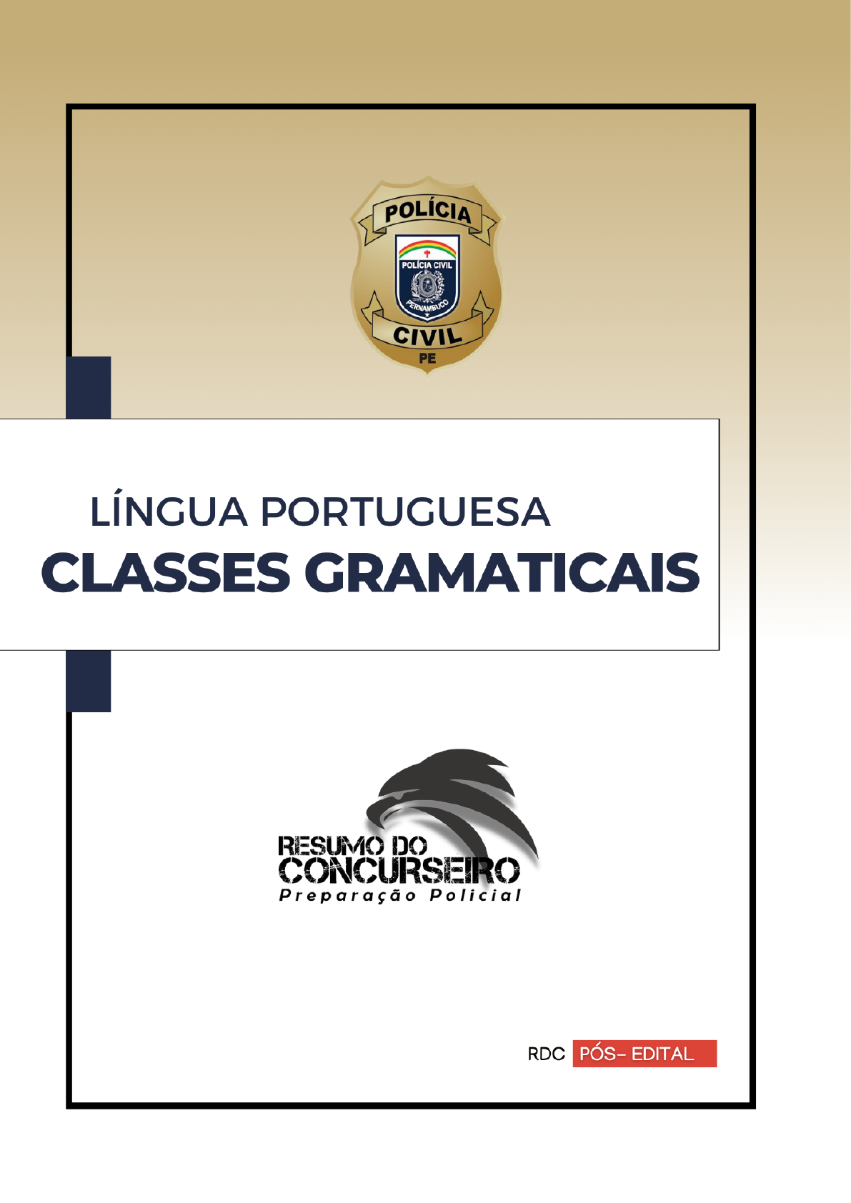 1 2 Sumário Morfologia ......................................................................................................................................................... 3 Míveis de análise ........................................................................................................................................... 3 Morfologia - aspectos introdutórios ............................................................................................................. 4 Adjetivo ...................................................................................................................................................... 6 Artigo ......................................................................................................................................................... 8 Interjeição .................................................................................................................................................. 9 Numeral ..................................................................................................................................................... 9 Advérbio .................................................................................................................................................... 9 Preposição ............................................................................................................................................... 11 Substantivo .............................................................................................................................................. 11 📌 Conjunção ........................................................................................................................................... 16 📌 Verbos ................................................................................................................................................. 19 Pronomes ................................................................................................................................................. 24 3 PORTUGUÊS MORFOLOGIA NÍVEIS DE ANÁLISE Antes de iniciarmos o estudo na morfologia e ir aprofundando o conteúdo, você deve saber que a disciplina de Língua Portuguesa é, sem dúvida, a mais relevante no contexto dos concursos públicos, seja pela quantidade de questões em cada prova, seja pela dificuldade que alguns candidatos têm em obter sucesso nessas questões. É fundamental ter consciência de que só aprendemos aquilo que realmente desejamos aprender. Portanto, acredite na sua capacidade de aprendizado e você conseguirá! Dê uma oportunidade à Língua Portuguesa, pois ela tem te dado oportunidades há muito tempo! Bons estudos! Ao estudar os níveis de Análise da Língua, é importante compreender o significado de cada parte dessa disciplina. Faremos, então, uma divisão para analisar a Língua Portuguesa em cinco níveis. 1) FONÉTICO / FONOLÓGICO (SONS) • Será responsável por estudar os sons emitidos Esse nível fonético irá estudar a produção, a emissão e a articulação dos sons da língua. Nessa parte, é comum haver questões sobre contagem de fonemas (sons) e letras nas palavras. 2) MORFOLÓGICO (O QUE É) • Nesse nível de análise da língua portuguesa iremos estudar a estrutura e a classificação das palavras Aqui teremos a parte responsável pela análise da estrutura e da classificação das palavras dentro de uma frase/sentença. Essa é a base de todo estudo para compreender a Língua, portanto, exige-se muita atenção. 3) SINTÁTICO (O QUE FAZ) • Aqui teremos a função que a palavra em seu nível morfológico exercerá numa frase. Essa é a parte responsável pela análise das funções que cada termo desempenha dentro de uma sentença. É nessa parte que nome como “sujeito”, “objeto” e “predicativo” surgem. 4) SEMÂNTICO Para o mundo do concurso público, essa é a parte que investiga o significado das palavras, ou seja, o seu sentido dicionarizado. 5) PRAGMÁTICO (SENTIDO CONTEXTUAL) Nesse nível, encontra-se a análise do sentido que as palavras ou expressões podem assumir em um contexto específico. As questões de interpretação estão aqui! - Sentido denotativo = Sentido literal das palavras. - Sentido conotativo = Sentido figurado das palavras. Estilística 4 MORFOLOGIA - ASPECTOS INTRODUTÓRIOS Todas as palavras da língua portuguesa irão estar “encaixadas” dentro de alguma classe de palavra. E quais seriam essas classes? Quantas são? 10 CLASSES DE PALAVRAS • Preposição • Interjeição • Conjunção • Advérbio • Substantivo • Verbo • Adjetivo • Pronome • Numeral • Artigo TABELA RESUMO DAS CLASSES DE PALAVRAS Classe de Palavra Definição Exemplos Artigo Termo que particulariza definindo ou não o sentido de um substantivo o, a, um Adjetivo Termo que caracteriza, qualifica ou indica a origem de outro termo verde, feio, francês Advérbio Termo que imprime uma circunstância sobre um verbo, um adjetivo ou um advérbio mal, não Conjunção Termo de função conectiva, que exprime uma relação de sentido e, mas Interjeição Termo que indica estado emotivo momentâneo ai!, ufa! Numeral Termo que indica quantidade, posição, multiplicação ou fração dois, segundo Preposição Termo de função conetiva, que exprime uma relação de regência de, com, para Pronome Termo que substitui ou retoma algo no texto eu, cujo Substantivo Termo que nomeia seres, conceitos ou ações na Língua fé, casa Verbo Termo que exprime ação, estado, mudança de estado ou fenômeno natural estudar, estar, ficar, nevar A estrutura das palavras está relacionada os elementos que compõem os vocábulos. Ela abrange o estudo de diversos elementos mórficos (morfemas): • Raiz, • Radical, • Tema, • Afixos (prefixos, sufixos), • Desinências, • Vogal temática, • Vogal e consoante de ligação. No momento certo iremos destacar cada palavra 