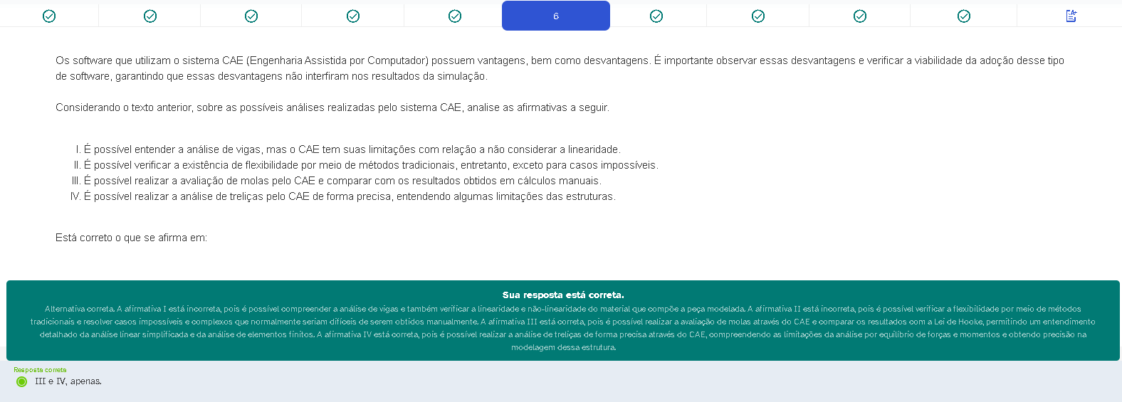 6 Os software que utilizam 0 sistema CAE (Engenharia Assistida por Computador) possuem vantagens, bem como desvantagens. É importante observar essas desvantagens e verificar a viabilidade da adoção desse tipo de software, garantindo que essas desvantagens não interfiram nos resultados da simulação. Considerando 0 texto anterior, sobre as possíveis análises realizadas pelo sistema CAE, analise as afirmativas a seguir. I. É possível entender a análise de vigas, mas 0 CAE tem suas limitações com relação a não considerar a II. É possível verificar a existência de flexibilidade por meio de métodos tradicionais, entretanto, exceto para casos impossíveis. III. É possível realizar a avaliação de molas pelo CAE e comparar com os resultados obtidos em cálculos manuais. IV. É possível realizar a análise de treliças pelo CAE de forma precisa, entendendo algumas limitações das estruturas. Está correto que se afirma em: Sua resposta está correta. Alternativa correta. A afirmativa I está incorreta, pois é possível compreender a de vigas e verificar a linearidade e não-linearidade do material que compõe a peça A afirmativa II incorreta, pois é possível verificar a flexibilidade por meio de métodos tradicionais e resolver casos impossíveis e complexos que normalmente seriam difíceis de serem obtidos manualmente. A afirmativa III está correta, pois é possível realizar a avaliação de molas através do CAE e comparar os resultados com a Lei de Hooke, permitindo um entendimento detalhado da linear simplificada e da análise de elementos finitos. A afirmativa IV está correta, pois é possível realizar a de treliças de forma precisa do CAE, compreendendo as limitações da analise por equilibrio de forças e momentos e obtendo precisão na modelagem dessa estrutura. Resposta correta III e IV, apenas.