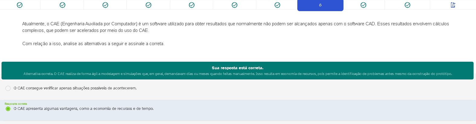 8 Atualmente, 0 CAE (Engenharia Auxiliada por Computador) é um software utilizado para obter resultados que normalmente não podem ser alcançados apenas com 0 software CAD. Esses resultados envolvem cálculos complexos, que podem ser acelerados por meio do uso do CAE. Com relação a isso, analise as alternativas a seguir e assinale a correta. Sua resposta está correta. Alternativa correta. CAE realiza de forma ágil a modelagem e simulações que, em geral, demandavam dias ou meses quando feitas manualmente. Isso resulta em economia de recursos, pois permite a identificação de problemas antes mesmo da construção do protótipo. CAE consegue verificar apenas situações possiveis de acontecerem. Resposta correta 0 CAE apresenta algumas vantagens, como a economia de recursos e de tempo.
