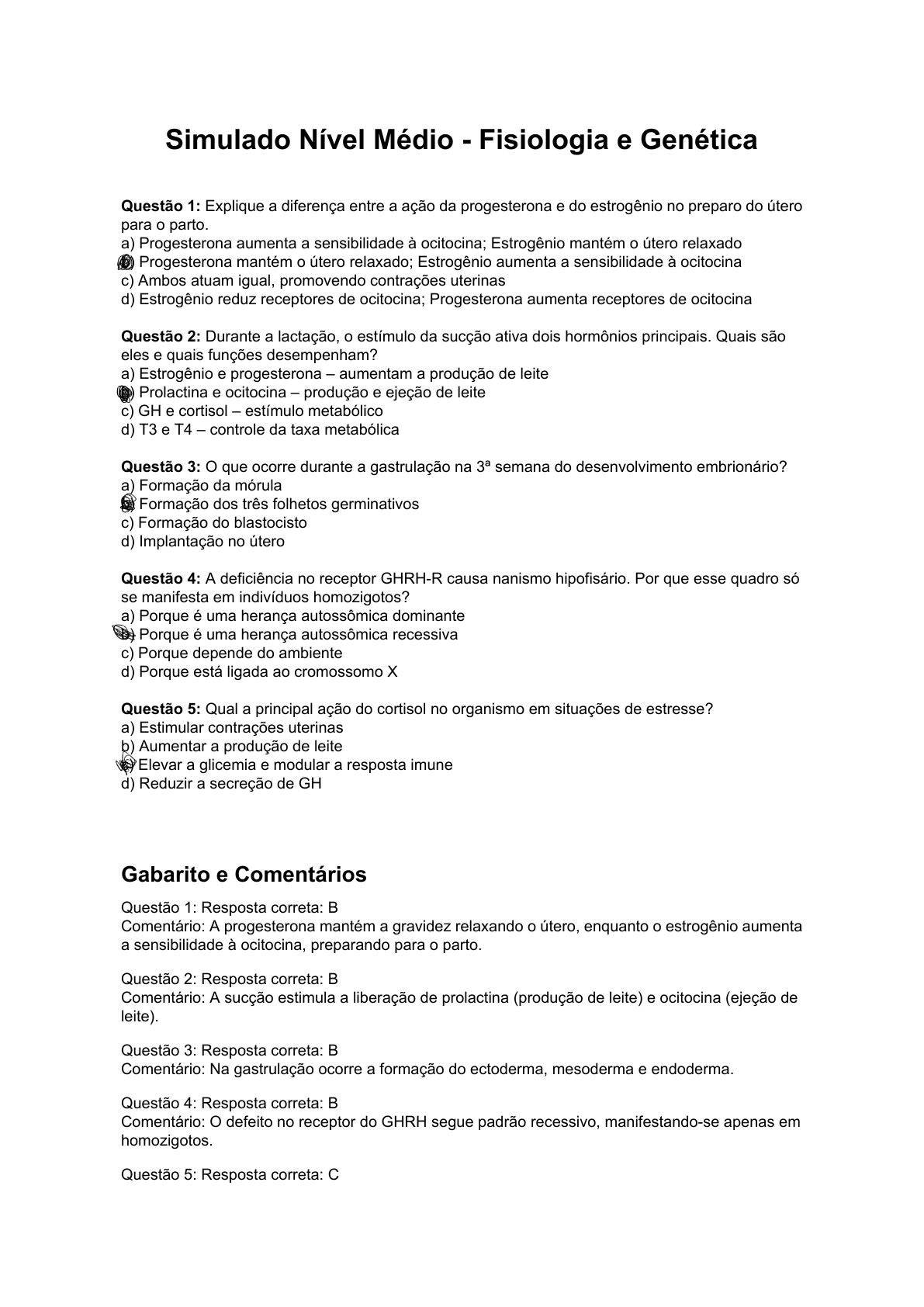 Simulado Nível Médio - Fisiologia e Genética Questão 1: Explique a diferença entre a ação da progesterona e do estrogênio no preparo do útero para o parto. a) Progesterona aumenta a sensibilidade à ocitocina; Estrogênio mantém o útero relaxado b) Progesterona mantém o útero relaxado; Estrogênio aumenta a sensibilidade à ocitocina c) Ambos atuam igual, promovendo contrações uterinas d) Estrogênio reduz receptores de ocitocina; Progesterona aumenta receptores de ocitocina Questão 2: Durante a lactação, o estímulo da sucção ativa dois hormônios principais. Quais são eles e quais funções desempenham? a) Estrogênio e progesterona – aumentam a produção de leite b) Prolactina e ocitocina – produção e ejeção de leite c) GH e cortisol – estímulo metabólico d) T3 e T4 – controle da taxa metabólica Questão 3: O que ocorre durante a gastrulação na 3ª semana do desenvolvimento embrionário? a) Formação da mórula b) Formação dos três folhetos germinativos c) Formação do blastocisto d) Implantação no útero Questão 4: A deficiência no receptor GHRH-R causa nanismo hipofisário. Por que esse quadro só se manifesta em indivíduos homozigotos? a) Porque é uma herança autossômica dominante b) Porque é uma herança autossômica recessiva c) Porque depende do ambiente d) Porque está ligada ao cromossomo X Questão 5: Qual a principal ação do cortisol no organismo em situações de estresse? a) Estimular contrações uterinas b) Aumentar a produção de leite c) Elevar a glicemia e modular a resposta imune d) Reduzir a secreção de GH Gabarito e Comentários Questão 1: Resposta correta: B Comentário: A progesterona mantém a gravidez relaxando o útero, enquanto o estrogênio aumenta a sensibilidade à ocitocina, preparando para o parto. Questão 2: Resposta correta: B Comentário: A sucção estimula a liberação de prolactina (produção de leite) e ocitocina (ejeção de leite). Questão 3: Resposta correta: B Comentário: Na gastrulação ocorre a formação do ectoderma, mesoderma e endoderma. Questão 4: Resposta correta: B Comentário: O defeito no receptor do GHRH segue padrão recessivo, manifestando-se apenas em homozigotos. Questão 5: Resposta correta: C Comentário: O cortisol aumenta a glicemia e regula a resposta imune, sendo essencial no estresse.