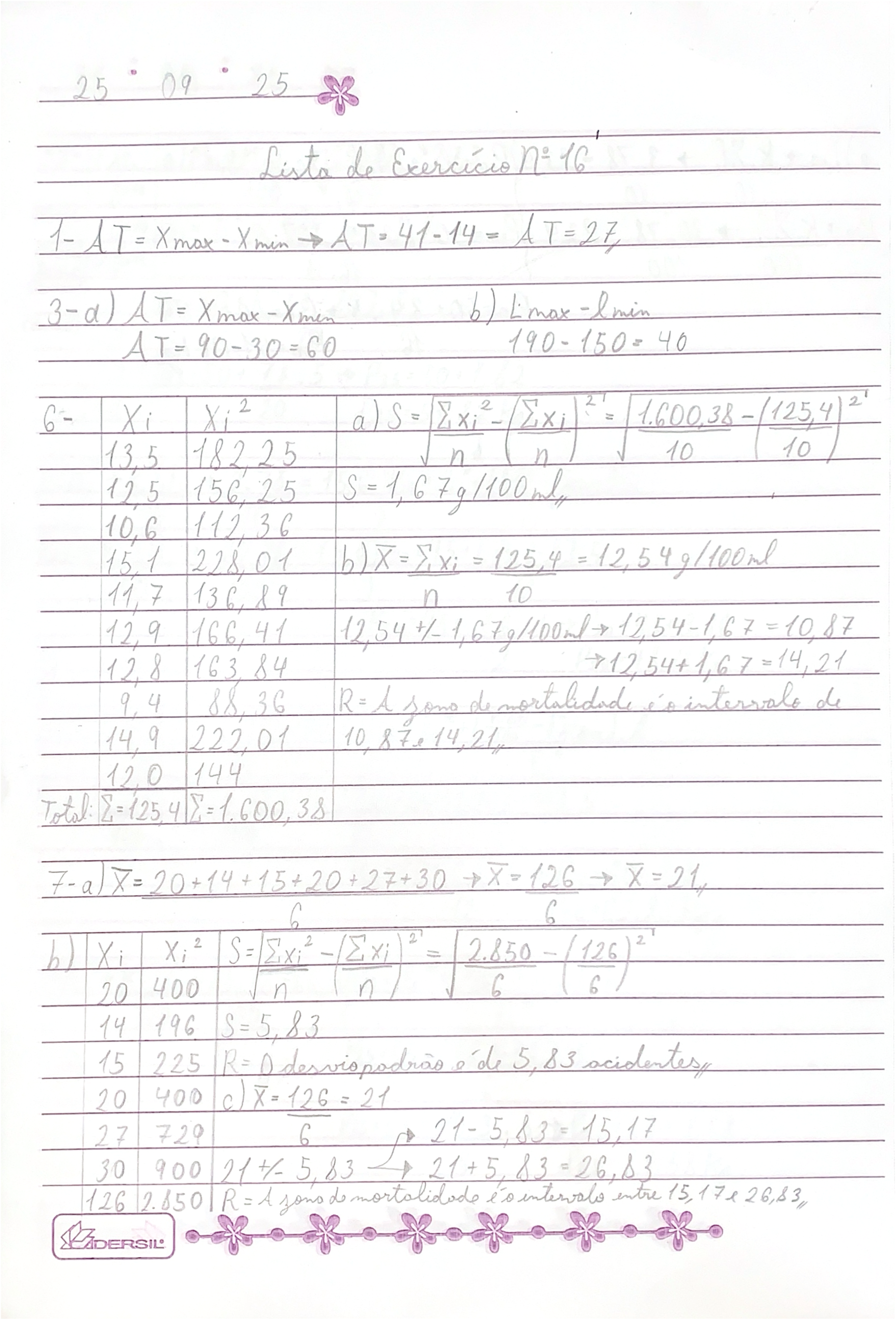 25 09 25 Lista de 1- AT= = Xmax - Xmin = AT=27, AT = Xmax Xmen b) Lmax AT= 6- Xi = n - n N 125,4 13,5 182,25 10 10 12,5 156,25 S = 1, ml, 10,6 112,36 15,1 228,01 b) = = 125,4 = 12,54g/100ml 136,89 n 10 166,41 12,54 +/- 1,67g/100ml 12,8 163,84 = 9,4 88,36 R=A de de 222,01 10, 14,21, 12,0 144 Total: E=125,4 7- a) X=20+14+15+20+27+30 + = 126 X = 21, 6 6 b) Xi 2 = Exi = 2.850 20 400 n n 6 14 196 S=5,83 15 225 R= = 0 'de 5,83 acidentes, 20 400 c) = 126 = 21 27 729 6 30 900 21 5, 83 126 2.850 R=A = zono do mortalidade entre