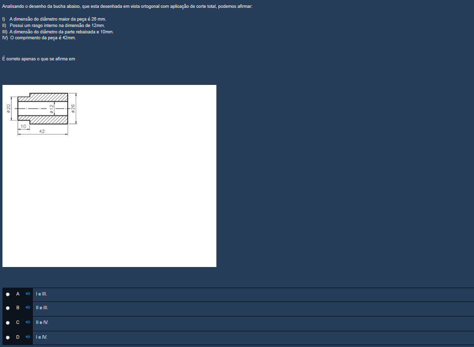 Analisando desenho da bucha abaixo, que esta desenhada em vista ortogonal com aplicação de corte total, podemos afirmar: A dimensão do diâmetro maior da peça é 26 mm. II) Possui um rasgo interno na dimensão de 12mm. III) A dimensão do diâmetro da parte rebaixada e 10mm. IV) comprimento da peça 42mm. correto apenas que se afirma em 6 10 42 A 49 III. B II III. C 49 II IV. D 49 e IV.