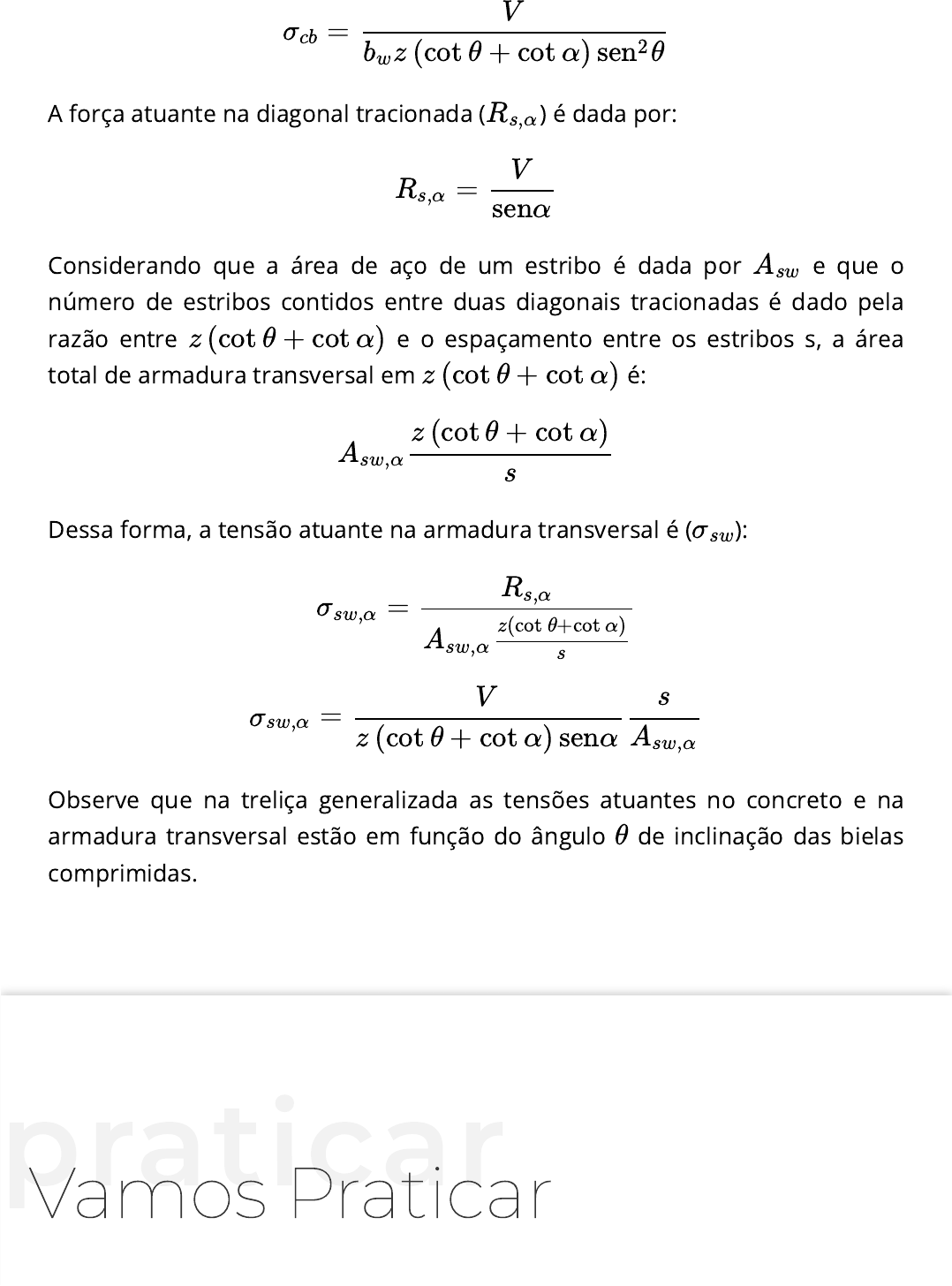 A força atuante na diagonal tracionada ( ) é dada por: Considerando que a área de aço de um estribo é dada por e que o número de estribos contidos entre duas diagonais tracionadas é dado pela razão entre e o espaçamento entre os estribos s, a área total de armadura transversal em é: Dessa forma, a tensão atuante na armadura transversal é ( ): Observe que na treliça generalizada as tensões atuantes no concreto e na armadura transversal estão em função do ângulo de inclinação das bielas comprimidas. praticar Vamos Praticar =σcb V z (cot θ + cot α) sen θbw 2 Rs,α =Rs,α V senα Asw z (cot θ + cot α) z (cot θ + cot α) Asw,α z (cot θ + cot α) s σsw =σsw,α Rs,α Asw,α z(cot θ+cot α) s =σsw,α V z (cot θ + cot α) senα s Asw,α θ