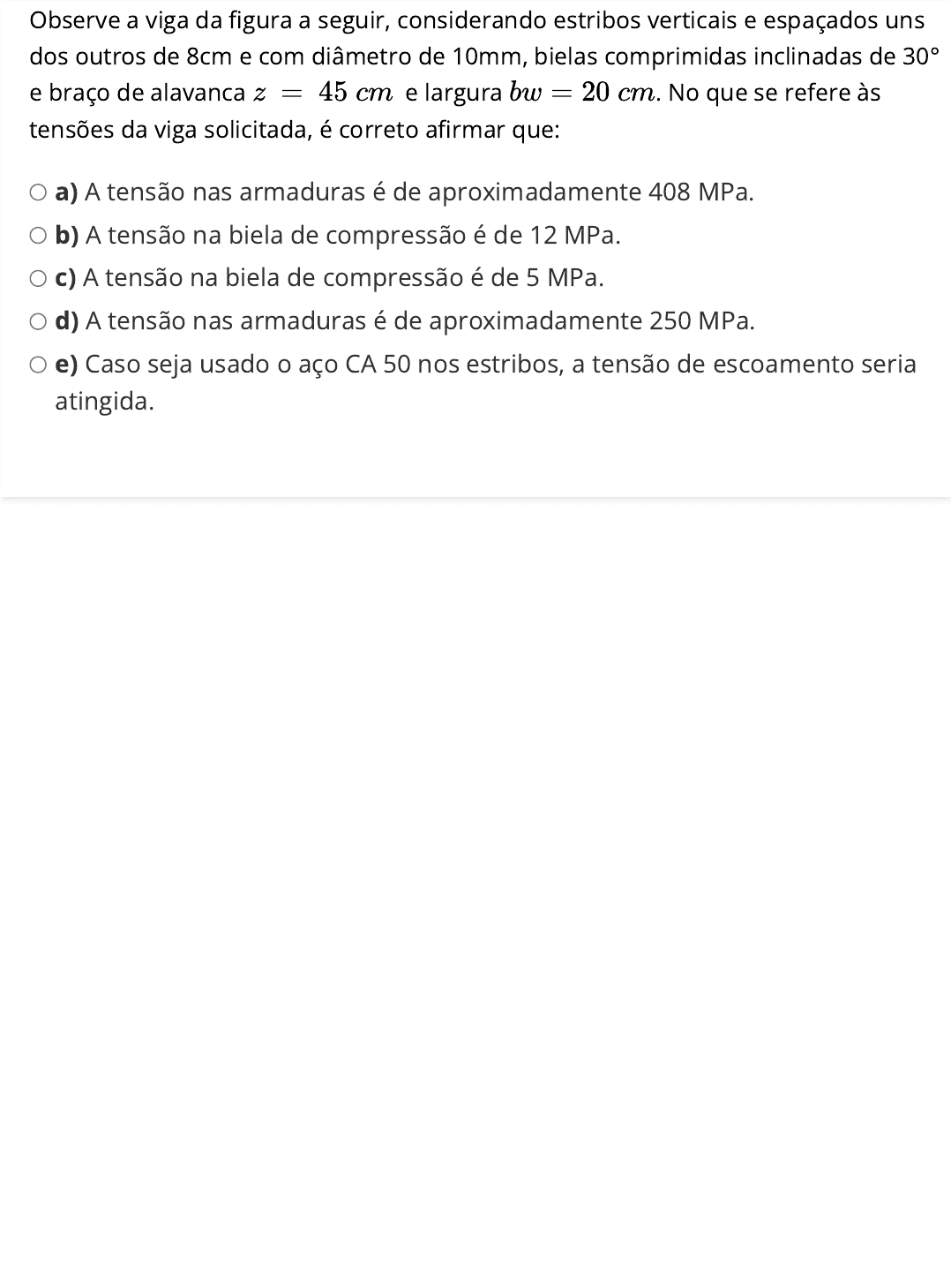 Observe a viga da figura a seguir, considerando estribos verticais e espaçados uns dos outros de 8cm e com diâmetro de 10mm, bielas comprimidas inclinadas de 30° e braço de alavanca e largura . No que se refere às tensões da viga solicitada, é correto afirmar que: a) A tensão nas armaduras é de aproximadamente 408 MPa. b) A tensão na biela de compressão é de 12 MPa. c) A tensão na biela de compressão é de 5 MPa. d) A tensão nas armaduras é de aproximadamente 250 MPa. e) Caso seja usado o aço CA 50 nos estribos, a tensão de escoamento seria atingida. z = 45 cm bw = 20 cm