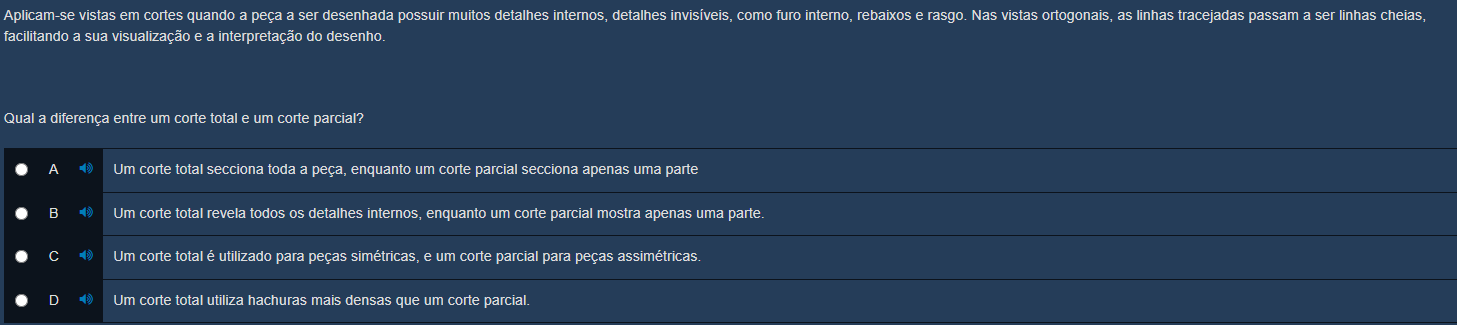 Aplicam-se vistas em cortes quando a peça a ser desenhada possuir muitos detalhes internos, detalhes como furo interno, rebaixos e rasgo. Nas vistas ortogonais, as linhas tracejadas passam a ser linhas cheias, facilitando a sua visualização e a interpretação do desenho. Qual a diferença entre um corte total e um corte parcial? A Um corte total secciona toda a peça, enquanto um corte parcial secciona apenas uma parte B Um corte total revela todos os detalhes internos, enquanto um corte parcial mostra apenas uma parte. C Um corte total é utilizado para peças simétricas, e um corte parcial para peças assimétricas. D Um corte total utiliza hachuras mais densas que um corte parcial.