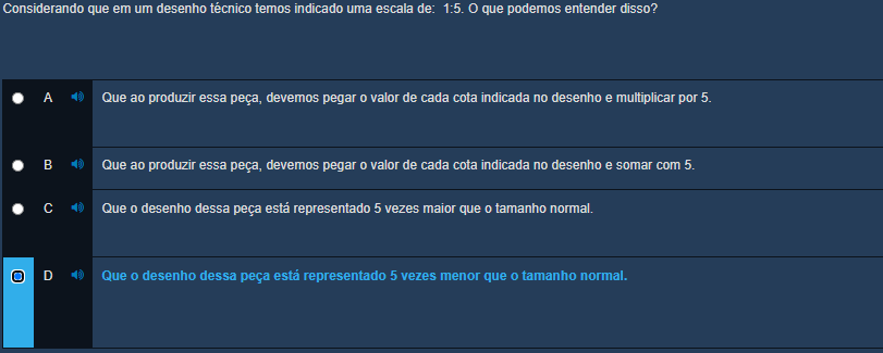 Considerando que em um desenho técnico temos indicado uma escala de: 1:5. 0 que podemos entender disso? A Que ao produzir essa peça, devemos pegar 0 valor de cada cota indicada no desenho e multiplicar por 5. B Que ao produzir essa peça, devemos pegar 0 valor de cada cota indicada no desenho e somar com 5. C Que 0 desenho dessa peça representado 5 vezes maior que 0 tamanho normal. D Que desenho dessa peça representado 5 vezes menor que tamanho normal.