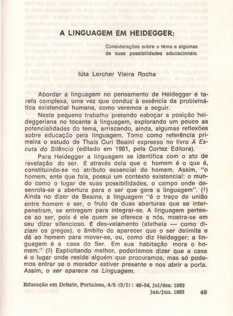 A LINGUAGEM EM HEIDEGGER: Considerações sobre o tema e algumas de suas possibilidades educacionais. lúta Lercher Vieira Rocha Abordar a linguagem no pensamento de Heidegger é ta- refa complexa, uma vez que conduz à essência da problemá- tica existencial humana, como veremos a seguir. Neste pequeno trabalho pretendo esboçar a posição hei- deggeriana no tocante à linguagem, explorando um pouco as potencialidades do tema, arriscando, ainda, algumas reflexões sobre educação pela linguagem. Tomo como referência pri- meira o estudo de Thaís Curi Beaini expresso no livro A Es- cuta do Silêncio (editado em 1981, pela Cortez Editora). Para Heidegger a linguagem se identifica com o ato de revelação do ser. ~ através dela que o homem é o que é, constituindo-se no atributo essencial do homem. Assim, "o homem, ente que fala, possui um contexto existencial: o mun- do como o lugar de suas possibilidades, o campo onde de- senrola-se a abertura para o ser que gera a linguagem". (1) Ainda no dizer de Beaine, a linguagem "é o traço de união entre homem e ser, o fruto de duas aberturas que se inter- penetram, se entregam para integrar-se. A linguagem perten- ce ao ser, pois é ele quem se oferece a nós, mostra-se em seu dizer silencioso. ~ des-velamento (aletheia - como di- zlarn os gregos), o âmbito do aparecer que o ser delimita e dá ao homem para mover-se, ou, como diz Heideqqer: a Iin- -guagem é a casa do Ser. Em sua habitação mora o ho- mem." (2) Explicitando melhor, poderíamos dizer que a casa é o lugar onde reside alguém que procuramos, mas só pode- mos entrar se o morador estiver presente e nos abrir a porta. Assim, o ser aparece na Linguagem. Educação em Debate, Fortaleza, 4/5 (2/1) : 49-54, [ul/dez. 1982 jan/jun. 1983 49 Em linhas gerais, parece muito simples o processo de reciprocidade em que homem e ser estão intimamente vincu- lados através da linguagem num "comum-pertencer" - o ser se envia ao homem, se des-vela, numa entrega em que ambos se constituem: o homem como aquele que se relaciona com o ser e o diz; o ser como o dom que é experienciado e dito pelo homem. No entanto, a linguagem não é apenas a casa do Ser, mas o reino da aparência e daí decorrem todas as ambigüi- dades e distorções no seio das quais nos debatemos. Além disso, a casa do Ser "é uma casa muito engraçada" como a que foi cantada por Vinicius de Moraes para as crianças: o lugar da casa do ser é o tempo (O homem é temporal; é o tempo que demarca o homem como ser-no-mundo. Não se pode perder de vista o vínculo existente entre ser e tempo e este com o "lugar" da manifestação do ser tornado palavra.) Esta "casa muito engraçada" está construída nas pala- vras humanas. Ela tem portas e janelas, mas não tem trincos, nem cortinas. Para conhecer seu estranho morador (o ser) não é preciso ser doutor de muitas palavras, por estranho que pareça, importa mais saber ouvir e ser simples. Nessa casa muito engraçada mora alguém que embora goste de ser visi- tado, prefere brincar de esconde-esconde, ou de aparecer e desaparecer. Só quem for muito cuidadoso pode encontrá-lo, Aí então é preciso usar a palavra para explicitar o ser e para zelar por sua mensagem, isto é, zelar para tornar palavra o dizer do ser. Com Heidegger tomamos consciência que a linguagem não é apenas um advento des-velador, mas também velador do ser. Pode ser o lugar de manifestação do ser, como tam- bém o lugar da negação, do ocultamento da verdade, sendo esta segunda possibilidade muito mais freqüente em nossos dias que a primeira. Dizendo de outro modo, a linguagem, na sua essência, traz à luz o "é" dos entes, operando assim a produção da verdade, o que não significa que esta essência seja "fatalmente" concretizada, nem que a linguagem edifique necessariamente a verdade e, muito menos, que a edifique sempre. Para distinqürr as duas possibilidades passo a desig- ná-Ias como linguagem essencial e linguagem empobrecida, respectivamente. Nossa linguagem cotidiana é inautêntica e distante da lin- guagem essencial, na medida em que bem poucos se man- têm relacionados com o ser (numa "relação hermenêutica", no dizer de Heidegger, ou seja, o homem colocando-se a ser- viço do ser para anunciá-to e, deste modo, cumprir sua refe- rência à solicitação que lhe é feita). Na maioria das vezes encontramos o homem deserdado de si mesmo, afastado do seu núcleo interior, perdido no palavreado e na opinião de "todo o mundo". Distorcida, a linguagem passa a servir, por exemplo, como instrumento de dominação do homem, e o pensamento se transforma em atividade acadêmica, ou ainda, as possibilidades inesgotáveis de Ser s·e cristalizam num ou noutro modo de ser dos entes particulares transformando-se em critério único de verdade ou de sabedoria, a tal ponto que podemos dizer que os modos da linguagem, em diferentes si- tuações e épocas, decidem os modos de produção da verda- de, intervindo nos rumos da história. O homem ainda comporta-se como se fosse o criador e o senhor da linguagem, invertendo a verdadeira relação de anterioridade da linguagem em relação à subjetividade huma- na. Neste sentido, a linguagem essencial não depende de in- tenções subjetivas, não nos pertence; é propriedade do ser. O homem, nessa visão, não é o produtor da palavra, mas um "produto" dela, sendo ela quem fala. Heidegger não consi- dera a linguagem essencial como um simples meio arbitrário de expressão, nem tampouco admite que ela possa ser mani- pulada ou atribuída ao homem, sob pena de se empobrecer. Preservando o que foi uma vez aberto, revelado, a palavra capacita as coisas a tornarem-se o que são. Ela cria a ima- gem e a imagem atrai a influência correspondente, tal é o seu poder instaurador. Para compreender melhor esta postura é bom relembrar que a abordagem de Heidegger não se reduz à dicotomia subjetivo-objetivo, não se explica no âmbito do dominador e do dominado 