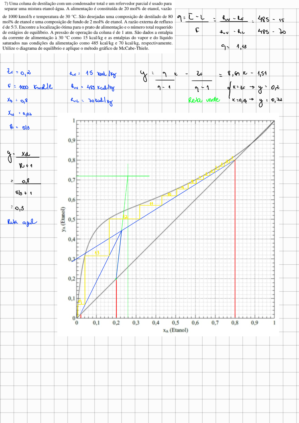 7) Uma coluna de destilação com um condensador total e um refervedor parcial é usado para separar uma mistura etanol-água. A alimentação é constituída de 20 mol% de etanol, vazão de 1000 kmol/h e temperatura de 30 °C. São desejadas uma composição de destilado de 80 = [ : hv 485 15 mol% de etanol e uma composição de fundo de 2 mol% de etanol. A razão externa de refluxo é de 5/3. Encontre a localização ótima para o prato de alimentação e o número total requerido de estágios de equilíbrio. A pressão de operação da coluna é de 1 atm. São dados a entalpia F hv hi 485 to da corrente de alimentação à 30 °C como 15 kcal/kg e as entalpias do vapor e do líquido saturados nas condições da alimentação como 485 kcal/kg e 70 kcal/kg, respectivamente. Utilize o diagrama de equilíbrio e aplique o método gráfico de McCabe-Thiele. 1,13 = 2 15 y 8,69 1,54 F = 1000 hv 483 9-1 9-1 y 0,2 = LL = Reta verde y 0,72 Xw 0,02 1 R = 5/3 0,9 xd 0,8 = 0,8 0,7 5/3 + 1 0,6 11 = 0,3 Reta azul (Etanol) 2 0,5 0,4 13 0,3 0,2 0,1 0 0 0,1 0,2 0,3 0,4 0,5 0,6 0,7 0,8 0,9 1 XA (Etanol)