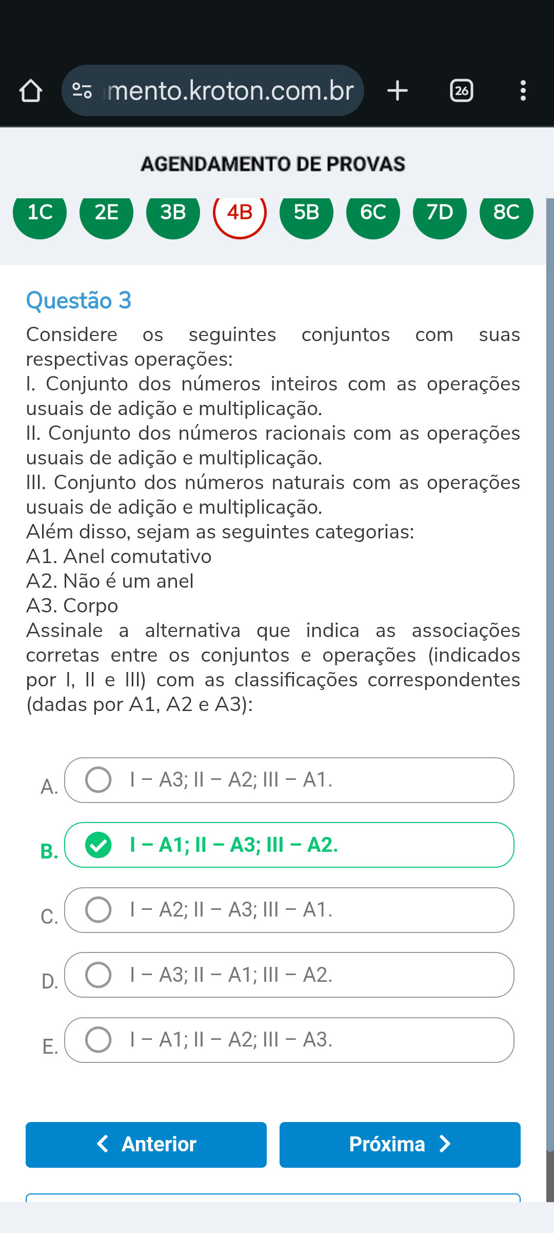 + 26 AGENDAMENTO DE PROVAS 2E 3B 4B 5B 6C 7D 8C Questão 3 Considere os seguintes conjuntos com suas respectivas operações: I. Conjunto dos números inteiros com as operações usuais de adição e multiplicação. II. Conjunto dos números racionais com as operações usuais de adição e multiplicação. III. Conjunto dos números naturais com as operações usuais de adição e multiplicação. Além disso, sejam as seguintes categorias: A1. Anel comutativo A2. Não é um anel Corpo Assinale a alternativa que indica as associações corretas entre os conjuntos e operações (indicados por I, e III) com as classificações correspondentes (dadas por A1, A2 e A3): A3; A2; A1. B. I A1; III - A2. C. I A2; A3; III - A1. D. - A1; A2. E. - A1; A2;