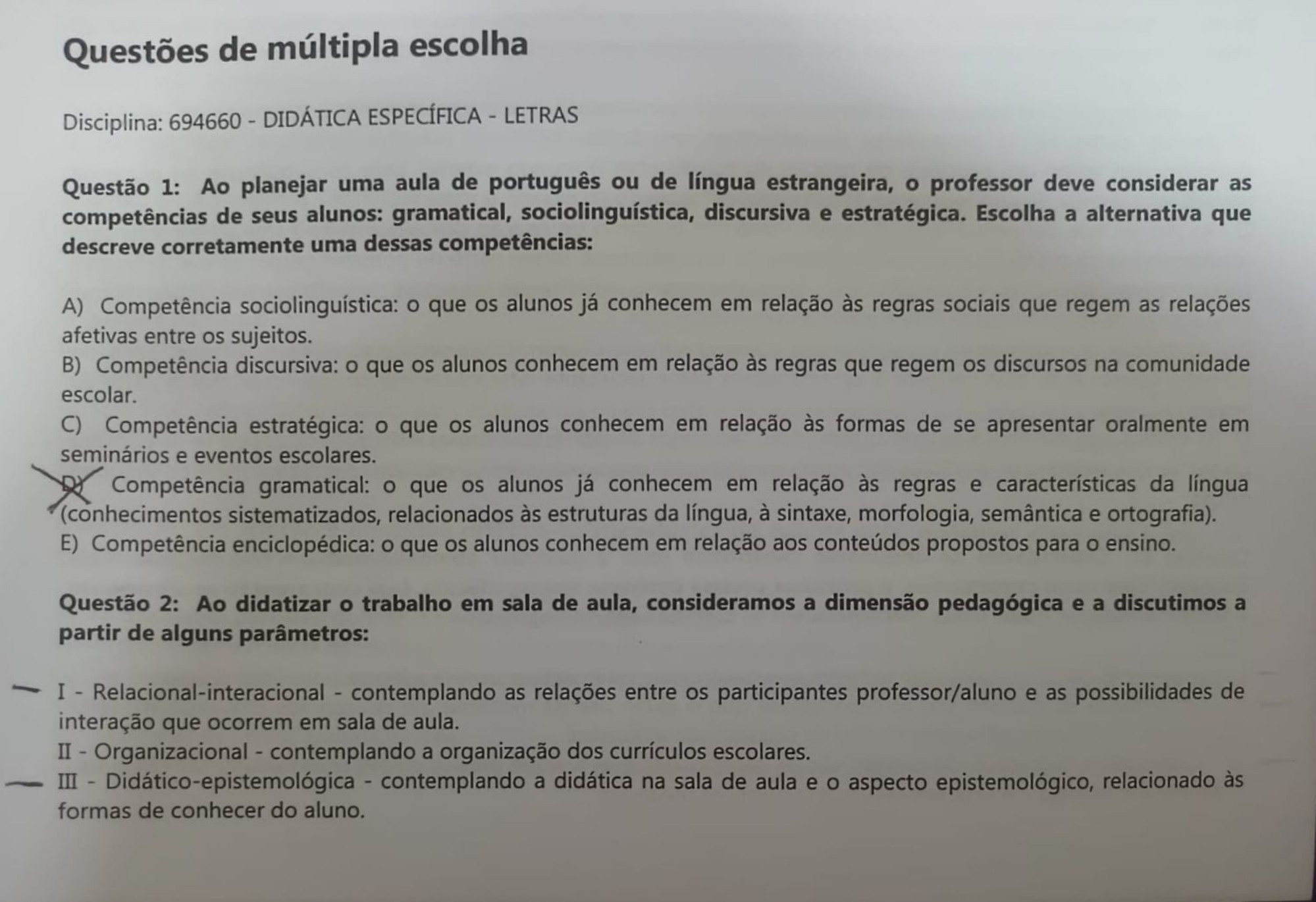 Questões de múltipla escolha Disciplina: 694660 DIDÁTICA ESPECÍFICA LETRAS Questão 1: Ao planejar uma aula de português ou de língua estrangeira, professor deve considerar as competências de seus alunos: gramatical, sociolinguística, discursiva e estratégica. Escolha a alternativa que descreve corretamente uma dessas competências: A) Competência sociolinguística: que os alunos já conhecem em relação às regras sociais que regem as relações afetivas entre sujeitos. B) Competência discursiva: que alunos conhecem em relação às regras que regem os discursos na comunidade escolar. C) Competência estratégica: o que os alunos conhecem em relação às formas de se apresentar oralmente em seminários e eventos escolares. D) Competência gramatical: o que os alunos já conhecem em relação às regras e características da língua (conhecimentos sistematizados, relacionados às estruturas da língua, à sintaxe, morfologia, semântica e ortografia). E) Competência enciclopédica: que os alunos conhecem em relação aos conteúdos propostos para ensino. Questão 2: Ao didatizar trabalho em sala de aula, consideramos a dimensão pedagógica e a discutimos a partir de alguns parâmetros: I contemplando as relações entre os participantes professor/aluno e as possibilidades de interação que ocorrem em sala de aula. II Organizacional contemplando a organização dos currículos escolares. III Didático-epistemológica contemplando a didática na sala de aula e o aspecto epistemológico, relacionado às formas de conhecer do aluno.IV Critico-dialógica contemplando desenvolvimento de habilidades para pensar criticamente e para dar consideração ao pensar do outro. Está(ão) correta(s) as afirmativas: A) Somente a Somente C) Somente D) Somente III. E) Somente a IV. Questão 3: Considerando-se a concepção dialógica de língua, as práticas didático-pedagógicas em sala de aula de lingua portuguesa ou de línguas estrangeiras: Não devem ter como foco os conteúdos das disciplinas; estes são, nessa visão, artefatos culturais ou instrumentos negociar que propiciam aos estudantes (sujeitos da atividade) contextos para produzir, compreender, interpretar, significados de situações de uso da linguagem necessárias ao seu desenvolvimento. B) Devem ter como foco conteúdo das disciplinas, pois estes propiciam aos estudantes (sujeitos da atividade) meios para obter resultados satisfatórios no contexto escolar. C) Devem ter como foco os conteúdos previstos no plano curricular, para que os estudantes (sujeitos da atividade) desenvolvam competências relacionadas aos mecanismos de resolução de situações-problema. D) Não devem ter como foco conteúdos específicos, mas considerar, de maneira holística, todo e qualquer conteúdo solicitado pelo aluno. E) Devem ter como foco conteúdos relacionados apenas à realidade de cada contexto escolar, pois dessa forma aluno tem maior possibilidade de participar de discussões e ampliar seu conhecimento linguístico. Questão 4: Vários autores discutem as teorias de aprendizagem. Segundo Bock (2001), essas teorias podem ser reunidas em dois grandes grupos: o condicionamento e o cognitivismo. É correto afirmar que: A) As teorias que definem a aprendizagem como um conjunto de procedimentos e conteúdos a serem trabalhados na escola fazem parte do primeiro grupo; as que definem a aprendizagem como atividades individuais e voltadas ao desenvolvimento de mecanismos para lidar com conteúdos complexos das áreas do conhecimento fazem parte do segundo grupo. As teorias que definem a aprendizagem por suas consequências comportamentais, enfatizando as condições ambientais como forças propulsoras da aprendizagem, fazem parte do primeiro grupo; as que definem a aprendizagem como um processo de relação do sujeito com mundo externo, com consequências no plano da organização interna do conhecimento, fazem parte do segundo grupo. C) As teorias que definem a aprendizagem como um processo de relação do sujeito com mundo externo, com consequências no plano da organização interna do conhecimento, fazem parte do primeiro grupo; as que definem a aprendizagem por suas consequências comportamentais, enfatizando as condições ambientais como forças propulsoras da aprendizagem, fazem parte do segundo grupo. D) As teorias que definem a aprendizagem como resultante de condicionamentos escolarizados fazem parte do primeiro grupo; já as que definem a aprendizagem como resultante interação entre os indivíduos fazem parte do segundo grupo. E) As teorias que definem a aprendizagem como resultante da interação entre os indivíduos fazem parte do primeiro grupo; as que definem a aprendizagem como resultante de condicionamentos escolarizados fazem parte do segundo grupo. Questão 5: Capacidades de linguagem constituem toda e qualquer atividade oral em sala de aula. Para trabalhar com essas capacidades, professor precisa conhecer seu significado. Leia com atenção as afirmativas a seguir: e indique quais delas correspondem às capacidades de linguagem: I Capacidades de ação: são as capacidades que aluno precisa mobilizar para se adaptar a um dado contexto. II Capacidades discursivas: são as capacidades que o aluno precisa mobilizar em relação aos diferentes modelos discursivos, ou seja, aos diferentes modos de organização discursiva. III Capacidades são as capacidades que aluno precisa mobilizar em relação às diferentes organizações textuais, ou seja, aos recursos linguísticos utilizados.A) Qual(is) afirmativa(s) lida(s) corresponde(m) às capacidades da linguagem? Apenas a afirmativa III. As afirmativas I, II e III. D) Apenas as afirmativas I e III. Apenas a afirmativa E) Apenas as afirmativas II e III. Questão 6: Por competência entendemos: A) que os alunos conhecem em relação aos usos escritos da em situações formais e escolarizadas. que os alunos conhecem em relação às regras socioculturais que regem uso da em rela