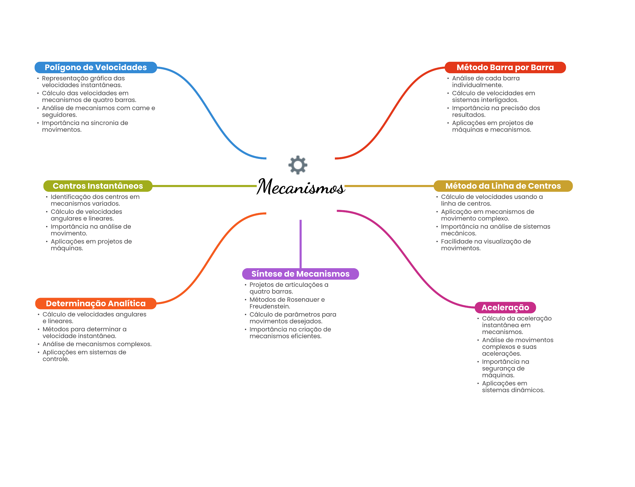 Polígono de Velocidades Método Barra por Barra Representação gráfica dos de cada barra velocidades Cálculo das velocidades em Cálculo de velocidades em mecanismos de quatro barras. sistemas de mecanismos com came e na precisão dos seguidores. resultados. importância na sincronia de Aplicações em projetos de movimentos. mecanismos. Centros Instantâneos Método da Linha de Centros Identificação dos centros em Cálculo de velocidades usando a variados. linha de centros. Cálculo de velocidades Aplicação em mecanismos de . lineares. movimento complexo. Importância na de na de movimento. Aplicações em projetos de Facilidade na de movimentos. Síntese de Mecanismos Projetos de articulações a quatro de Determinação Analítica Freudenstein. Aceleração Cáloulo de velocidades Cálculo de parâmetros para lineares. movimentos desejados. Cálculo da acaleração em Métodos para determinar a na criação de mecanismos. velocidade eficientes. de movimentos de complexos . em sistemas de controle. Importância na segurança de Aplicações em
