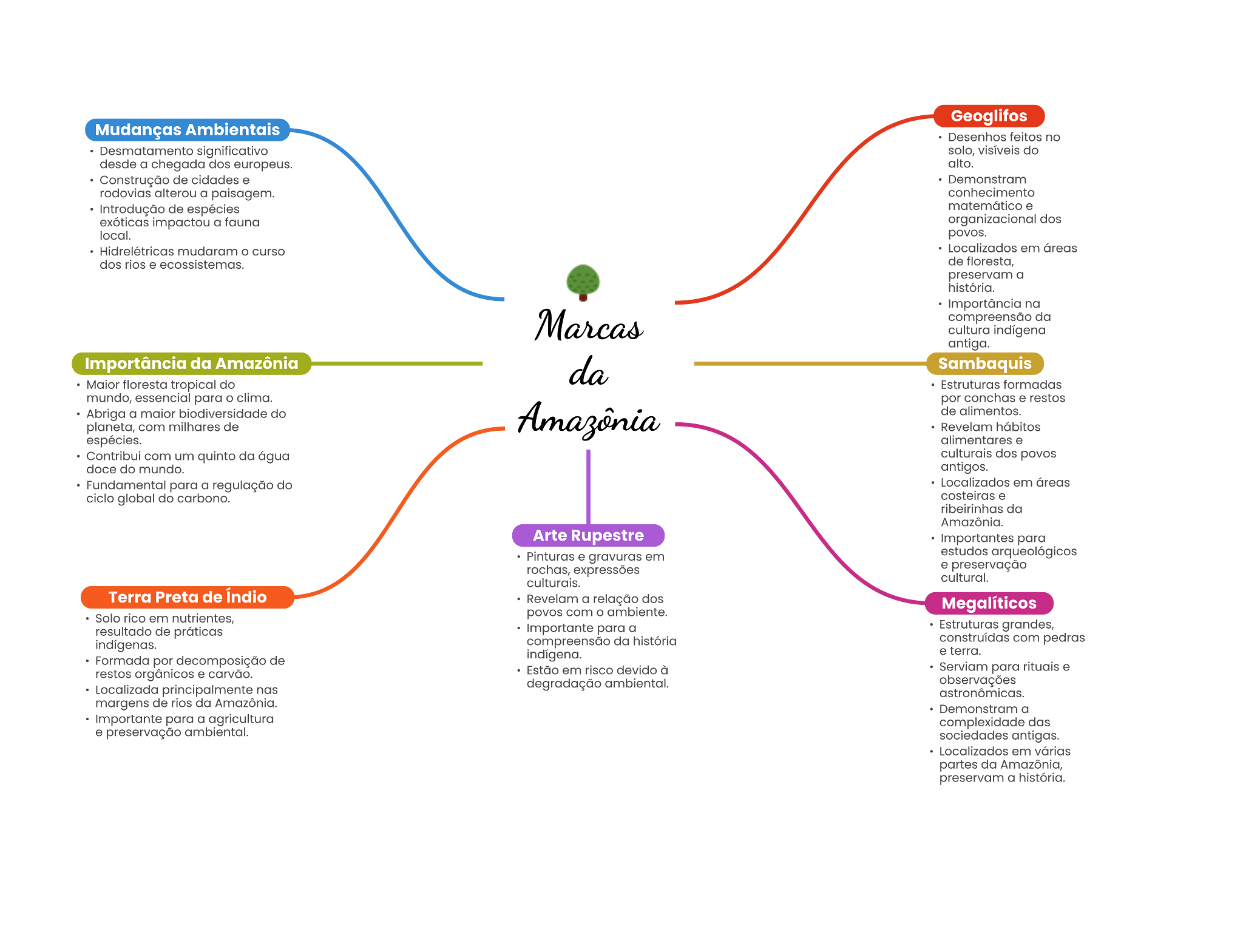 Geoglifos Mudanças Ambientais Desenhos feitos no significativo solo, do desde chegada dos alto. Construção de cidades alterou a palsagem. conhecimento de espécies . Impactou a fauna organizacional local. povos. mudaram curso em áreas dos de floresta, preservam a história. na compreensão da cultura antiga. Importância da Amazônia Sambaquis floresta tropical do Estruturas formadas mundo, para clima. por conchas Abriga a maior do de alimentos. planeta, com milhares de Revelam Contribui com um quinto da água dos povos doce do mundo. antigos. Fundamental para a regulação do Localizados em ciclo global do carbono. costeiras ribeirinhas da Amazônia. Arte Rupestre para Pinturas gravuras em estudos rochas, expressões preservação cultural. Terra Preta de Índio a relação dos Solo rico em nutrientes, povos com Megalíticos resultado de práticas Importante para a Estruturas grandes, compreensão da história com Indigena. terra. Formada por decomposição de carvão. Estão em risco devido para . nas degradação ambiental. observações de rice da Demonstram a para agricultura complexidade das . preservação ambiental. sociedades antigos. em partes da Amazônia, preservam a