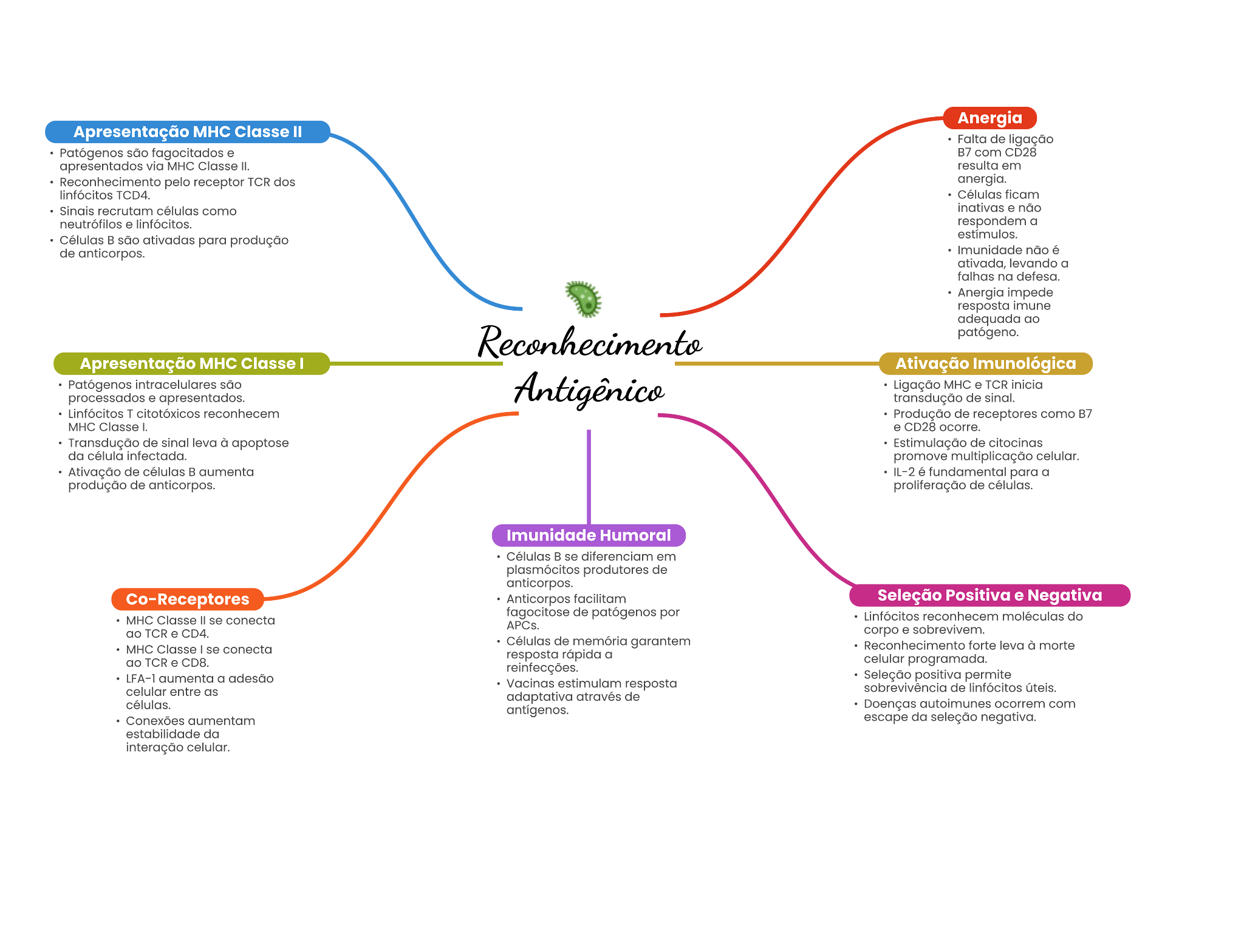 Anergia Apresentação Classe II de fagocitados B7 com CD28 apresentados via MHC resulta em Reconhecimento pelo receptor TCR dos anergia. TCD4. recrutam células como Inativas . não . respondem a ativadas para produção de não ativada, a na Anergia Imune adequada Apresentação Classe I Ativação Imunológica Ligação MHC e TCR Inicia processados apresentados. transdução de T reconhecem Produção de receptores como B7 MHC Classe L CD28 ocorre. Transdução de leva à apoptose Estimulação de citocinas da célula promove multiplicação Ativação de aumenta L-2 é para a produção de anticorpos. de Imunidade Humoral em produtores de anticorpos. Co-Receptores Anticorpos facilitam Seleção Positiva e Negativa MHC Classe I fagocitose de patógenos por reconhecem moléculas do TCR corpo sobrevivem. MHC Classe I conecta de memória garantem Reconhecimento forte leva a resposta a ao TCR programada. reinfecções. LFA-1 aumenta a adesão positiva permite celular entre Vacinas estimulam resposta sobrevivência de adaptativa de células. Doenças autoimunes com Consxões da seleção negativa. da interação