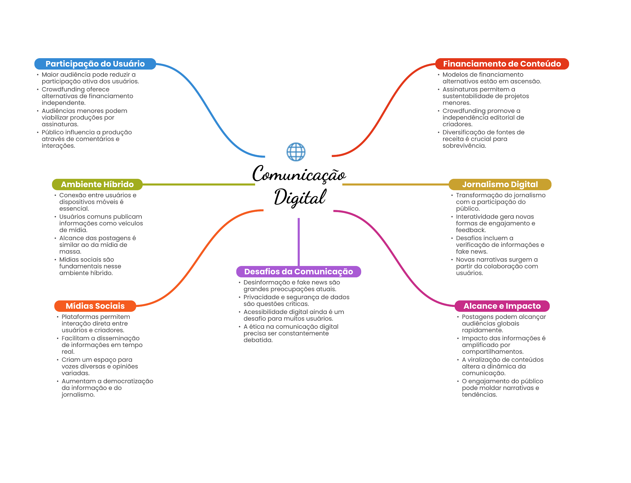 Participação do Usuário Financiamento de Conteúdo audiência pode reduzir a Modelos de financiamento participação ativa dos alternativos estão em Crowdfunding oferece Assinaturas permitem a alternativas de financiamento de projetos independents. menores. Audiências menores podem Crowdfunding promove a viabilizar produções por independência editorial de assinaturas. criadores. Público a produção Diversificação de fontes de atravée de comentários . receita para sobrevivência. Ambiente Híbrido Jornalismo Digital entre usuários e Transformação do dispositivos é com a participação do essencial. público. Usuários comune publicam gera novas informações como veículos formas de de Alcance das postagens é a similar ao da de verificação de informações massa. fake news. são Novas surgem a fundamentais nesse partir da colaboração com ambiente hibrido. Desafios da Comunicação usuários. Desinformação fake news preocupações Privacidade segurança de dados Mídias Sociais questões criticas. Alcance e Impacto digital é um Plataformas permitem para usuários. Postagens podem alcançar interação direta entre A ética na comunicação digital . criadores. precisa ser constantemente rapidaments. Facilitam a disseminação debatida. impacto das é de Informações em tempo por real. Criam um espaço para A de VOZES . altera a da variadas. comunicação. a democratização engajamento do público da . do pode moldar tendências.
