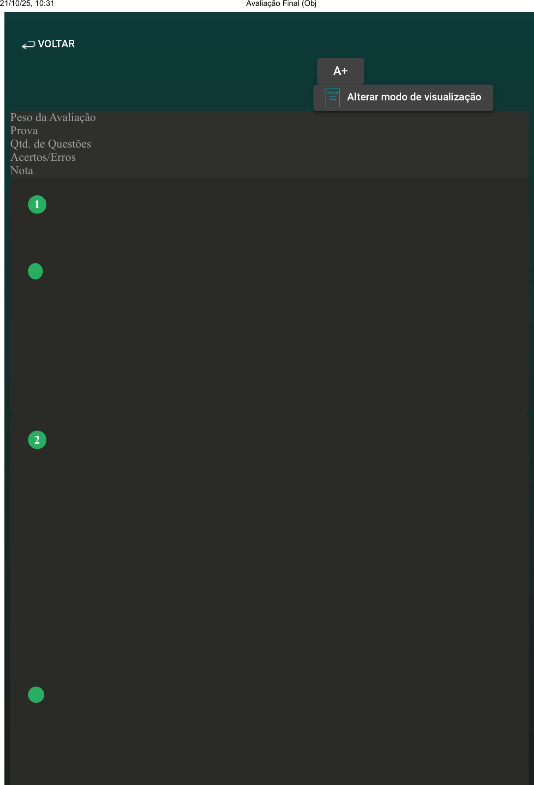 Prova Impressa GABARITO | Avaliação Final (Objetiva) - Individual (Cod.:1522680) Peso da Avaliação 4,00 Prova 104603761 Qtd. de Questões 10 Acertos/Erros 10/0 Nota 10,00 Os conteúdos ensinados devem se articular com a metodologia adotada para a criança desenvolver o seu potencial. O uso de técnicas lúdicas, como jogos, brinquedos e brincadeiras, quando direcionadas de forma pedagógica, estimulam os alunos na construção do pensamento lógico- matemático. Diante disso, assinale a alternativa CORRETA: A O conteúdo dos jogos deve estar de acordo com a faixa etária e com o grau de desenvolvimento dos alunos. B Os jogos escolhidos devem ser sempre de resolução fácil, porque jogos complexos desestimulam os alunos. C O lúdico não pode ser utilizado como estratégia de ensino, porque eles não ajudam na apresentação de um novo conteúdo matemático. D Os jogos utilizados em sala de aula não devem ter um caráter pedagógico, pois esta ferramenta deve ser usada somente de forma lúdica. De acordo com os Parâmetros Curriculares Nacionais, o ensino da matemática foi dividido em primeiro e segundo ciclo no caso do ensino fundamental. O primeiro ciclo tem como objetivo aproximar o aluno das operações, dos números, das medidas, das formas e dos espaços, além de estabelecer vínculos com os conhecimentos que o aluno trás de casa. Os conteúdos do primeiro ciclo foram divididos em conceituais, procedimentais e atitudinais. Com relação aos conteúdos conceituais e procedimentais para este ciclo, analise as opções a seguir: I- Números naturais e sistemas de numeração decimal. II- Números naturais. III- Números racionais. IV- Espaço e forma. V- Tratamento da informação. Assinale a alternativa CORRETA: FONTE: http://portal.mec.gov.br/seb/arquivos/pdf/livro01.pdf. Acesso em: 21 jan. 2020. A As opções I, II, III e IV estão corretas. B As opções I, II, IV e V estão corretas. C As opções III, IV e V estão corretas. VOLTAR A+ Alterar modo de visualização 1 2 21/10/25, 10:31 Avaliação Final (Objetiva) - Individual about:blank 1/5 D As opções II, III, IV e V estão corretas. Para auxiliar os professores, os PCNs estabelecem sete critérios de avaliação de Matemática para o segundo ciclo. A respeito deles, assinale a alternativa CORRETA: A Realizar cálculos, com o suporte da calculadora, envolvendo números naturais e racionais (apenas na representação decimal). B Condensar e desfazer as estimativas sobre comprimento, utilizando unidades e instrumentos de medida mais usuais e que melhor se ajustem à natureza da medição realizada. C Ler, escrever números naturais e ordinais, ordenar números inteiros na forma decimal, pela interpretação do valor posicional de cada uma das ordens. D Resolver situações-problema que envolvam contagem, medidas, os significados das operações, utilizando estratégias pessoais de resolução e selecionando procedimentos de cálculo. Percebe-se que os alunos possuem uma grande dificuldade em relacionar os conteúdos teóricos ensinados em sala de aula com situações práticas diárias. Para tentar solucionar essas dificuldades, é necessário que o professor desenvolva novas metodologias como estratégias didáticas. Diante desse contexto, assinale a alternativa CORRETA: A As metodologias e os livros didáticos utilizados nas escolas para ensinar a matemática atendem às demandas da sociedade moderna. B As tecnologias estão presentes em nossas vidas e a matemática ensinada na sala de aula possui uma conexão com esse mundo informatizado. C É necessário que o professor modifique suas metodologias, aderindo ao uso das novas tecnologias para que o aluno estabeleça o conhecimento adquirido com situações do cotidiano. D Os professores, ao ensinar a matemática, abordam com muita frequência conteúdos que envolvem as noções de estatística e geometria. Na Brinquedoteca, buscamos a construção de um trabalho formativo de aprendizagem, pesquisa e ensino, que potencializará o desenvolvimento integral das crianças em seus diferentes espaços, denominados de cantinhos. Sobre o que são e para que servem os populares cantinhos pedagógicos, assinale a alternativa CORRETA: A São ambientes facilitadores que possibilitam interações e aprendizagens, que auxiliam em todas as linguagens, nas diferentes faixas etárias. B São espaços nos quais as crianças que apresentam dificuldades comportamentais ou de aprendizagem são atendidas em suas necessidades, de forma concreta. C São espaços lúdicos, sem nenhuma finalidade pedagógica, em que a criança pode brincar livremente, sem preocupação com a aprendizagem. 3 4 5 21/10/25, 10:31 Avaliação Final (Objetiva) - Individual about:blank 2/5 D São ambientes adaptados a partir da imitação da vida real (dos adultos) para o desenvolvimento das crianças, sem a mediação do professor. A inteligência lógico-matemática é apenas uma das inteligências múltiplas, defendidas por Howard Gardner. Dentre elas, podemos destacar ainda: linguística, espacial, musical, cenestésico- corporal, naturalista, intrapessoal e interpessoal. Com relação a algumas destas múltiplas inteligências, associe os itens, utilizando o código a seguir: I- Lógico-matemática. II- Espacial. III- Linguística. IV- Musical. V- Cinestésica corporal. ( ) Essa inteligência se manifesta por meio da linguagem gestual ou corporal, na mímica, nos artistas e nos atletas. ( ) Essa inteligência destaca-se nas pessoas criativas com palavras orais ou escritas, transformando imagens em palavras. ( ) Essa inteligência encontra-se muito presente nas pessoas que localizam-se com facilidade em mapas, plantas ou representações planas. ( ) Essa inteligência tem relação com números, cálculos e raciocínios dedutivos, com muita competência. ( ) Essa inteligência refere-se à percepção do mundo sonoro, na forma de viver e compreender o mundo. Assinale a alternativa que apresenta a sequência CORR