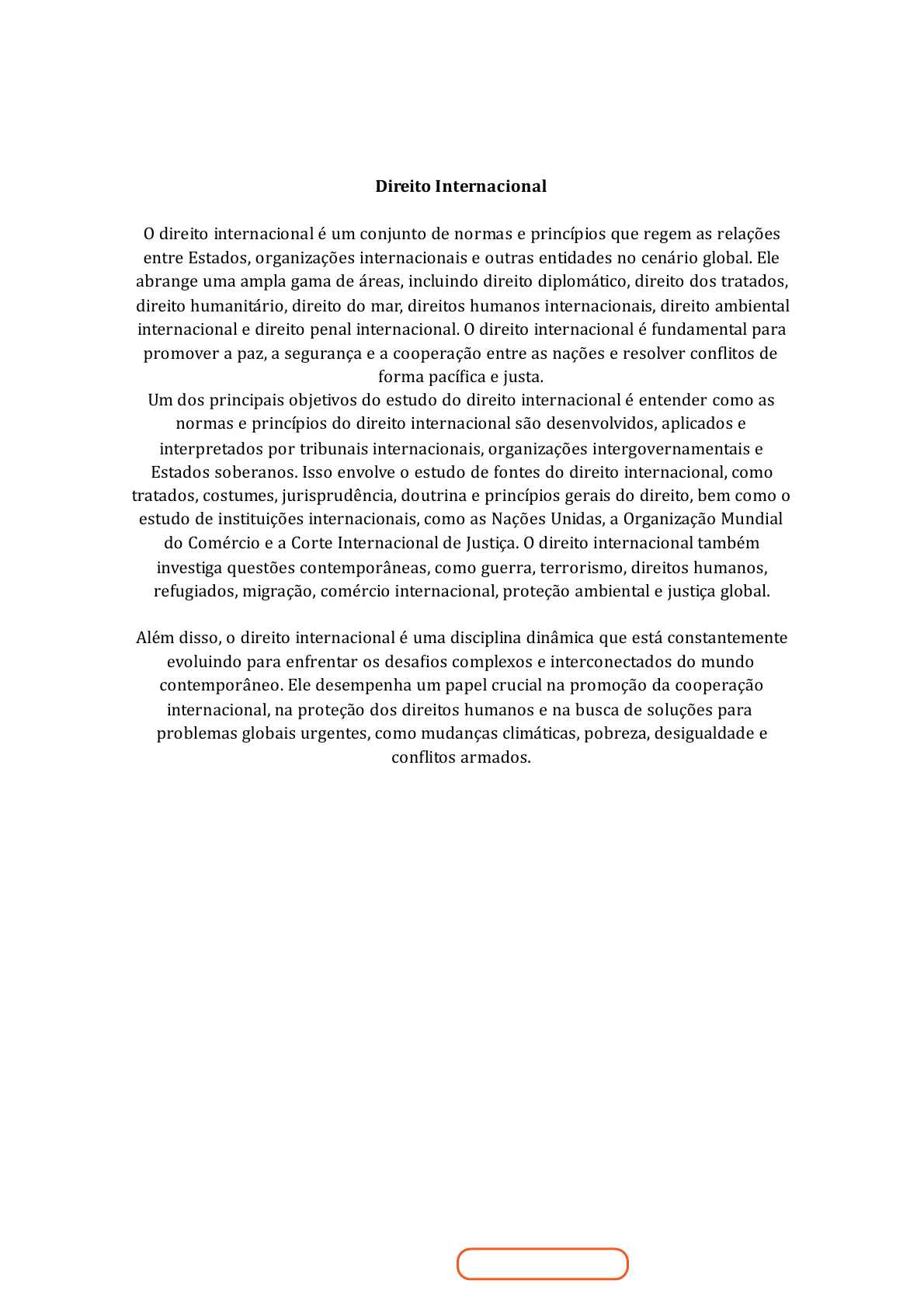 Impresso por Bruno Santos, E-mail andradesantos.bruno@gmail.com para uso pessoal e privado. Este material pode ser protegido por direitos autorais e não pode ser reproduzido ou repassado para terceiros. 21/10/2025, 10:56:33 DireitoInternacional O direito internacional e um conjunto de normas e princıpios que regem as relaço es entre Estados, organizaço es internacionais e outras entidades no cena rio global. Ele abrange uma ampla gama de a reas, incluindo direito diploma tico, direito dos tratados, direito humanita rio, direito do mar, direitos humanos internacionais, direito ambiental internacional e direito penal internacional. O direito internacional e fundamental para promover a paz, a segurança e a cooperaçao entre as naço es e resolver conlitos de forma pacıica e justa. Um dos principais objetivos do estudo do direito internacional e entender como as normas e princıpios do direito internacional sao desenvolvidos, aplicados e interpretados por tribunais internacionais, organizaço es intergovernamentais e Estados soberanos. Isso envolve o estudo de fontes do direito internacional, como tratados, costumes, jurisprudencia, doutrina e princıpios gerais do direito, bem como o estudo de instituiço es internacionais, como as Naço es Unidas, a Organizaçao Mundial do Come rcio e a Corte Internacional de Justiça. O direito internacional tambem investiga questo es contempora neas, como guerra, terrorismo, direitos humanos, refugiados, migraça o, come rcio internacional, proteçao ambiental e justiça global. Alem disso, o direito internacional e uma disciplina dinamica que esta constantemente evoluindo para enfrentar os desaios complexos e interconectados do mundo contemporaneo. Ele desempenha um papel crucial na promoçao da cooperaçao internacional, na proteçao dos direitos humanos e na busca de soluço es para problemas globais urgentes, como mudanças clima ticas, pobreza, desigualdade e conlitos armados. Acesso vitalício + 1 ano de benefícios! Aproveitar oferta Acesso vitalício + 1 ano de benefícios! Aproveitar oferta