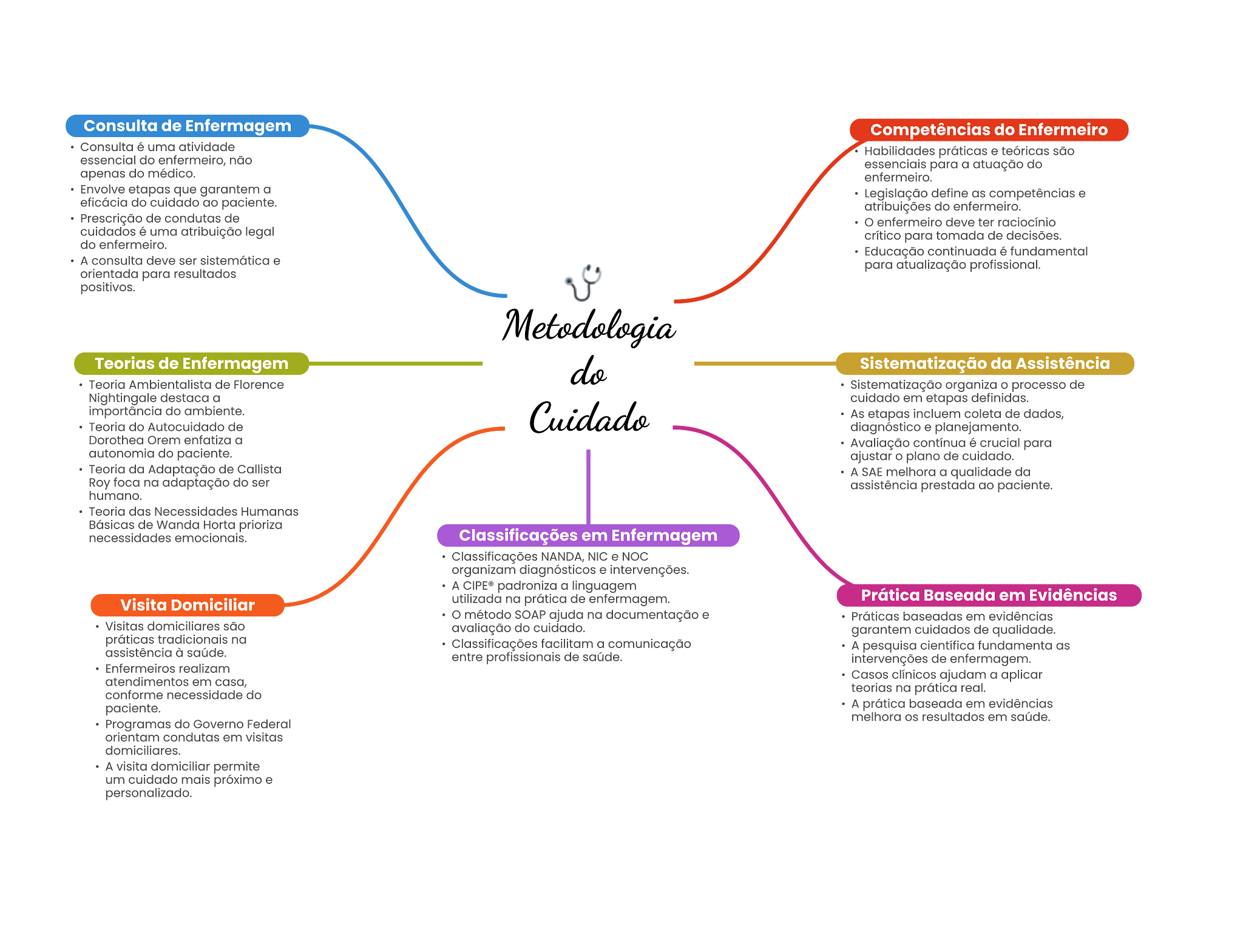 Consulta de Enfermagem Competências do Enfermeiro Consulta uma atividade Habilidades práticas teóricas são essencial do enfermeiro, não para a atuação do apenas do médico. Envolve que garantem a define as competências . do cuidado paciente. do Prescrição de condutge de deve ter raciocínio uma atribuição legal critico para tomada de decisões. do Educação continuada fundamental A consulta deve ser para para resultados positivos. Teorias de Enfermagem Sistematização da Assistência Teoria Ambientalista de Florence Sistematização organiza processo de Nightingale destaca a em etapas definidas. do As coleta de dados, Teoria do Autoculdado de Dorothea Orem a Avaliação continua para autonomia do de Teoria da Adaptação de A SAE a qualidade da Roy foca na adaptação do ser assistência paciente. humano. Teoria Necessidades de Wanda Horta prioriza necessidades Classificações em Enfermagem Classificações NANDA, NIC NOC organizam diagnósticos A a linguagem utilizada na prática de enfermagem. Prática Baseada em Evidências Visita Domiciliar método SOAP ajuda na documentação e baseadas em evidências são avaliação do cuidado. garantem de qualidade. práticas tradicionale na facilitam a comunicação assistência à A cientifica fundamenta as entre de de enfermagem. Enfermeiros realizam atendimentos em Casos ajudam a aplicar conforme necessidade do na prática real. A baseada em evidências resultados em Programas do Governo Federal condutas em visitos domiciliares. A visita permite um cuidado personalizado.