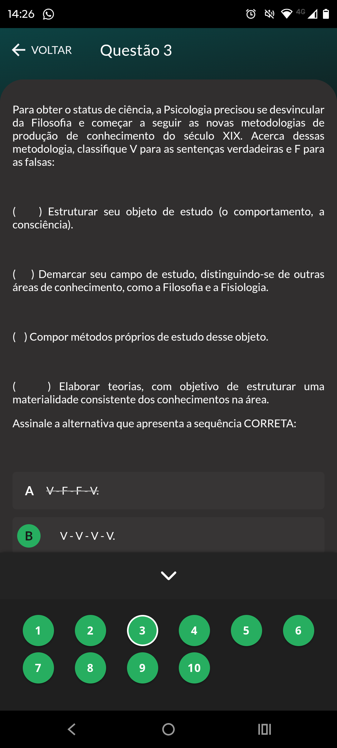 14:26 L 4G VOLTAR Questão 3 Para obter o status de ciência, a Psicologia precisou se desvincular da Filosofia e começar a seguir as novas metodologias de produção de conhecimento do século XIX. Acerca dessas metodologia, classifique V para as sentenças verdadeiras e F para as falsas: ( ) Estruturar seu objeto de estudo comportamento, a consciência). ( ) Demarcar seu campo de estudo, distinguindo-se de outras áreas de conhecimento, como a Filosofia e a Fisiologia. Compor métodos próprios de estudo desse objeto. ( ) Elaborar teorias, com objetivo de estruturar uma materialidade consistente dos conhecimentos na área. Assinale a alternativa que apresenta a sequência CORRETA: V-F-F-V. B V-V-V-V. 1 2 3 4 5 6 7 8 9 10