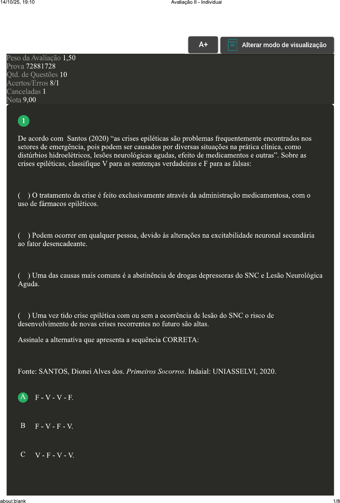 14/10/25, 19:10 Avaliação Individual A+ Alterar modo de visualização Peso da Avaliação 1,50 Prova 72881728 Qtd. de Questões 10 Acertos/Erros 8/1 Canceladas 1 Nota 9,00 1 De acordo com Santos (2020) "as crises epiléticas são problemas frequentemente encontrados nos setores de emergência, pois podem ser causados por diversas situações na prática clínica, como distúrbios hidroelétricos, lesões neurológicas agudas, efeito de medicamentos e outras". Sobre as crises epiléticas, classifique V para as sentenças verdadeiras e F para as falsas: tratamento da crise é feito exclusivamente através da administração medicamentosa, com o uso de fármacos epiléticos. Podem ocorrer em qualquer pessoa, devido às alterações na excitabilidade neuronal secundária ao fator desencadeante. Uma das causas mais comuns é a abstinência de drogas depressoras do SNC e Lesão Neurológica Aguda. Uma vez tido crise epilética com ou sem a ocorrência de lesão do SNC o risco de desenvolvimento de novas crises recorrentes no futuro são altas. Assinale a alternativa que apresenta a sequência CORRETA: Fonte: SANTOS, Dionei Alves dos. Primeiros Socorros. Indaial: UNIASSELVI, 2020. A F-V-V-F. B F-V-F-V. V-F-V-V. - about:blank 1/814/10/25, 19:10 Avaliação Individual D V-F-F-V. 2 Comumente chamado de desmaio, a síncope é definida como a perda súbita da consciência aliado com a perda do tônus postural, e se deve à diminuição ou rápida interrupção do fluxo sanguíneo cerebral. Sobre as causas mais frequentes, associe os itens, utilizando o código a seguir: I- Mediada por reflexo. II- Hipotensão ortostática. III- Hipovolemia. Implica na falência do sistema nervoso autônomo e é caracteriza-se por redução da Pressão Arterial Sistólica (PAS) ≥ 20 mmHg ou Pressão Arterial Diastólica (PAD) ≥ 10 mmHg, após três minutos em posição sentada (depois de repouso de cinco minutos em posição supina). É a mais frequente do grupo e refere-se a alterações nos reflexos de bradicardia e/ou vasodilatação periférica. Refere-se à diminuição do volume sanguíneo, em específico da parte líquida do sangue (plasma). Assinale a alternativa que apresenta a sequência CORRETA: A III II I. B I II III. I III II. D II I III. Revisar Conteúdo do Livro 3 Também chamado de infarto agudo do miocárdio ou ataque cardíaco, o infarto pode ser fatal. De acordo com Nicolau et al. (2021), no ano de 2017, o Infarto Agudo do Miocárdio (IAM) foi a principal causa de morte no Brasil e no mundo, representando 10,2% das internações no Sistema about:blank 2/814/10/25, 19:10 Avaliação Individual Único de Saúde (SUS), sendo mais prevalente em pacientes com idade superior a 50 anos. Sobre o exposto, avalie as asserções a seguir e a relação proposta entre elas: I- coração é um órgão muscular, oco e central do sistema cardiovascular, funciona como uma bomba contrátil-propulsora, bombeando sangue por todo o corpo até chegar a todas as células em que será feita a troca de materiais. Assim como qualquer órgão do corpo, o coração também recebe suprimento sanguíneo, mas por uma via própria, denominada circulação coronária (cardíaca). PORQUE II- Quando existe a diminuição ou falta de suprimento sanguíneo que é levado ao músculo miocárdio, por obstrução parcial ou completa do fluxo de sangue em uma artéria coronária, devido à formação de um coágulo sanguíneo ou placas de ateroma, temos como resultado o Infarto Agudo do Miocárdio (IAM). Assinale a alternativa CORRETA: Fonte: NICOLAU, J. et al. Diretrizes da Sociedade Brasileira de Cardiologia sobre Angina Instável e Infarto Agudo do Miocárdio sem Supradesnível do Segmento ST 2021. Arq. Bras. Cardiol., V. 117, n. 1, 181-264, jul. 2021. A As asserções I e II são proposições falsas. A asserção I é uma proposição falsa, e a II é uma proposição verdadeira. As asserções I e II são proposições verdadeiras, e a II complementa a I. D As asserções I e II são proposições verdadeiras, mas a II não é uma justificativa da I. 4 Infarto Agudo do Miocárdio (IAM) é ocasionado pela falta de suprimento sanguíneo a alguma parte do músculo cardíaco, que ocorre devido à obstrução total ou parcial das artérias que irrigam o coração, as artérias coronárias. Assinale a alternativa CORRETA que apresenta as principais características do IAM: IAM é caracterizado por uma dor prolongada na região subesternal irradiando para o pescoço, ombro e braço esquerdo, podendo irradiar para o pescoço, costas e maxilar. about:blank 3/814/10/25, 19:10 Avaliação Individual B IAM é caracterizado pela perda da consciência e desmaio. Cansaço, palpitação e desmaios são os principais pontos que caracterizam o infarto agudo do miocárdio. D IAM é caracterizado pela perda súbita da fala ou dificuldade para se comunicar e compreender o que se diz, perda da visão ou dificuldade para enxergar com um ou ambos os olhos. 5 Conforme Santos (2021) o sangue está contido em um sistema fechado, nominado como "Sistema Circulatório", que permite a sua circulação no interior dos vasos sanguíneos, os quais são representados pelas veias, capilares e artérias. Sobre o sistema cardiovascular e sanguíneo, classifique V para as sentenças verdadeiras e F para as falsas: ( ) coração é o órgão central do sistema cardiovascular, responsável pelo bombeamento de todo o sangue pelo corpo. sistema circulatório, tem função de transporte de gases, nutrientes, produtos metabólicos e hormônios para todo o corpo. ( ) sangue é um tecido conjuntivo viscoso e denso com uma temperatura aproximada de 38 °C. sangue, está constituído por uma parte líquida denominada plasma (55%) e uma parte celular, os elementos figurados (45%). Assinale a alternativa que apresenta a sequência CORRETA: A V-V-V-V. B V-F-V-F. V-F-F-V. D F-F-V-V. 6 Usualmente chamada de desmaio, a síncope é uma condição que pode ocorrer a qualquer moment