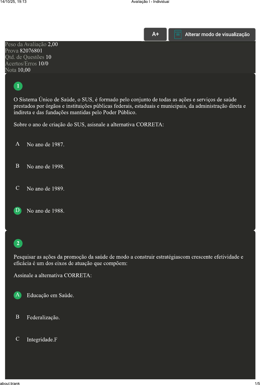 14/10/25, 19:13 Avaliação - Individual A+ Alterar modo de visualização Peso da Avaliação 2,00 Prova 82076801 Qtd. de Questões 10 Acertos/Erros 10/0 Nota 10,00 1 Sistema Único de Saúde, o SUS, é formado pelo conjunto de todas as ações e serviços de saúde prestados por órgãos e instituições públicas federais, estaduais e municipais, da administração direta e indireta e das fundações mantidas pelo Poder Público. Sobre o ano de criação do SUS, asisnale a alternativa CORRETA: A No ano de 1987. B No ano de 1998. No ano de 1989. D No ano de 1988. 2 Pesquisar as ações da promoção da saúde de modo a construir estratégiascom crescente efetividade e eficácia é um dos eixos de atuação que compõem: Assinale a alternativa CORRETA: A Educação em Saúde. B Federalização. Integridade.F about:blank 1/514/10/25, 19:13 Avaliação Individual D Descentralização. 3 A intersetorialidade tem como organização do trabalho as equipes intersetoriais, que objetivam identificar necessidades e demandas da população, planejar, orientar e avaliar ações integradas, com a definição de objetivos, metas e indicadores de qualidade de vida. Sobre a intersetorialidade, assinale a alternativa CORRETA: A A intersetorialidade é organizada a partir de processos estruturados na saúde individual, com a interação de apenas um segmento, um setor. B Os espaços da intersetorialidade são lugares de compartilhamento de resultados de tratamento positivos no processo de saúde-doença. A ação intersetorial se efetiva nas ações coletivas e, para que esse processo funcione, é preciso a articulação de diversos setores sociais, instituições e pessoas para articular saberes e experiências, estabelecendo um conjunto de relações, construindo uma rede. É uma nova estratégia de trabalho e construção de políticas públicas, em que cada indivíduo tem D a possibilidade de atenção à saúde exclusivamente individual, com um profissional que o acompanhará por toda sua vida. 4 A Reforma Sanitária foi um movimento que se originou na década de 1960 em meio: Assinale a alternativa CORRETA: A À peste negra. À constituição federal. À crise econômica. D À Ditadura Militar. 5 Dentre as ações utilizadas para promoção da saúde destacam-se as intervenções educativas, as quais representam fatores predisponentes de adesão ao tratamento e reabilitação, bem como estímulo para atitudes positivas do usuário para o autocuidado. Sobre as intervenções educativas sobre modificações de estilos de vida individuais, assinale a alternativa CORRETA: about:blank 2/514/10/25, 19:13 Avaliação Individual A Gestão de saúde. B Intervenção de saúde. Prevenção de saúde. D Promoção de saúde. 6 Podemos usar a educação em saúde como um instrumento importante por possibilitar o acesso às informações e assim proporcionar conhecimentos necessários à mudança de hábitos que favoreçam a manutenção da saúde. Acerca da educação em saúde e o que seus objetivos favorecem, classifique V para as opções verdadeiras e F para as falsas: Integralidade. Participação social. ( ) Intersetorialidade. Autonomia. Assinale a alternativa que apresenta a sequência CORRETA: A F-V-V-F. V-F-F-V. V-F-V-V. D V-V-V-V. 7 Atualmente é considerada Saúde Pública todo o conjunto de medidas executadas pelo Estado para garantir o bem-estar físico, mental e social da população. Em nível internacional, a saúde pública é coordenada pela Organização Mundial de Saúde OMS, composta atualmente por 194 países. Sobre a Saúde Publica, assinale a alternativa CORRETA: A É um braço da Saúde Pública, foi criada por profissionais atuantes dentro da Saúde Pública, e que auxiliou na construção e concretização do Sistema Único de Saúde SUS. B Foco na diversidade e especificidade dos grupos populacionais. about:blank 3/514/10/25, 19:13 Avaliação Individual É planejada de acordo com as necessidades de cada região. D É de dever de o Estado assegurar serviços e políticas públicas para a promoção e bem-estar da população. 8 A interação verbal entre os sujeitos é possível por meio das palavras e pode ser realizada por meio da fala e/ou de escrita. Dependendo da situação comunicativa, os usuários das línguas podem eleger qualquer um dos diferentes níveis de linguagem para interagir verbalmente com os outros. Assinale a alternativa CORRETA que está de acordo com os níveis de comunicação verbal relacionados a um ambiente favorável: A Igreja; ONGs; Hipermercado. B Governo; ONGs; Setores privados. Parceiro; família; e pares. D Lideres e provedores. 9 A trajetória histórica da saúde coletiva brasileira nos remete para a segunda metade dos anos 50, numa conjuntura pós-Segunda Guerra Mundial, em que a situação econômica do país se esforçava para agregar potência no trabalho, melhorar a economia e no setor da saúde, programas de saneamento e seguridade social se solidificavam (NUNES, 1994). A respeito do exposto, associe os itens, utilizando o código a seguir: I- Movimento Preventivista. II- Medicina Social. III- Saúde Coletiva. Estimulava o entendimento de que a problematização da saúde é um tanto enigmática, de grande alcance e que necessitava transcender as práticas biológicas para viabilizar uma ampliação, interação e reestruturação do campo da saúde para poder atender às exigências populacionais, éticas e políticas que a hegemonia dos saberes biológico já não abrangia em sua totalidade. Embasava num trabalho profilático da instalação de futuras doenças no âmbito social com uma visão sobre a coletividade, tinha pretensão de instaurar a compreensão sobre os cuidados com a higiene e reavaliar as práticas e educação médicas. seu surgimento fomentou futuramente a própria saúde pública, e seus princípios geraram grande alvoroço na área da saúde, pois trouxe em sua bagagem todas as lutas sociais de outrora. about:blank 4/