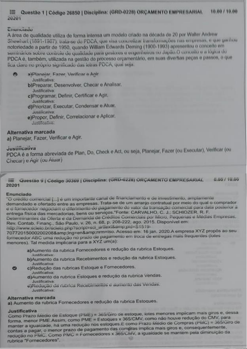Questão 1 Código 26850 Disciplina: (GRD-0228) ORÇAMENTO EMPRESARIAL 10.00 20201 A área de qualidade utiliza de forma intensa um modelo criado na década de 20 por Walter Andrew Shewhart do que visa empresas, que notoriedade a partir de 1950, quando William Edwards Deming (1900-1993) apresentou em qualidade para engenheiros no Japão.O do PDCA também, utilizada na gestão do processo em suas peças passos, que ciaro no próprio significado das PDCA, qual Verificar Agir Justificativa: Desenvolver, Checar 0 Justificativa: Definir, Certificar e Justificativa: d)Priorizar, Executar, Condensar Atuar, e)Propor, Definir, Correlacionar Justificative: Alternativa marcada a) Planejar, Fazer, Verificar e Agir. PDCA é a forma abreviada de Plan, Do, Check e Act, ou seja, Planejar, Fazer (ou Verificar (ou Checar) e Agir (ou Questão Codigo 30369 Disciplina: ORÇAMENTO EMPRESARIAL 0.00 10.00 20201 Enunciado crédito comercial um importante de financiamento e investimento, demandado e ofertado entre as empresas. Trata-se de um arranjo contratual por meio do qual comprador pagamento valor da para data entrega física das mercadorias, bens ou serviços. "Fonte: CARVALHO, C. J.; SCHIOZER, R.F. Determinantes da da de Créditos por Micro, Rev. Contab. São Paulo, 26, n. 68, p. 208-222, 2015. Disponível em: Acesso em: 16 2020.A empresa XYZ propôs ao seu ABC uma redução no prazo de pagamento em troca de entregas mais frequentes menores). Tal medida implicaria para a XYZ um(a): a)Aumento da rubrica Fornecedores e redução da rubrica Estoques. Justificativa: b)Aumento da rubrica Recebimentos e redução da rubrica Estoques. Justificativa: c)Redução das rubricas Estoque e Fornecedores. Justificativa: d)Aumento da rubrica Estoques e redução da rubrica Vendas. Justificativa: das Justificativa: Alternativa marcada a) Aumento da rubrica Fornecedores e redução da rubrica Estoques. Justificativa Como Prazo Médio de Estoque (PME) = 365/Giro de estoque, menores impiicam mais giros e, dessa forma, menor PME.Assim, como PME = Estoques 365/CMV, como não houve redução do CMV, para manter a iguaidade, uma redução nos estoques.E como Prazo Médio de Compras (PMC) = 365/Giro de contas a pagar, menor prazo de pagamento das compras implica mais giros e, consequentemente, redução no PMC. Como PMC = Fornecedores a iguaidade se mantém diminuição da rubricaQuestão 30270 (GRD-0228) ORÇAMENTO EMPRESARIAL 0.00 20201 Enunciado "O estudo da liquidez requer persistência e Em finanças e no mercado, liquidez é um importante para avaliar desempenho da empresa e, consequentemente, a continuidade de suas C.A. T. valor da um estudo empresas brasileiras do setor de energia REAd. Rev. Porto Alegre, 23, n. 1, p.118-136, abr. 2017. Disponívei em: Acesso em: 10 jan. Nesse sentido, o orçamento do de caixa mostra-se como peça fundamental de Um dos métodos existentes de de caixa é a partir dos lançamentos contábeis, ajustando-os de acordo com o diferimento dos recebimentos ou pagamentos. Tai método denominado: Justificativa: blem duas fases. Justificativa: Justificativa: d)partidas dobradas. Justificativa: e)de tesoura. Alternativa marcada c) operacional. Justificativa Há duas formas de calcular o fluxo de caixa de uma empresa: método direto e método No caso, de a Tesouraria monitora as entradas e de caixa (muitas vezes, em bases diárias) e projeta primeiro fiuxo caixa com base em tais informações. Por exemplo, se a empresa XYZ efetua uma venda 300.000,00, recebendo 70% à vista, tendo custos e despesas de R$ pagos 50% de R$ representaria uma entrada de caixa de 210.000,00 (70% da receita) e uma saida de R$ 100.000,00 à vista, isso (50% dos custos e despesas), refietindo, portanto, em uma variação no fiuxo de caixa de R$ método indireto, o fluxo de caixa é preparado a partir dos lançamentos ajustando-os no com diferimento recebimentos ou pagamentos por exempio, ajustando de acordo lucro às variações de caixa, contas a pagar e contas a receber. Impressão da prova EMPRESARIAL Questão 10 20201 30337 (GRD-0228) ORÇAMENTO Enunciado 0.00 10.00 muitas onde se formular execução estratégias e em ações realistas da empresa para alcançar tomam-se os objetivos fundamentais de curto no e longo ambiente Orçamento de vendas: um estudo acerca das pouca indústrias compreensão de um distrito prazo, em C.E. podemos 15, p. Gestão & das utilizar diversas orçamento peças estático e Sobre o orçamento realizar estático a é dito:Acumula de as ao maior que a um variações pontuais pressão nos gerencial para a busca de soluções para reverter situações dos valores finais Exerce mais precisa Não permite modificações depois de os efeitos se afirma em: do desempenho das atividades. Tem como vantagem a simplicidade do fazer uma correto que DQuestão 8 Codigo 30310 20201 Enunciado Dente demonstrações as principais demonstrações são informações temos a Demonstração e dados que do uma relevantes Resultado empresa notados do gera Exercício, em na determinado sua um demonstrativo que são de imensa utilizados para a tomada para de gestores, decisão."Fonte: contendo FÉLIX, informações Rev. DIAS, T.C. Demonstração 13, n. 43, do p. resultado do 2019.Apesar e suas disso, há razões para para que o as entidades corporativo. não se limitem à projeção da demonstração de a)resultados finais de e efeitos sobre a organização, que são identificados Justificativa: projetados, mas não que podem ser encontrados no fluxo de caixa ou no BP. c)por Justificativa: ser comparado com uma fotografia, isto é, um relato estático e instantâneo em determinado momento da empresa. d)a Justificativa: depreciação, que precisa ser identificada no DRE e no BP para que não haja inconsistência. e)o Justificativa: BP ajuda a conferência da montagem das demais peças orçamentárias. Alternativa marcada c) por ser comparado com uma fotografia, isto um relato estático e instantâneo em determinado momento da 