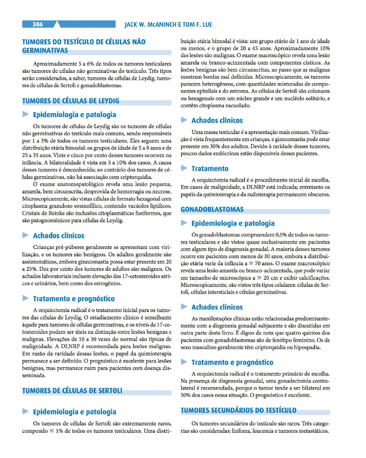 386 JACK W. McANINCH E F. LUE TUMORES DO TESTÍCULO DE CÉLULAS NÃO buição etária bimodal é vista: um grupo etário de 1 ano de idade GERMINATIVAS ou menos, e o grupo de 20 a 45 anos. Aproximadamente 10% das lesões são malignas. o exame macroscópico revela uma lesão Aproximadamente 5 a 6% de todos os tumores testiculares amarela ou branco-acinzentada com componentes císticos. As são tumores de células não germinativas do testículo. Três tipos lesões benignas são bem circunscritas, ao passo que as malignas serão considerados, a saber, tumores de células de Leydig, tumo- mostram bordas mal definidas. Microscopicamente, os tumores res de células de Sertoli e gonadoblastomas. parecem heterogêneos, com quantidades misturadas de compo- nentes epiteliais e do estroma. As células de Sertoli são colunares TUMORES DE CÉLULAS DE LEYDIG ou hexagonais com um núcleo grande e um nucléolo solitário, e contêm citoplasma vacuolado. Epidemiologia e patologia Achados clínicos Os tumores de células de Leydig são os tumores de células não germinativas do testículo mais comuns, sendo responsáveis Uma massa testicular é a apresentação mais comum. Viriliza- por 1 a 3% de todos os tumores testiculares. Eles seguem uma ção é vista frequentemente em crianças, e ginecomastia pode estar distribuição etária bimodal: os grupos de idade de 5 a 9 anos e de presente em 30% dos adultos. Devido à raridade desses tumores, 25 a 35 anos. Vinte e cinco por cento desses tumores ocorrem na poucos dados endócrinos estão disponíveis desses pacientes. infância. A bilateralidade é vista em 5 a 10% dos casos. A causa desses tumores é desconhecida; ao contrário dos tumores de cé- Tratamento lulas germinativas, não há associação com criptorquidia. A orquiectomia radical é o procedimento inicial de escolha. o exame anatomopatológico revela uma lesão pequena, Em casos de malignidade, a DLNRP está indicada; entretanto os amarela, bem circunscrita, desprovida de hemorragia ou necrose. papéis da quimioterapia e da radioterapia permanecem obscuros. Microscopicamente, são vistas células de formato hexagonal com citoplasma granuloso eosinofílico, contendo vacúolos lipídicos. Cristais de Reinke são inclusões citoplasmáticas fusiformes, que são patognomônicos para células de Leydig. Epidemiologia e patologia Achados clínicos Os gonadoblastomas compreendem 0,5% de todos os tumo- res testiculares e são vistos quase exclusivamente em pacientes Crianças pré-púberes geralmente se apresentam com viri- com algum tipo de disgenesia gonadal. A maioria desses tumores lização, e os tumores são benignos. Os adultos geralmente são ocorre em pacientes com menos de 30 anos, embora a distribui- assintomáticos, embora ginecomastia possa estar presente em 20 ção etária varie da infância a ≥ 70 anos. exame macroscópico a 25%. Dez por cento dos tumores de adultos são malignos. Os revela uma lesão amarela ou branco-acinzentada, que pode variar achados laboratoriais incluem elevação dos 17-cetosteroides séri- em tamanho de microscópica a ≥ 20 cm e exibir calcificações. cos e urinários, bem como dos estrogênios. Microscopicamente, são vistos três tipos celulares: células de Ser- toli, células intersticiais e células germinativas. Tratamento e prognóstico Achados clínicos A orquiectomia radical é o tratamento inicial para os tumo- res das células de Leydig. estadiamento clínico é semelhante As manifestações clínicas estão relacionadas predominante- àquele para tumores de células germinativas, e os níveis de 17-ce- mente com a disgenesia gonadal subjacente e são discutidas em tosteroides podem ser úteis na distinção entre lesões benignas e outra parte deste livro. É digno de nota que quatro quintos dos malignas. Elevações de 10 a 30 vezes do normal são típicas de pacientes com gonadoblastomas são de fenótipo feminino. Os de malignidade. A DLNRP é recomendada para lesões malignas. sexo masculino geralmente têm criptorquidia ou hipospadia. Em razão da raridade dessas lesões, o papel da quimioterapia permanece a ser definido. prognóstico é excelente para lesões Tratamento e prognóstico benignas, mas permanece ruim para pacientes com doença dis- seminada. A orquiectomia radical é o tratamento primário de escolha. Na presença de disgenesia gonadal, uma gonadectomia contra- TUMORES DE CÉLULAS DE SERTOLI lateral é recomendada, porque o tumor tende a ser bilateral em 50% dos casos nessa situação. prognóstico é excelente. Epidemiologia e patologia TUMORES SECUNDÁRIOS DO TESTÍCULO Os tumores de células de Sertoli são extremamente raros, Os tumores secundários do testículo são raros. Três catego- compondo ≤ 1% de todos os tumores testiculares. Uma distri- rias são consideradas: linfoma, leucemia e tumores metastáticos.TUMORES GENITAIS CAPÍTULO 24 387 LINFOMA tumores de células germinativas. o debate continua sobre se es- sas lesões se originam de neoplasias primárias do testículo que Epidemiologia e patologia "apagaram", ou se originaram de novo. A maioria dos tumores retroperitoneais tem sua origem a partir de um tumor primário o linfoma é o tumor testicular mais comum em um paciente testicular, ao passo que os tumores de células germinativas do com mais de 50 anos e é a neoplasia secundária do testículo mais mediastino são verdadeiramente ectópicos. comum, sendo responsável por 5% de todos os tumores testiculares. Os locais de origem mais comuns em ordem decrescente são Ele pode ser visto em três situações clínicas: (1) manifestação tardia mediastino, retroperitônio, área sacrococcígea e glândula pineal. de linfoma disseminado; (2) apresentação inicial de doença clini- Todos os tipos de células germinativas podem ser observados. camente oculta; e (3) doença primária extraganglionar. o exame seminoma compõe mais da metade dos tumores retroperitoneais macroscópico revela uma lesão abaula