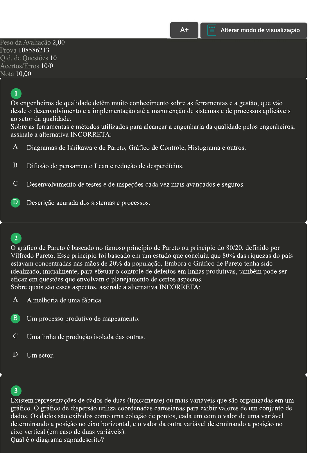 A+ Alterar modo de visualização Peso da Avaliação 2,00 Prova 108586213 Qtd. de Questões 10 Acertos/Erros 10/0 Nota 10,00 1 Os engenheiros de qualidade detêm muito conhecimento sobre as ferramentas e a gestão, que vão desde o desenvolvimento e a implementação até a manutenção de sistemas e de processos aplicáveis ao setor da qualidade. Sobre as ferramentas e métodos utilizados para alcançar a engenharia da qualidade pelos engenheiros, assinale a alternativa INCORRETA: A Diagramas de Ishikawa e de Pareto, Gráfico de Controle, Histograma e outros. Difusão do pensamento Lean e redução de desperdícios. Desenvolvimento de testes e de inspeções cada vez mais avançados e seguros. D Descrição acurada dos sistemas e processos. 2 gráfico de Pareto é baseado no famoso princípio de Pareto ou princípio do 80/20, definido por Vilfredo Pareto. Esse princípio foi baseado em um estudo que concluiu que 80% das riquezas do país estavam concentradas nas mãos de 20% da população. Embora o Gráfico de Pareto tenha sido idealizado, inicialmente, para efetuar o controle de defeitos em linhas produtivas, também pode ser eficaz em questões que envolvam o planejamento de certos aspectos. Sobre quais são esses aspectos, assinale a alternativa INCORRETA: A A melhoria de uma fábrica. B Um processo produtivo de mapeamento. Uma linha de produção isolada das outras. D Um setor. 3 Existem representações de dados de duas (tipicamente) ou mais variáveis que são organizadas em um gráfico. gráfico de dispersão utiliza coordenadas cartesianas para exibir valores de um conjunto de dados. Os dados são exibidos como uma coleção de pontos, cada um com o valor de uma variável determinando a posição no eixo horizontal, e o valor da outra variável determinando a posição no eixo vertical (em caso de duas variáveis). Qual é o diagrama supradescrito?A Gráficos de dispersão e dispersão para Shikamura. B Diagramas de dispersão e histograma de representação. Diagramas de dispersão ou gráficos de dispersão. D Diagramas de dispersão ou gráficos analíticos. 4 Para se construir um gráfico de Histograma, utiliza-se de um gráfico de barras, porém, antes, é necessário que se agrupem os dados de maneira ordenada, contendo as três partes a seguir: classe, amplitude e frequência. Imagine que se deseja criar um Histograma para mostrar a distribuição das alturas de todos os alunos do último ano do ensino médio de uma escola específica. As alturas dos alunos serão agrupadas em intervalos de 2 cm. Inicia-se em 1,50 m: a primeira classe de intervalos seria de 1,50 m fechado até 1,52 m aberto. Como esse intervalo de dois centímetros é chamado? A Frequência. Classe. Média. D Amplitude. 5 Diagrama de Ishikawa também conhecido como diagrama de causa e efeito é um método gráfico que ajuda a gerenciar e fazer o controle da qualidade em diferentes processos, cujo principal objetivo é identificar quais são as causas para um efeito, que pode ser um problema, por exemplo. Essa ferramenta serve para que os responsáveis pela melhoria de um processo industrial consigam visualizar melhor o efeito e as possíveis causas relacionadas com um problema estudado. Possibilita, também, estruturar de uma forma hierárquica as causas em potencial, bem como as oportunidades de melhoria. Sobre o exposto, analise as afirmativas a seguir: I- Para o desenvolvimento da estrutura inicial do Diagrama de Ishikawa, pode ser aplicado o método 6 Ms, isto é, são classificadas em categorias referentes às causas que geram um efeito. II- Os elementos que constituem o Diagrama de Ishikawa são efeito, causas, plano de ações e priorização das ações de melhoria. III- método 6 Ms, como o nome indica, é composto por seis categorias: método, matéria-prima, mão de obra, máquina, medida e meio ambiente. IV- Um dos benefícios do Diagrama de Ishikawa é que ele possibilita que seja efetivado e guardado um registro visual de toda a análise do efeito de um evento avaliado. Assinale a alternativa CORRETA: A As afirmativas I, III e IV estão corretas. As afirmativas I e II estão corretas. As afirmativas II e IV estão corretas. D As afirmativas II e III estão corretas.6 A engenharia da qualidade engloba muitos métodos e técnicas para garantir que a entrega feita ao cliente esteja de acordo com o que ele espera receber, ou seja, que os bens e/ou serviços atendam aos requisitos e às expectativas do cliente. Sobre métodos e técnicas utilizadas na engenharia de qualidade, assinale a alternativa INCORRETA: A Programas de melhoria contínua. B Controle Estatístico da Qualidade, também conhecido como CEP. Desenvolvimento e aplicação de sistemas de gerenciamento de processos. D Criação, aplicação e monitoramento de um Sistema de Gestão da Qualidade. 7 Uma ferramenta útil para identificar pontos de melhoria e definir planos de ação, além de demonstrar a ordem de prioridades que um gestor deve utilizar para resolver as causas, é chamado de Diagrama de Pareto, que apresenta um conceito, na maioria das vezes, padrão. Qual é esse conceito? A 90% das consequências são resultado de 10% das causas. 50% das consequências são resultado de 50% das causas. 80% das consequências são resultado de 20% das causas. D 60% das consequências são resultado de 40% das causas. 8 Lean é uma filosofia que complementa a ideia de qualidade quando inclui o pensamento enxuto como principal diretriz. Lean Manufacturing é uma filosofia de gestão criada na Toyota por volta da década de 1950, que visa à melhoria contínua através de certos meios. Sobre quais são esses meios, assinale a alternativa INCORRETA: A Aumento da produtividade. B Redução de desperdícios. Aumento da qualidade. D Redução de insumos.9 Fluxogramas são ferramentas gráficas que podem ser utilizadas para descrever processos e procedimentos, e especialmente útil na elaboração de procedimentos operacionais e painéis dis