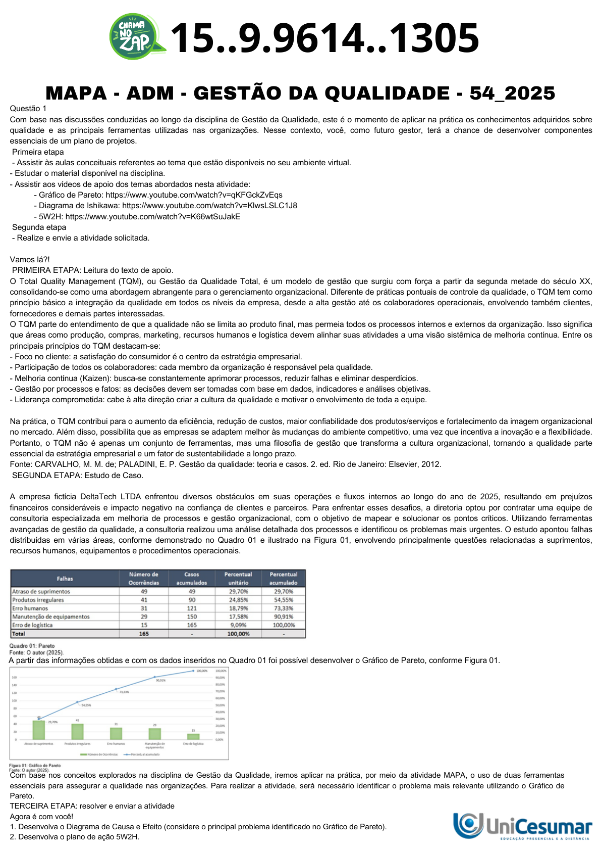 Questão 1 Com base nas discussões conduzidas ao longo da disciplina de Gestão da Qualidade, este é o momento de aplicar na prática os conhecimentos adquiridos sobre qualidade e as principais ferramentas utilizadas nas organizações. Nesse contexto, você, como futuro gestor, terá a chance de desenvolver componentes essenciais de um plano de projetos. Primeira etapa - Assistir às aulas conceituais referentes ao tema que estão disponíveis no seu ambiente virtual. - Estudar o material disponível na disciplina. - Assistir aos vídeos de apoio dos temas abordados nesta atividade: - Gráfico de Pareto: https://www.youtube.com/watch?v=qKFGckZvEqs - Diagrama de Ishikawa: https://www.youtube.com/watch?v=KlwsLSLC1J8 - 5W2H: https://www.youtube.com/watch?v=K66wtSuJakE Segunda etapa - Realize e envie a atividade solicitada. Vamos lá?! PRIMEIRA ETAPA: Leitura do texto de apoio. O Total Quality Management (TQM), ou Gestão da Qualidade Total, é um modelo de gestão que surgiu com força a partir da segunda metade do século XX, consolidando-se como uma abordagem abrangente para o gerenciamento organizacional. Diferente de práticas pontuais de controle da qualidade, o TQM tem como princípio básico a integração da qualidade em todos os níveis da empresa, desde a alta gestão até os colaboradores operacionais, envolvendo também clientes, fornecedores e demais partes interessadas. O TQM parte do entendimento de que a qualidade não se limita ao produto final, mas permeia todos os processos internos e externos da organização. Isso significa que áreas como produção, compras, marketing, recursos humanos e logística devem alinhar suas atividades a uma visão sistêmica de melhoria contínua. Entre os principais princípios do TQM destacam-se: - Foco no cliente: a satisfação do consumidor é o centro da estratégia empresarial. - Participação de todos os colaboradores: cada membro da organização é responsável pela qualidade. - Melhoria contínua (Kaizen): busca-se constantemente aprimorar processos, reduzir falhas e eliminar desperdícios. - Gestão por processos e fatos: as decisões devem ser tomadas com base em dados, indicadores e análises objetivas. - Liderança comprometida: cabe à alta direção criar a cultura da qualidade e motivar o envolvimento de toda a equipe. Na prática, o TQM contribui para o aumento da eficiência, redução de custos, maior confiabilidade dos produtos/serviços e fortalecimento da imagem organizacional no mercado. Além disso, possibilita que as empresas se adaptem melhor às mudanças do ambiente competitivo, uma vez que incentiva a inovação e a flexibilidade. Portanto, o TQM não é apenas um conjunto de ferramentas, mas uma filosofia de gestão que transforma a cultura organizacional, tornando a qualidade parte essencial da estratégia empresarial e um fator de sustentabilidade a longo prazo. Fonte: CARVALHO, M. M. de; PALADINI, E. P. Gestão da qualidade: teoria e casos. 2. ed. Rio de Janeiro: Elsevier, 2012. SEGUNDA ETAPA: Estudo de Caso. A empresa fictícia DeltaTech LTDA enfrentou diversos obstáculos em suas operações e fluxos internos ao longo do ano de 2025, resultando em prejuízos financeiros consideráveis e impacto negativo na confiança de clientes e parceiros. Para enfrentar esses desafios, a diretoria optou por contratar uma equipe de consultoria especializada em melhoria de processos e gestão organizacional, com o objetivo de mapear e solucionar os pontos críticos. Utilizando ferramentas avançadas de gestão da qualidade, a consultoria realizou uma análise detalhada dos processos e identificou os problemas mais urgentes. O estudo apontou falhas distribuídas em várias áreas, conforme demonstrado no Quadro 01 e ilustrado na Figura 01, envolvendo principalmente questões relacionadas a suprimentos, recursos humanos, equipamentos e procedimentos operacionais. 15..9.9614..1305 MAPA - ADM - GESTÃO DA QUALIDADE - 54_2025 A partir das informações obtidas e com os dados inseridos no Quadro 01 foi possível desenvolver o Gráfico de Pareto, conforme Figura 01. Com base nos conceitos explorados na disciplina de Gestão da Qualidade, iremos aplicar na prática, por meio da atividade MAPA, o uso de duas ferramentas essenciais para assegurar a qualidade nas organizações. Para realizar a atividade, será necessário identificar o problema mais relevante utilizando o Gráfico de Pareto. TERCEIRA ETAPA: resolver e enviar a atividade Agora é com você! 1. Desenvolva o Diagrama de Causa e Efeito (considere o principal problema identificado no Gráfico de Pareto). 2. Desenvolva o plano de ação 5W2H. https://www.instagram.com/excellenceeducacional/p/DG1XaOaREOS/