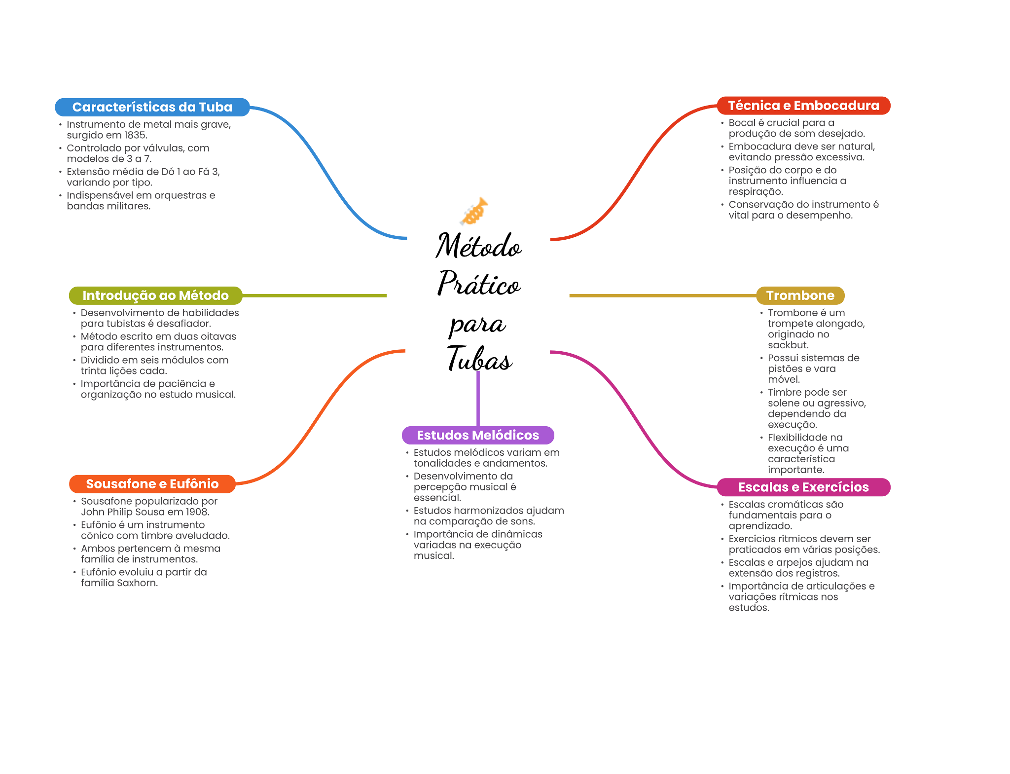 Características da Tuba Técnica e Embocadura de metal Bocal é crucial para a surgido em 1835. produção de som Controlado por válvulas, com Embocadura deve ser natural, modelos de 3 a 7. evitando pressão excessiva. média de 1 ao 3, Posição do corpo do por tipo. influencia a em orquestras respiração. bandas Conservação do instrumento vital para desempenho. Introdução ao Método Trombone Desenvolvimento de habilidades Trombone um para trompete alongado, Método escrito originado no para diferentes instrumentos. sackbut. Dividido em sels módulos com Possul sistemas de trinta lições cada. pistões . vara Importância de paciência organização no estudo musical. Timbre pode ser ou agressivo, dependendo da Estudos Melódicos na Estudos variam em execução uma tonalidades andomentos. importante. Sousafone e Eufônio musical Escalas e Exercícios Sousafone popularizado por essencial. Escalas cromáticas são John Sousa em 1908. Estudos harmonizados ajudam Eufônio um na comparação de fundamentale para aprendizado. com timbre aveludado. de dinâmicas Exercícios ser Ambos pertencem à na execução musical. praticados em posições. de instrumentos. e arpejos ajudam na Eufônio evolulu a partir da extensão dos registros. família Importância de articulações nos estudos.