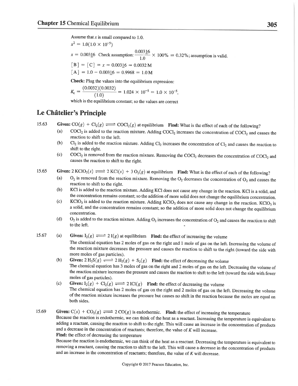 Chapter 15 Chemical Equilibrium 305 Assume that x is small compared to 1.0. = 0.00316 x = 0.00316 Check assumption: 1.0 X 100% = 0.32%; assumption is valid. [B] = = x = 0.00316 = 0.0032 [A] = 1.0 - 0.00316 = 0.9968 = 1.0 M Check: Plug the values into the equilibrium expression: Kc = (0.0032)(0.0032) (1.0) = 1.024 10⁻⁵ = 1.0 10⁻⁵, which is the equilibrium constant; so the values are correct Le Châtelier's Principle 15.63 Given: + at equilibrium Find: What is the effect of each of the following? (a) COCl₂ is added to the reaction mixture. Adding COCl₂ increases the concentration of COCl₂ and causes the reaction to shift to the left. (b) Cl₂ is added to the reaction mixture. Adding Cl₂ increases the concentration of Cl₂ and causes the reaction to shift to the right. (c) COCl₂ is removed from the reaction mixture. Removing the COCl₂ decreases the concentration of COCl₂ and causes the reaction to shift to the right. 15.65 Given: 2 2 KCl(s) + at equilibrium Find: What is the effect of each of the following? (a) O₂ is removed from the reaction mixture. Removing the O₂ decreases the concentration of O₂ and causes the reaction to shift to the right. (b) is added to the reaction mixture. Adding does not cause any change in the reaction. KCI is a solid, and the concentration remains constant; so the addition of more solid does not change the equilibrium concentration. (c) KCIO₃ is added to the reaction mixture. Adding KCIO₃ does not cause any change in the reaction. is a solid, and the concentration remains constant; the addition of more solid does not change the equilibrium concentration. (d) O₂ is added to the reaction mixture. Adding O₂ increases the concentration of O₂ and causes the reaction to shift to the left. 15.67 (a) Given: at equilibrium Find: the effect of increasing the volume The chemical equation has 2 moles of gas on the right and 1 mole of gas on the left. Increasing the volume of the reaction mixture decreases the pressure and causes the reaction to shift to the right (toward the side with more moles of gas particles). (b) Given: 2H₂S(g) 2H₂(g) + Find: the effect of decreasing the volume The chemical equation has 3 moles of gas on the right and 2 moles of gas on the left. Decreasing the volume of the reaction mixture increases the pressure and causes the reaction to shift to the left (toward the side with fewer moles of gas particles). (c) Given: + 1L Find: the effect of decreasing the volume The chemical equation has 2 moles of gas on the right and 2 moles of gas on the left. Decreasing the volume of the reaction mixture increases the pressure but causes no shift in the reaction because the moles are equal on both sides. 15.69 Given: C(s) + is endothermic. Find: the effect of increasing the temperature Because the reaction is endothermic, we can think of the heat as a reactant. Increasing the temperature is equivalent to adding a reactant, causing the reaction to shift to the right. This will cause an increase in the concentration of products and a decrease in the concentration of reactants; therefore, the value of K will increase. Find: the effect of decreasing the temperature Because the reaction is endothermic, we can think of the heat as a reactant. Decreasing the temperature is equivalent to removing a reactant, causing the reaction to shift to the left. This will cause a decrease in the concentration of products and an increase in the concentration of reactants; therefore, the value of K will decrease. Copyright © 2017 Pearson Education, Inc.