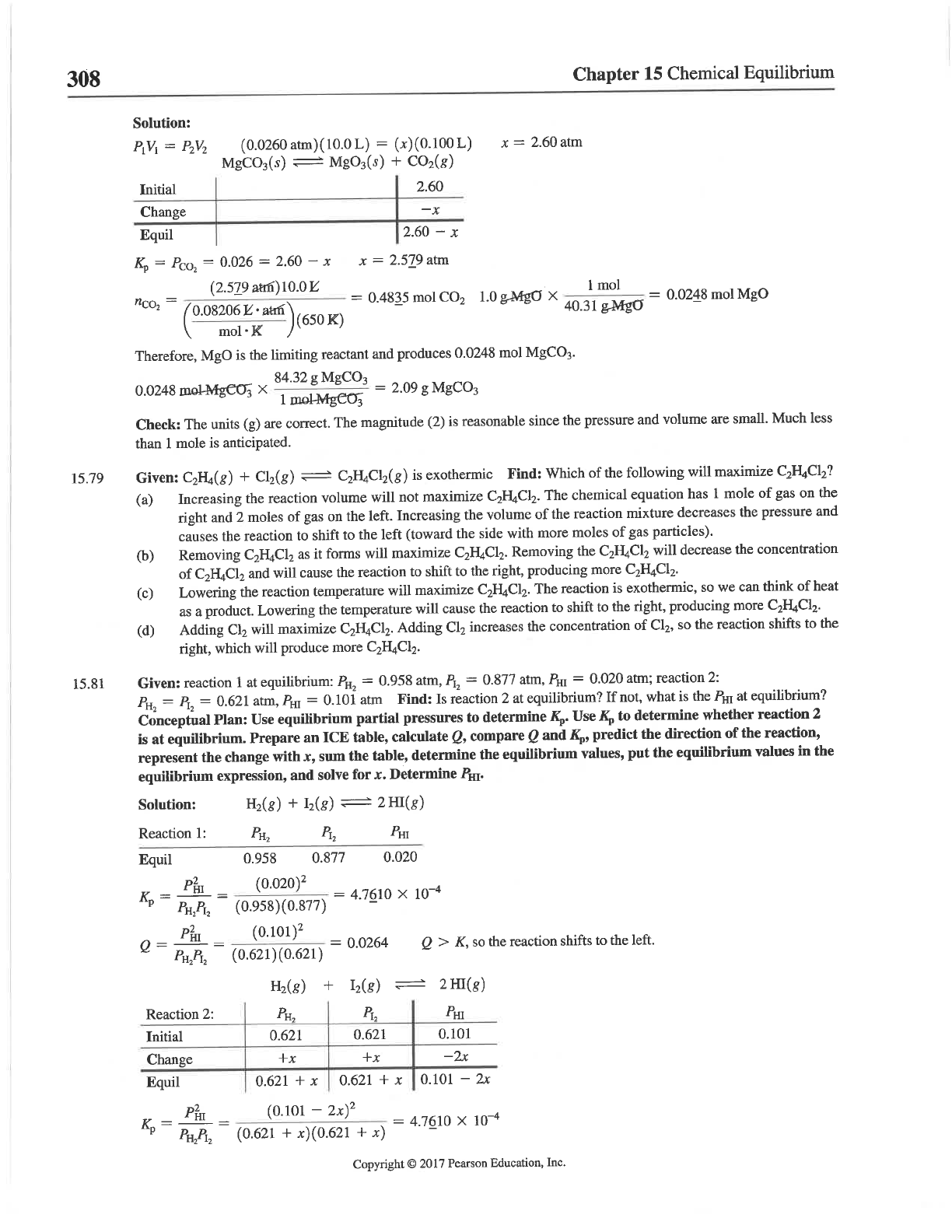 308 Chapter 15 Chemical Equilibrium Solution: P₁V₁ = P₂V₂ (0.0260 (10.0L) = x = 2.60 atm MgCO₃(s) MgO₃(s) + CO₂(g) Initial 2.60 Change -x Equil 2.60 Kₚ = = 0.026 = 2.60 x x = 2.579 atm 1 mol = = 0.4835 mol CO₂ 1.0 X = 0.0248 mol MgO mol K gMgO Therefore, MgO is the limiting reactant and produces 0.0248 mol MgCO₃. 0.0248 1 = 2.09 Check: The units (g) are correct. The magnitude (2) is reasonable since the pressure and volume are small. Much less than 1 mole is anticipated. 15.79 Given: C₂H₄(₈) + is exothermic Find: Which of the following will maximize C₂H₄Cl₂? (a) Increasing the reaction volume will not maximize C₂H₄Cl₂. The chemical equation has 1 mole of gas on the right and 2 moles of gas on the left. Increasing the volume of the reaction mixture decreases the pressure and causes the reaction to shift to the left (toward the side with more moles of gas particles). (b) Removing C₂H₄Cl₂ as it forms will maximize C₂H₄Cl₂. Removing the C₂H₄Cl₂ will decrease the concentration of C₂H₄Cl₂ and will cause the reaction to shift to the right, producing more C₂H₄Cl₂. (c) Lowering the reaction temperature will maximize C₂H₄Cl₂. The reaction is exothermic, so we can think of heat as a product. Lowering the temperature will cause the reaction to shift to the right, producing more C₂H₄Cl₂. (d) Adding Cl₂ will maximize C₂H₄Cl₂. Adding Cl₂ increases the concentration of Cl₂, so the reaction shifts to the right, which will produce more C₂H₄Cl₂. 15.81 Given: reaction 1 at equilibrium: PH₂ = 0.958 atm, = 0.877 atm, PHI = 0.020 atm; reaction 2: PH₂ = = 0.621 atm, PHI = 0.101 atm Find: Is reaction 2 at equilibrium? If not, what is the PHI at equilibrium? Conceptual Plan: Use equilibrium partial pressures to determine Use to determine whether reaction 2 is at equilibrium. Prepare an ICE table, calculate Q, compare Q and Kₚ, predict the direction of the reaction, represent the change with x, sum the table, determine the equilibrium values, put the equilibrium values in the equilibrium expression, and solve for x. Determine Solution: + 2HI(g) Reaction 1: PH₂ PHI Equil 0.958 0.877 0.020 Kₚ = = (0.958)(0.877) = 4.7610 X 10⁻⁴ Q = = 0.0264 Q > K, so the reaction shifts to the left. (0.621)(0.621) + 2HI(g) Reaction 2: PH₂ PHI Initial 0.621 0.621 0.101 Change +x +x Equil 0.621 + 0.101 2x = = (0.621 (0.101 + + = 4.7610 X 10⁻⁴ Copyright © 2017 Pearson Education, Inc.