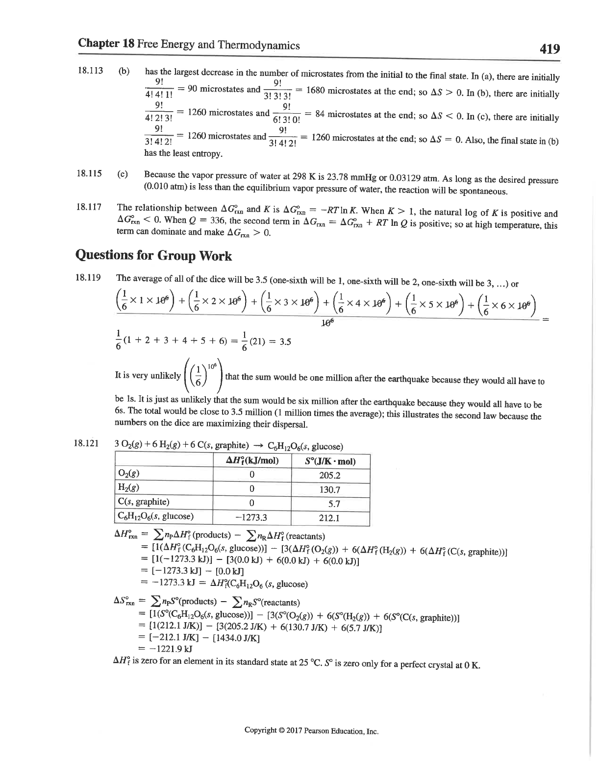 Chapter 18 Free Energy and Thermodynamics 419 18.113 (b) has the largest decrease in the number of microstates from the initial to the final state. In (a), there are initially = 90 microstates and 9! = 1680 microstates at the end; so > 0. In (b), there are initially 9! 9! = 1260 microstates and 9! = 84 microstates at the end; so AS 1, the natural log of K is positive and When Q = 336, the second term in = + RT In Q is positive; so at high temperature, this term can dominate and make Questions for Group Work 18.119 The average of all of the dice will be 3.5 (one-sixth will be 1, one-sixth will be 2, one-sixth will be 3, ...) or + + + + + = It is very unlikely that the sum would be one million after the earthquake because they would all have to be It is just as unlikely that the sum would be six million after the earthquake because they would all have to be 6s. The total would be close to 3.5 million (1 million times the average); this illustrates the second law because the numbers on the dice are maximizing their dispersal. 18.121 3 + 6 H₂(g) + 6 C(s, graphite) glucose) S°(J/K mol) 0 205.2 H₂(g) 0 130.7 C(s, graphite) 0 5.7 C₆H₁₂O₆(s, glucose) -1273.3 212.1 = (products) (reactants) = glucose))] + (H₂(g)) + (C(s, graphite))] = - + 6(0.0 kJ) + = [-1273.3 kJ] = 1273.3 kJ = (s, glucose) = - = glucose))] - + 6(S°(H₂(g)) + graphite))] = [1(212.1 J/K)] - [3(205.2 J/K) + 6(130.7 J/K) + 6(5.7 J/K)] = [-212.1 - [1434.0 J/K] = -1221.9 kJ is zero for an element in its standard state at 25 °C.S° is zero only for a perfect crystal at 0 K. Copyright © 2017 Pearson Education, Inc.