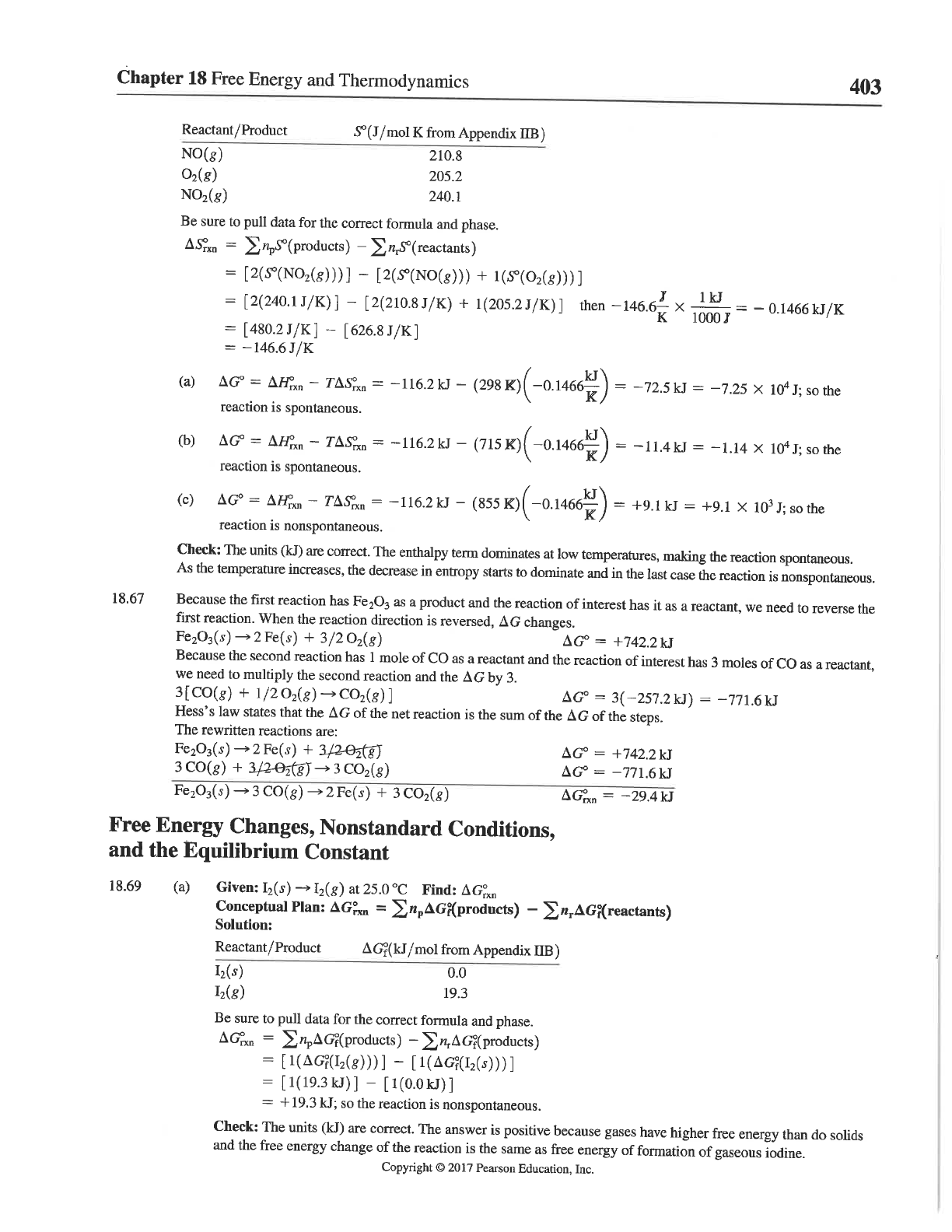 Chapter 18 Free Energy and Thermodynamics 403 Reactant/Product K from Appendix IIB) 210.8 205.2 NO₂(₈) 240.1 Be sure to pull data for the correct formula and phase. = - = - + = [2(240.1J/K)] - [2(210.8J/K) + then = [480.2J/K] [626.8J/K] = -146.6J/K (a) = - = 116.2kJ = -72.5kJ = -7.25 X 10⁴ J; so the reaction is spontaneous. (b) = = -116.2kJ = -11.4kJ = 1.14 X 10⁴ J; so the reaction is spontaneous. (c) = = 116.2kJ = +9.1kJ = +9.1 X 10³ J; so the reaction is nonspontaneous. Check: The units (kJ) are correct. The enthalpy term dominates at low temperatures, making the reaction spontaneous. As the temperature increases, the decrease in entropy starts to dominate and in the last case the reaction is nonspontaneous. 18.67 Because the first reaction has Fe₂O₃ as a product and the reaction of interest has it as a reactant, we need to reverse the first reaction. When the reaction direction is reversed, AG changes. Fe₂O₃(s) 2Fe(s) + = +742.2kJ Because the second reaction has 1 mole of CO as a reactant and the reaction of interest has 3 moles of CO as a reactant, we need to multiply the second reaction and the AG by 3. + = 3(-257.2kJ) = -771.6kJ Hess's law states that the AG of the net reaction is the sum of the of the steps. The rewritten reactions are: Fe₂O₃(s) 2Fe(s) + = +742.2kJ + = -771.6kJ Fe₂O₃(s) 2Fe(s) + = -29.4kJ Free Energy Changes, Nonstandard Conditions, and the Equilibrium Constant 18.69 (a) Given: I₂(s) at 25.0 °C Find: Conceptual Plan: = Solution: Reactant/Product from Appendix IIB) I₂(s) 0.0 19.3 Be sure to pull data for the correct formula and phase. = = - = [1(19.3kJ)] [1(0.0kJ)] = +19.3kJ; the reaction is nonspontaneous. Check: The units (kJ) are correct. The answer is positive because gases have higher free energy than do solids and the free energy change of the reaction is the same as free energy of formation of gaseous iodine. Copyright © 2017 Pearson Education, Inc.
