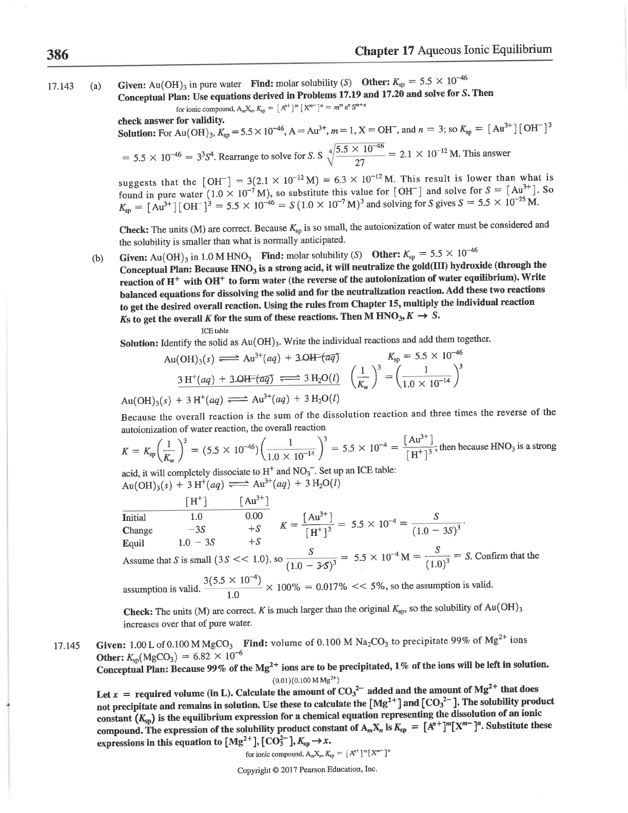 386 Chapter 17 Aqueous Ionic Equilibrium 17.143 (a) Given: Au(OH)₃ in pure water Find: molar solubility (S) Other: = 5.5 X 10⁻⁴⁶ Conceptual Plan: Use equations derived in Problems 17.19 and 17.20 and solve for S. Then for ionic compound, = = check answer for validity. Solution: For Au(OH)₃, = 5.5 10⁻⁴⁶, A = Au³⁺, m = 1,X = and n = 3; so = = 5.5 X 10⁻⁴⁶ = Rearrange to solve for S.S 5.5 27 = 2.1 X 10⁻¹² M. This answer suggests that the = 3(2.1 X 10⁻¹² M) = 6.3 X 10⁻¹² M. This result is lower than what is found in pure water (1.0 X 10⁻⁷ M), so substitute this value for [OH⁻] and solve for S = [Au³⁺]. So Kₛₚ = [Au³⁺] = 5.5 X 10⁻⁴⁶ = S (1.0 10⁻⁷ M)³ and solving for S gives S = 5.5 X 10⁻²⁵ M. Check: The units (M) are correct. Because is so small, the autoionization of water must be considered and the solubility is smaller than what is normally anticipated. (b) Given: Au(OH)₃ in 1.0 M Find: molar solubility (S) Other: = 5.5 X 10⁻⁴⁶ Conceptual Plan: Because is a strong acid, it will neutralize the gold(III) hydroxide (through the reaction of with OH+ to form water (the reverse of the autoionization of water equilibrium). Write balanced equations for dissolving the solid and for the neutralization reaction. Add these two reactions to get the desired overall reaction. Using the rules from Chapter 15, multiply the individual reaction Ks to get the overall K for the sum of these reactions. Then M K S. ICE table Solution: Identify the solid as Au(OH)₃. Write the individual reactions and add them together. Au(OH)₃(s) + 3 + Au(OH)₃(s) + + Because the overall reaction is the sum of the dissolution reaction and three times the reverse of the autoionization of water reaction, the overall reaction K = 3 = (5.5 10⁻⁴⁶) 1 = 5.5 10⁻⁴ = [Au³⁺] [H⁺]³ then because is a strong acid, it will completely dissociate to and Set up an ICE table: Au(OH)₃(s) + Au³⁺(aq) + [H⁺] [Au³⁺] Initial 1.0 0.00 [Au³⁺] S K = = 5.5 X 10⁻⁴ = Change -3S +S (1.0 Equil 1.0 3S Assume that S is small (3S so (1.0 S = 5.5 X 10⁻⁴ M = (1.0)³ S = S. Confirm that the assumption is valid. 1.0 X 100% = 0.017% « 5%, so the assumption is valid. Check: The units (M) are correct. K is much larger than the original the solubility of Au(OH)₃ increases over that of pure water. 17.145 Given: 1.00 L of 0.100 M Find: volume of 0.100 M Na₂CO₃ to precipitate 99% of Mg²⁺ ions Other: = 6.82 10⁻⁶ Conceptual Plan: Because 99% of the Mg²⁺ ions are to be precipitated, 1% of the ions will be left in solution. Let x = required volume (in L). Calculate the amount of added and the amount of Mg²⁺ that does not precipitate and remains in solution. Use these to calculate the [Mg²⁺] and The solubility product constant (Kₛₚ) is the equilibrium expression for a chemical equation representing the dissolution of an ionic compound. The expression of the solubility product constant of is = Substitute these expressions in this equation to [Mg²⁺], x. for ionic compound, = Copyright © 2017 Pearson Education, Inc.